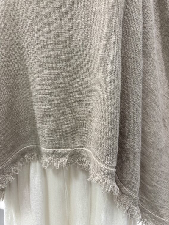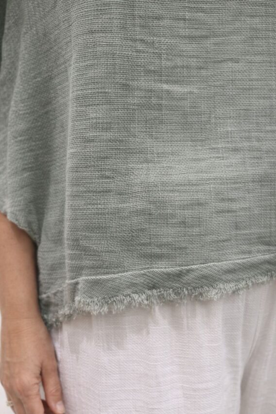 The gently frayed hem adds subtle texture and a touch of artisanal detail, enhancing the top’s relaxed, laid-back appeal.