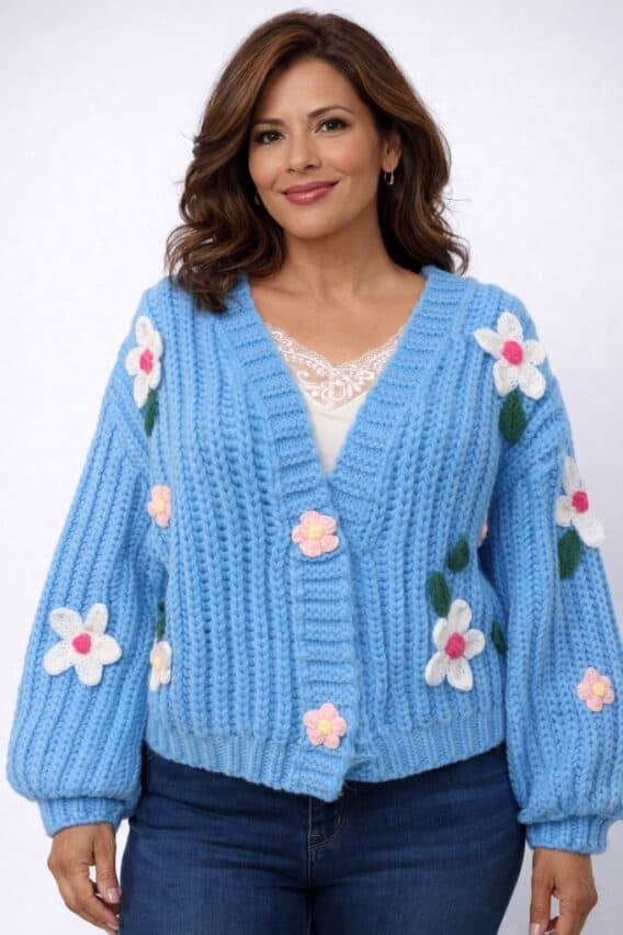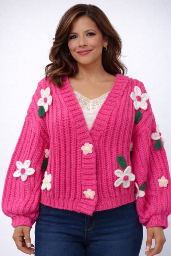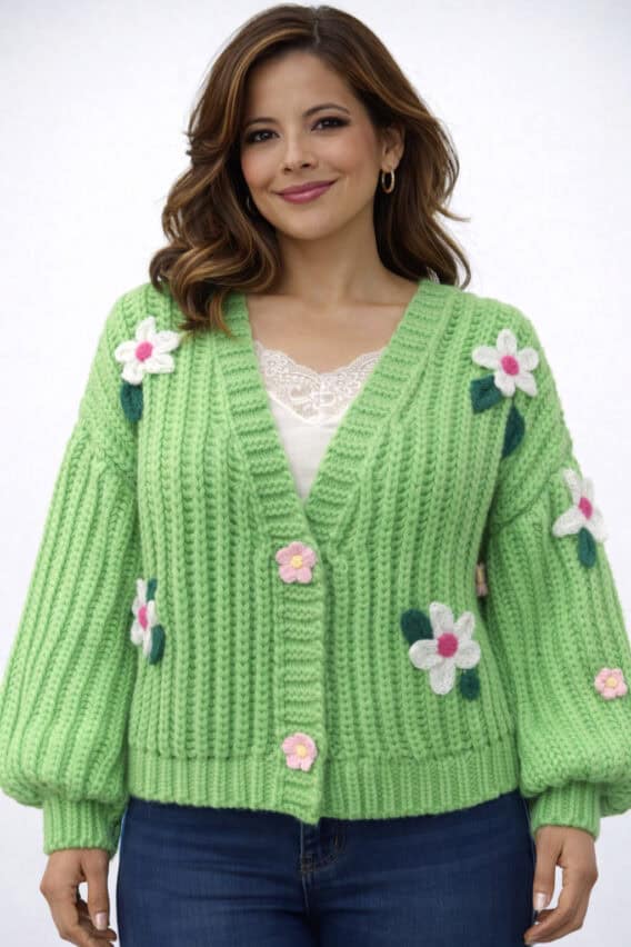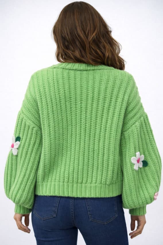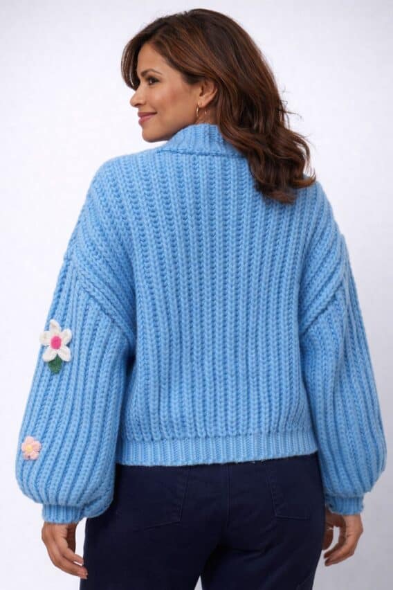 Bold knitted flowers are scattered throughout the textured knit, adding playful dimension and handcrafted charm. Voluminous balloon sleeves create a relaxed silhouette with a touch of drama, while the hook-and-eye closure keeps the front clean and effortless for easy layering.