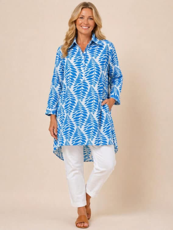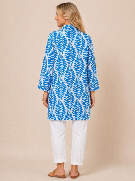 A partial button placket extends about a quarter of the way down the front, offering a casual yet polished finish. The vibrant turquoise print brings a fresh, summery feel, making it perfect for sunny days.