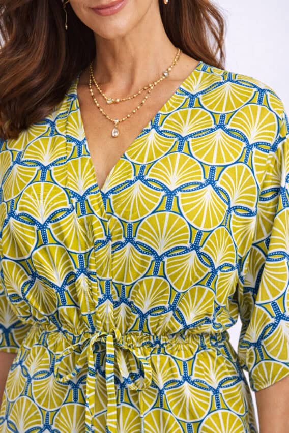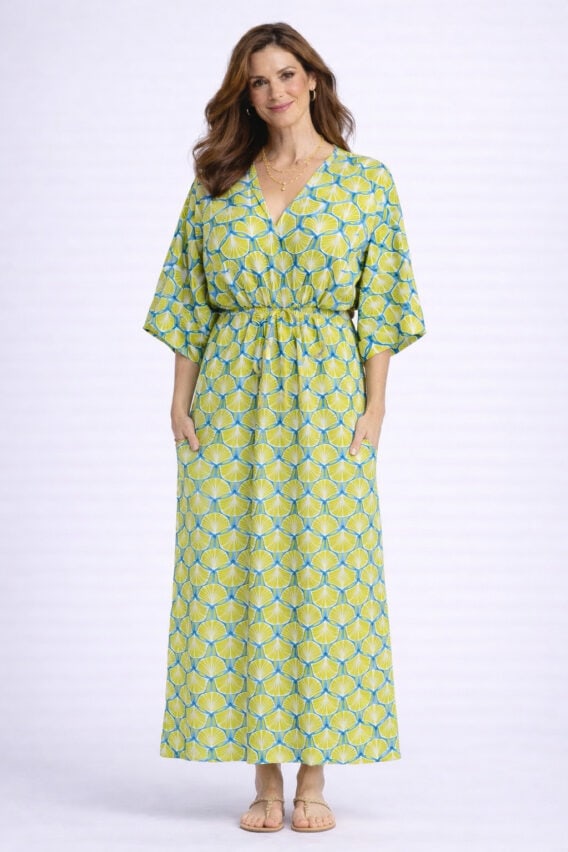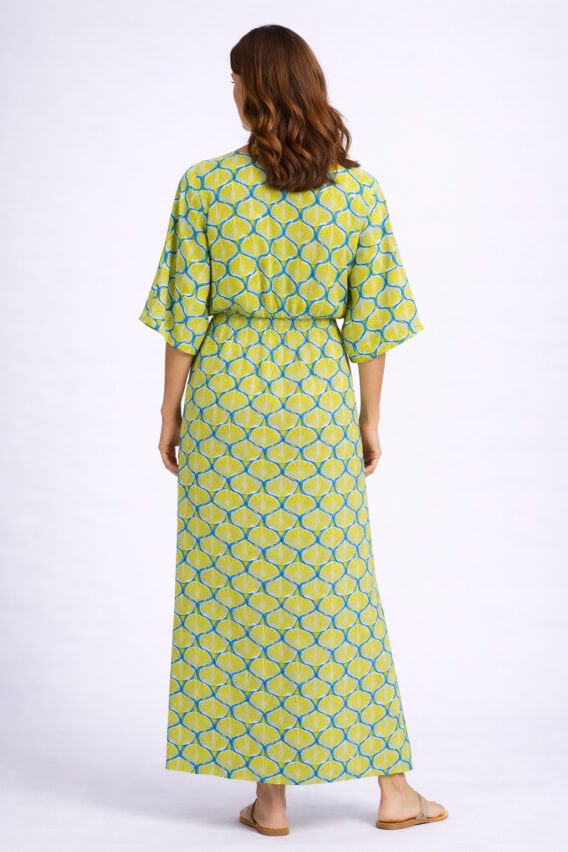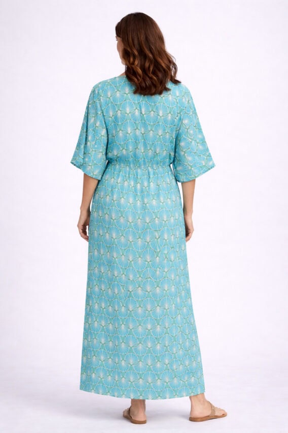 Effortlessly stylish and perfect for warm-weather days, this lightweight cotton maxi kaftan dress features a striking fan-shaped Art Deco print throughout in vibrant, eye-catching tones. Designed with a relaxed silhouette, it offers a flattering V-neckline and flowing kaftan-style sleeves for an easy, breezy feel.