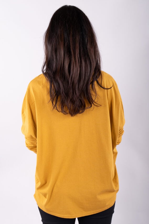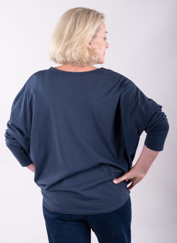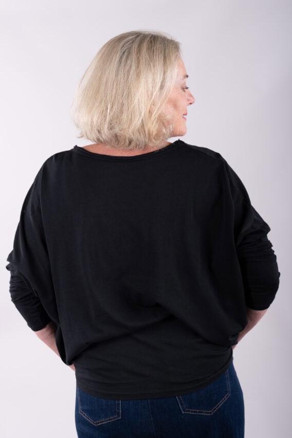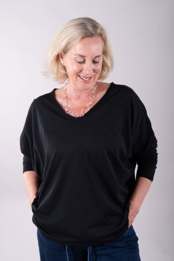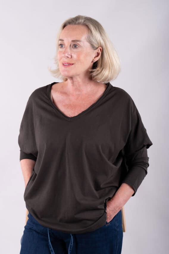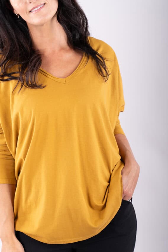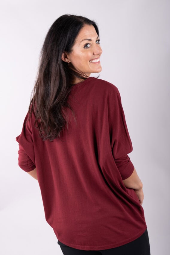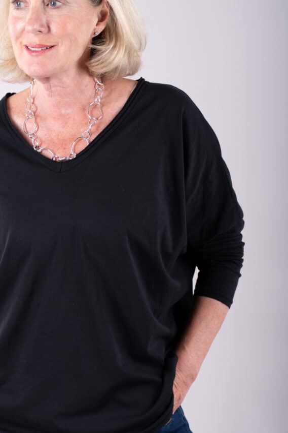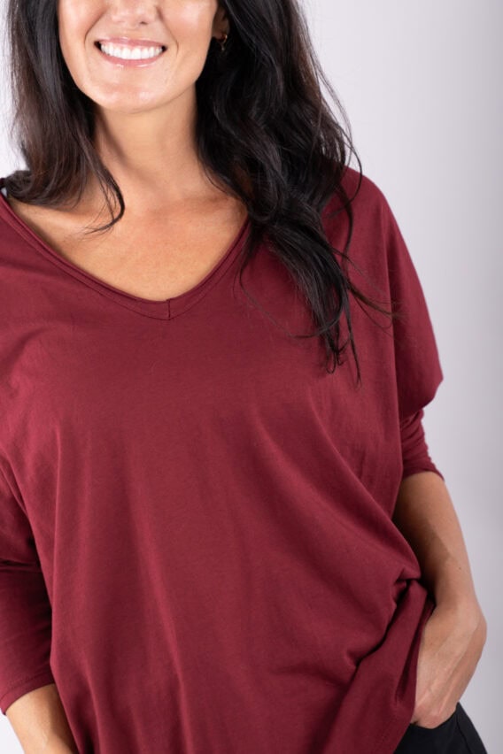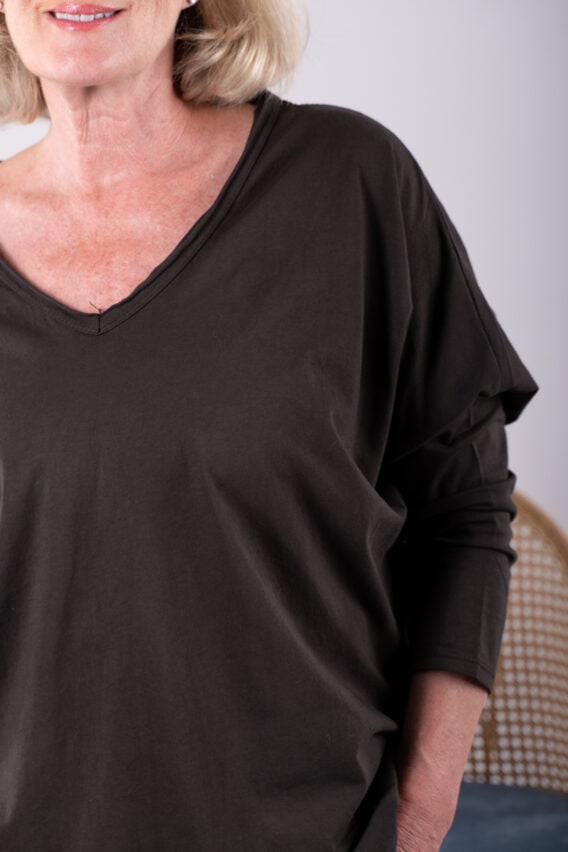 This v-neck top is a versatile and stylish addition to your everyday wardrobe. The full-length sleeves provide added coverage and warmth, while the raw neckline adds a touch of edgy detail. The batwing style creates a relaxed and comfortable fit, perfect for layering under jumpers or wearing on its own. This top is a must-have for effortless and chic everyday outfits.