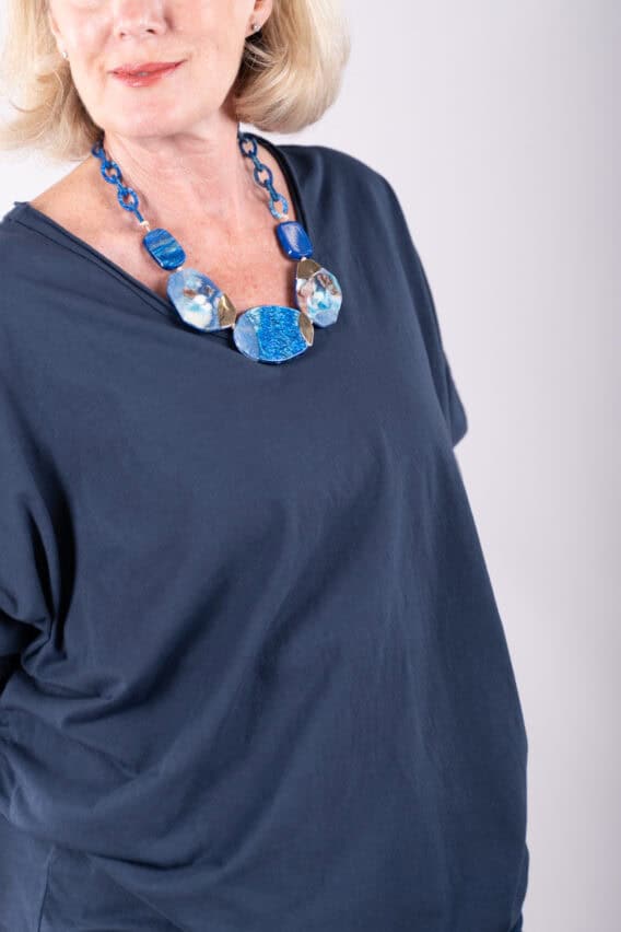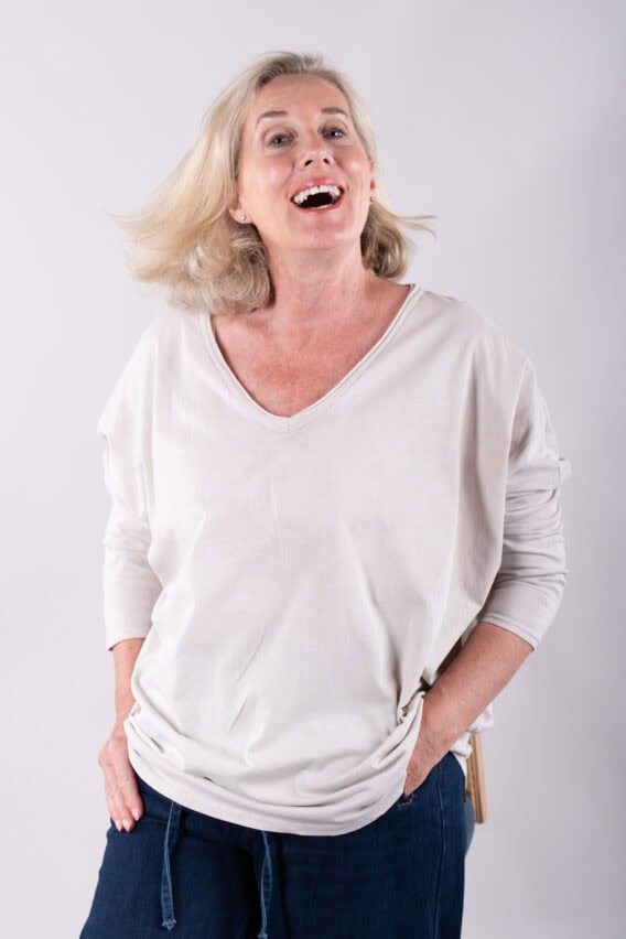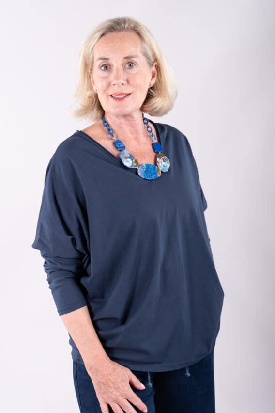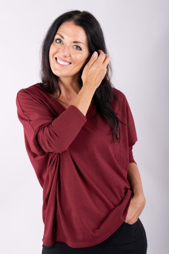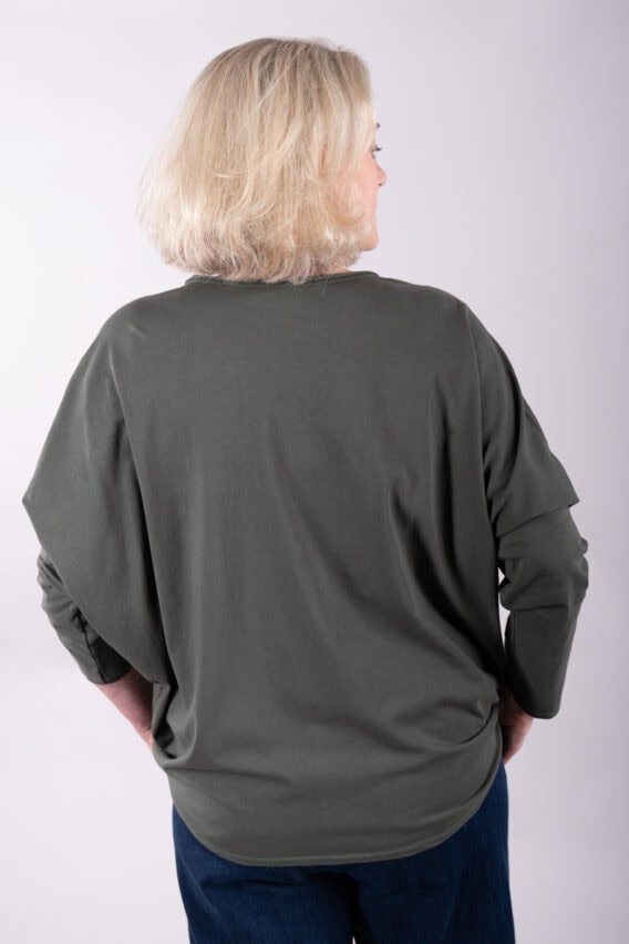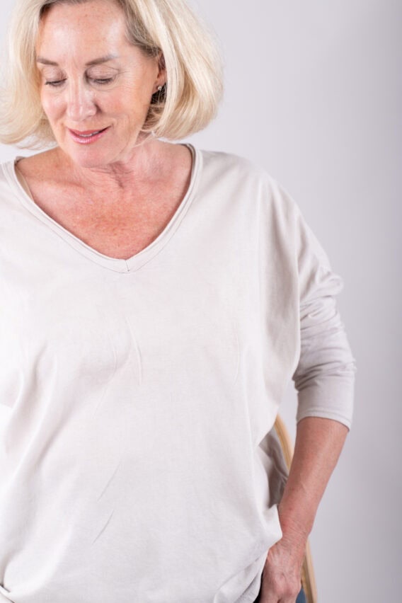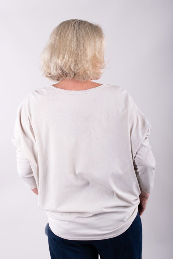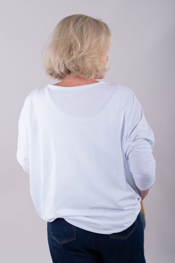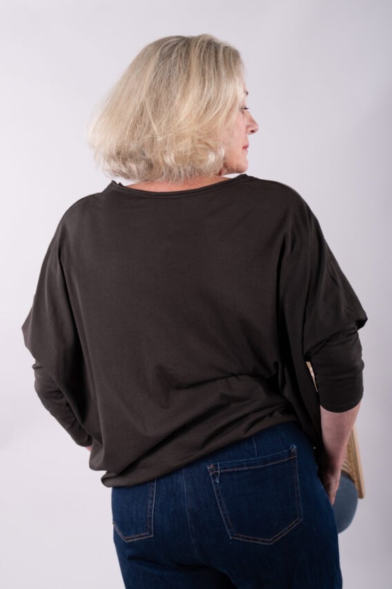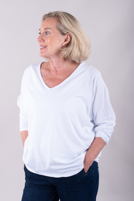 This v-neck top is a versatile and stylish addition to your everyday wardrobe. The full-length sleeves provide added coverage and warmth, while the raw neckline adds a touch of edgy detail. The batwing style creates a relaxed and comfortable fit, perfect for layering under jumpers or wearing on its own. This top is a must-have for effortless and chic everyday outfits.