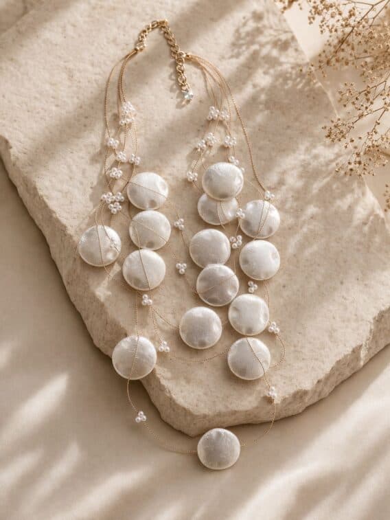 Elevate your look with this eye-catching multi-row statement necklace, designed to add effortless elegance and texture to any outfit. Featuring five delicate rows of twisted wire chain, this piece is adorned with beautifully crafted cream hammered resin discs that catch the light with a soft, luminous finish.