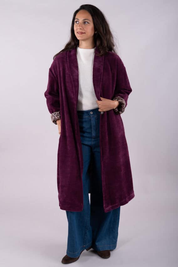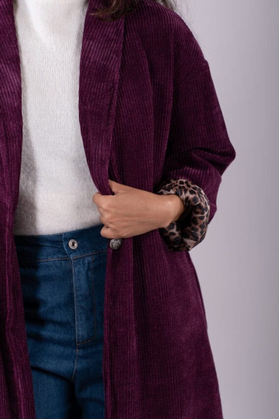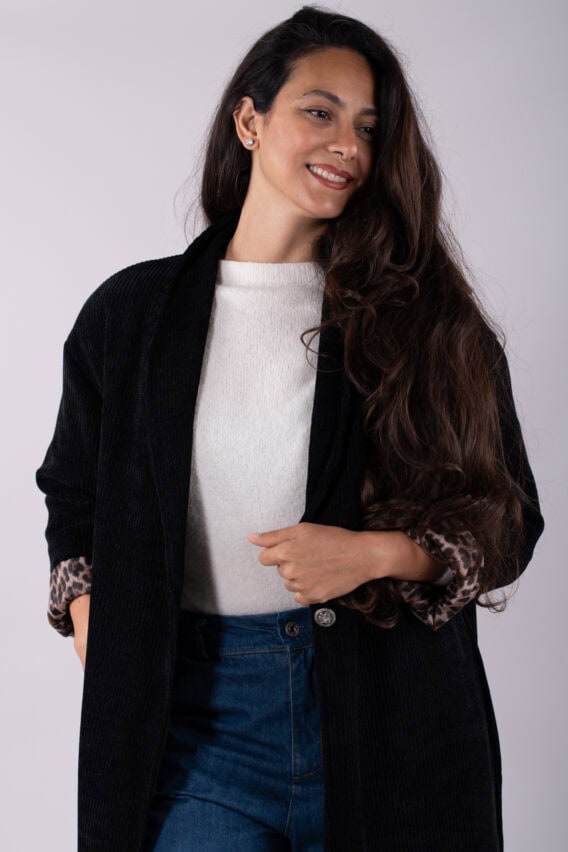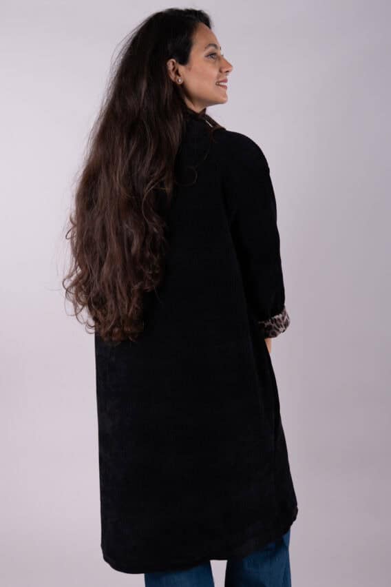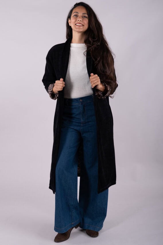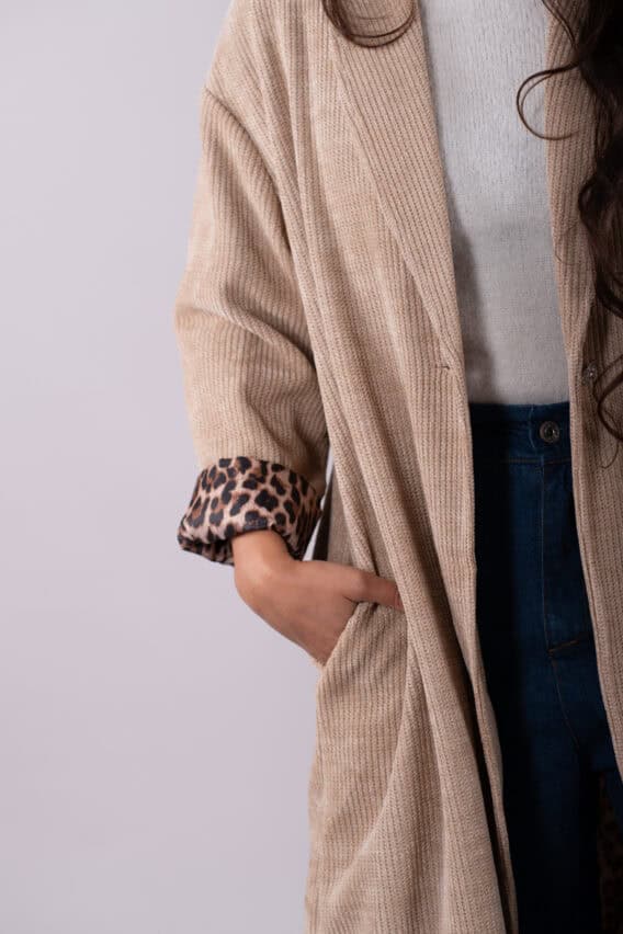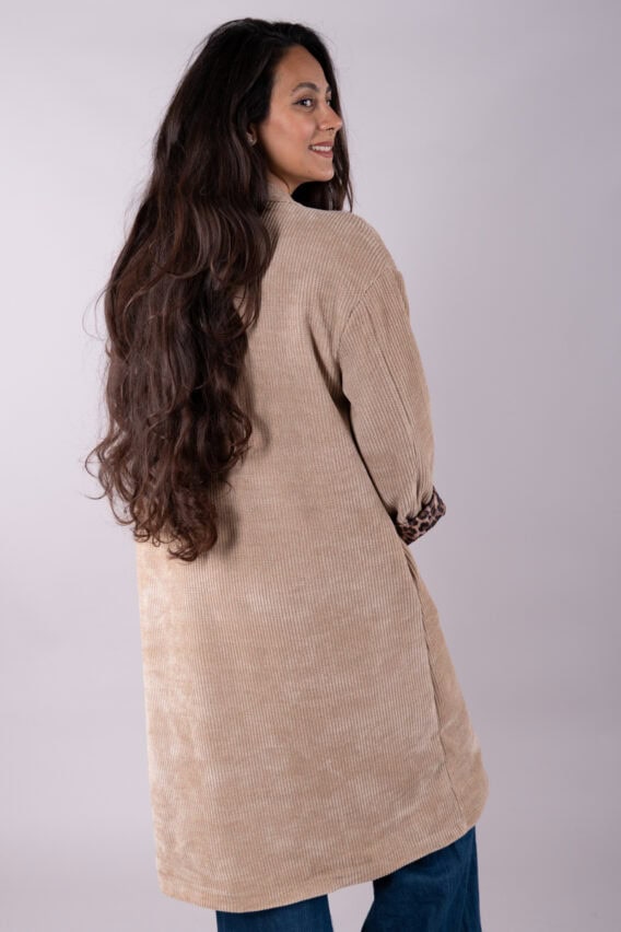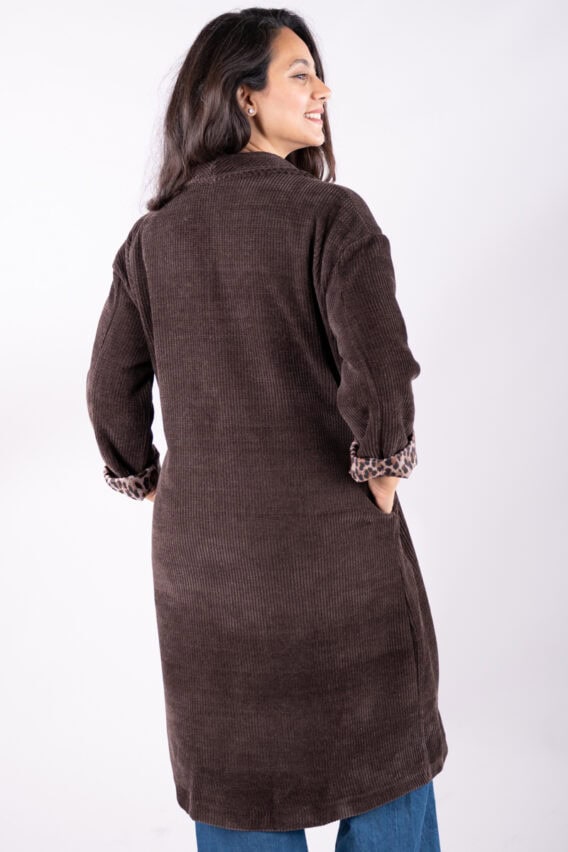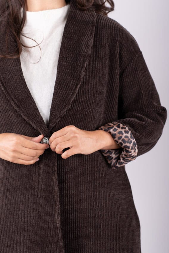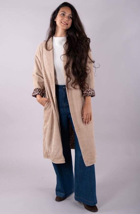 Stay warm and stylish this autumn with our Duster Corduroy Coat. This elegant coat features full-length sleeves and a luxurious leopard print lining for a touch of sophistication. The outer ribbed corduroy fabric adds texture and warmth, while the one-button fastening and two side pockets provide practicality. This gorgeous coat is perfect for the cooler months, offering a chic and versatile option without being too heavy. Add a touch of glamour to your wardrobe with this must-have autumn essential.
