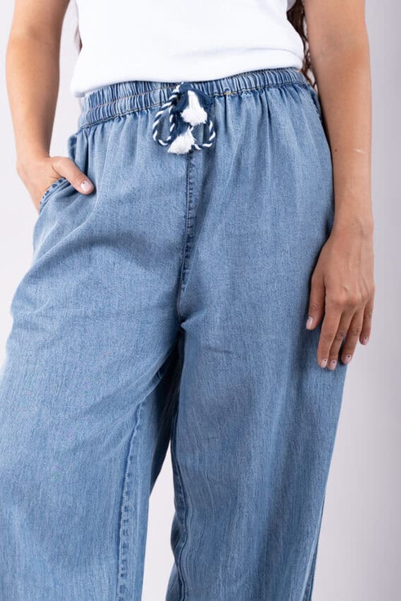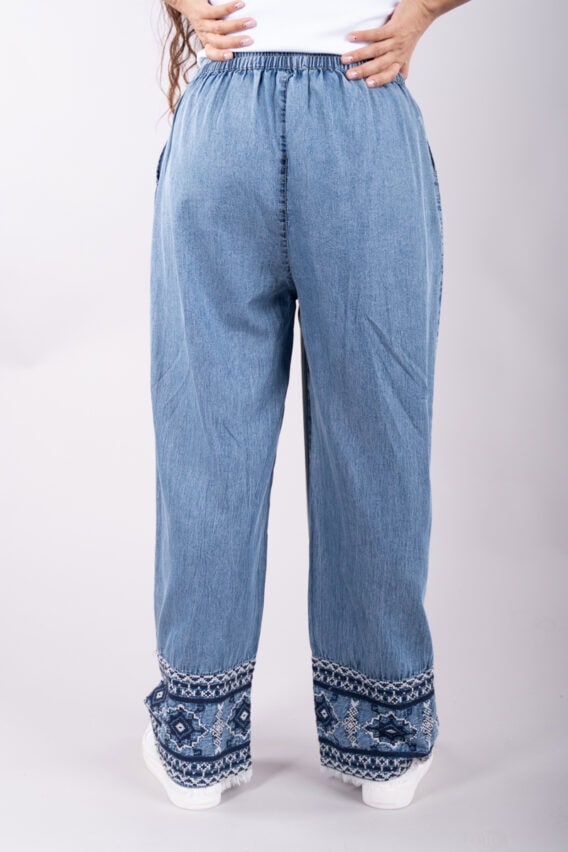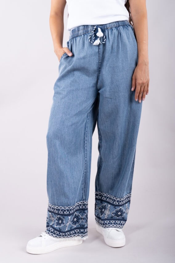 These straight leg full length trousers feature a comfortable elasticated waistband with a twisted navy and white tie tassel drawstring, allowing for an adjustable fit. Made from a washed denim cotton fabric, they have a relaxed silhouette that falls loosely from the waist to your feet. The trousers are embellished with an intricate embroidered design around the cuffs, showcasing a blend of navy and white aztec patterns, along with fringe frayed detailing that adds a stylish touch. They are perfect with white trainers creating a casual and trendy look.