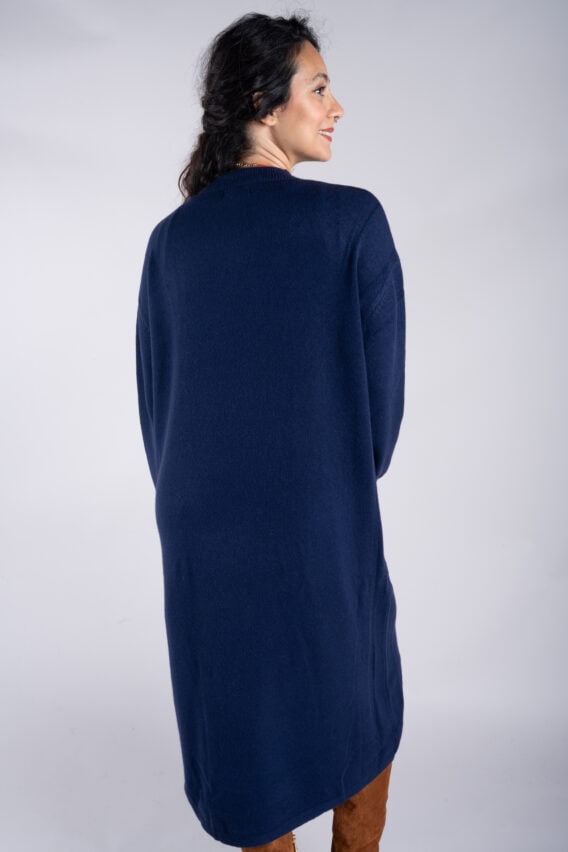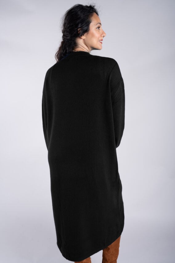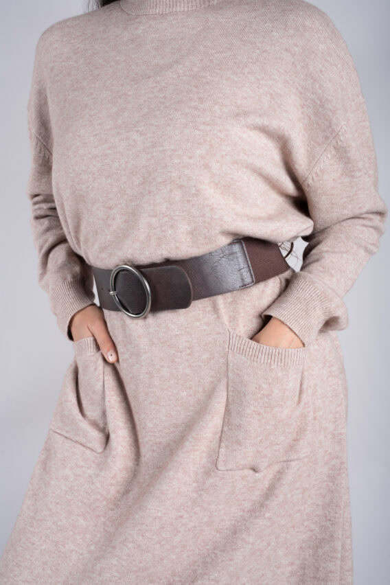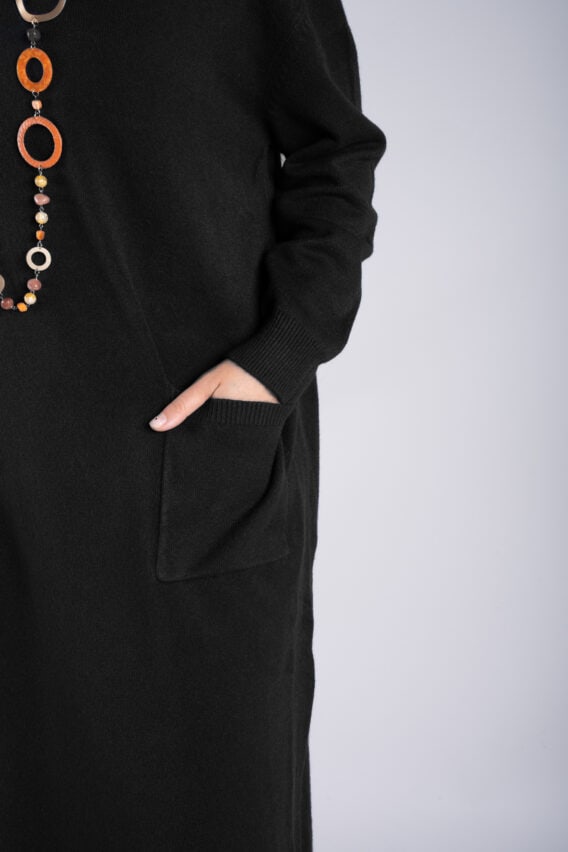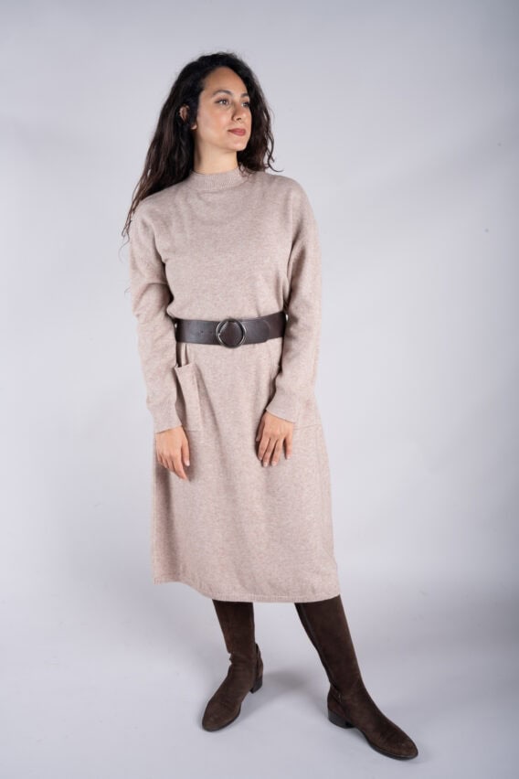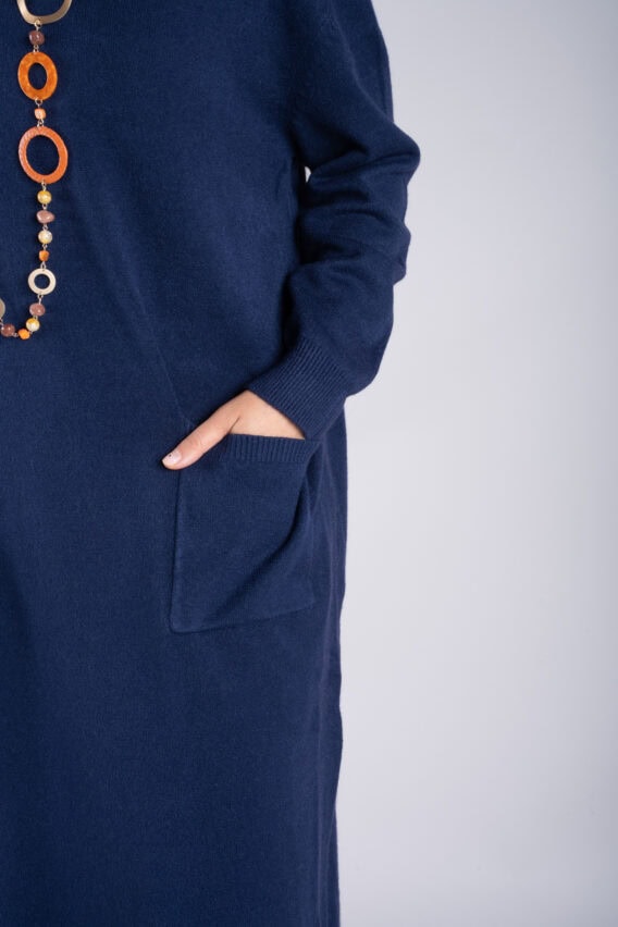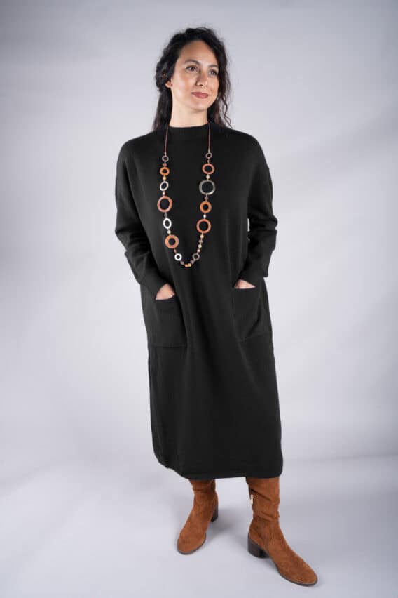 Stay cosy and stylish in this Funnel Neck Long Knit Jumper Dress. This dress features full-length sleeves with ribbed cuffs, a ribbed hem, neckline, and pockets for added convenience. The two front pockets are perfect for keeping your hands warm or storing small essentials. Pair this dress with boots and tights for a chic and comfortable look that is perfect for any occasion.