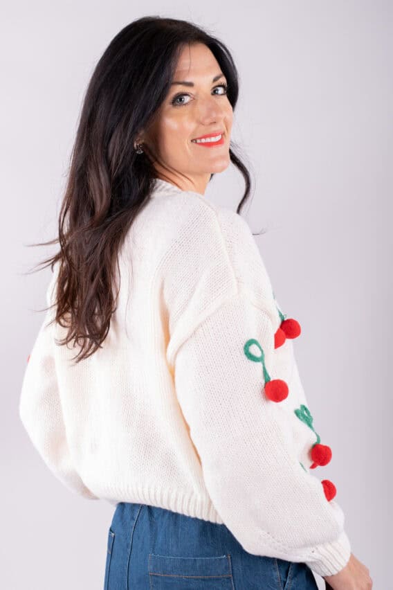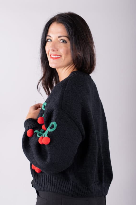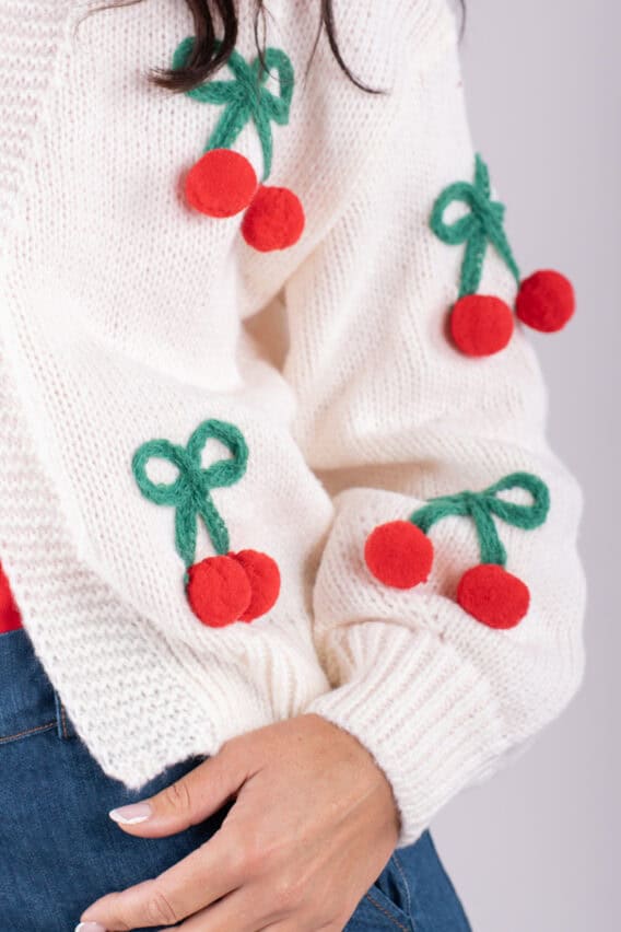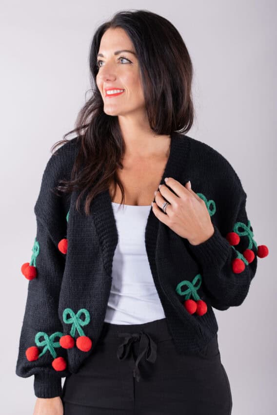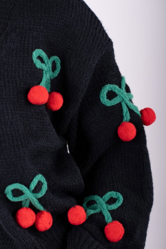 This open knit cardigan is a charming addition to your wardrobe. Featuring knitted 3D cherries on the front, this cheerful design adds a playful touch to any outfit. The ribbed cuffs and hem provide a comfortable and secure fit, making it perfect for layering over your favorite tops. Stay cosy and stylish with this unique and eye-catching knit cardigan.