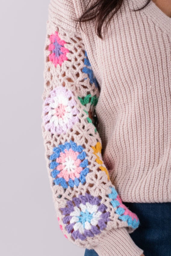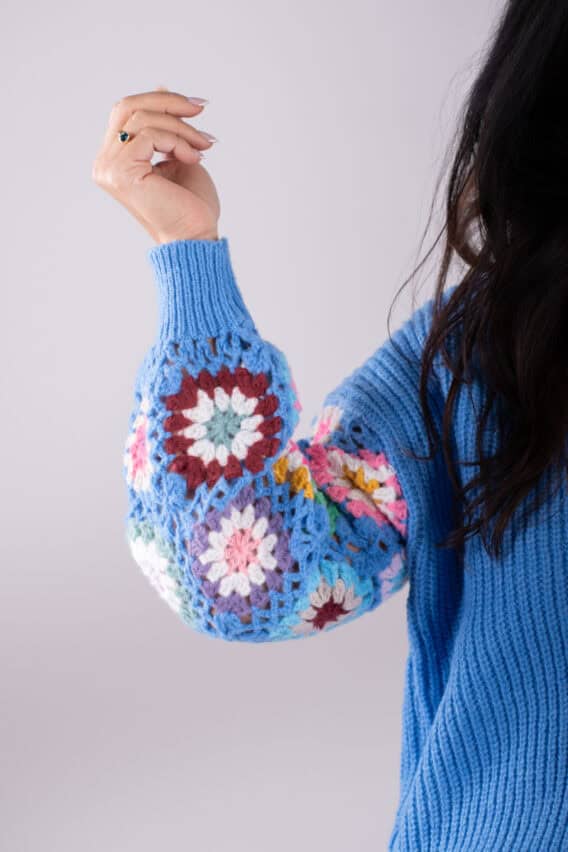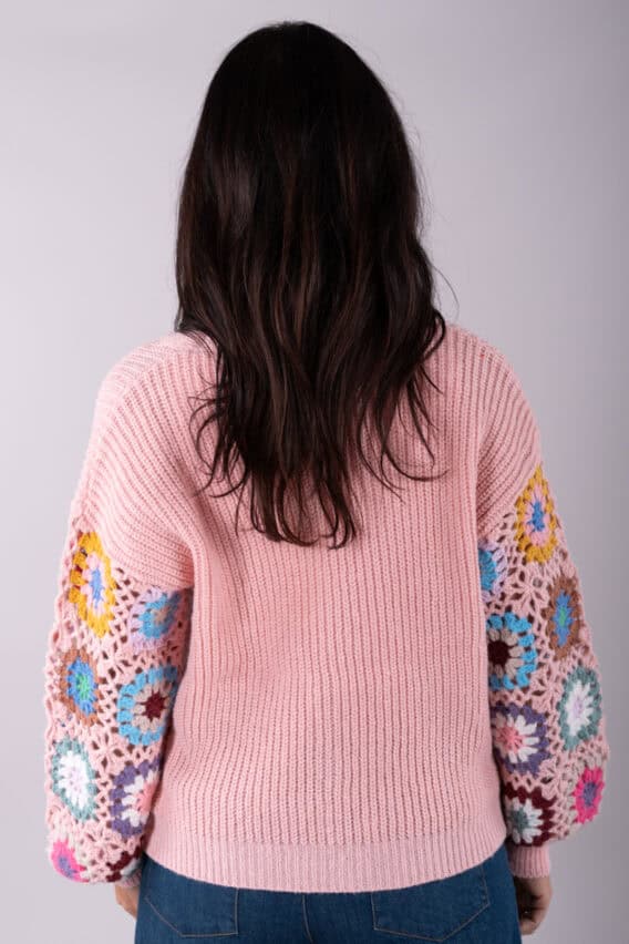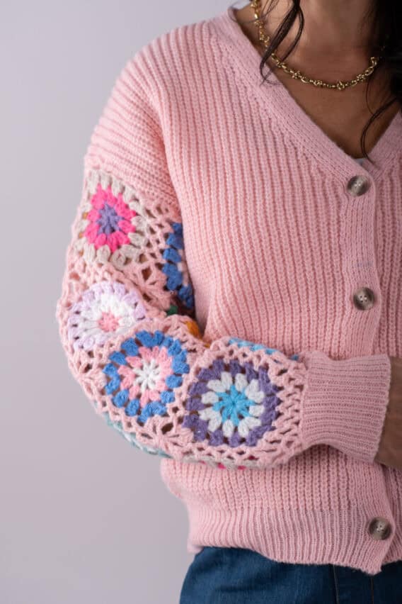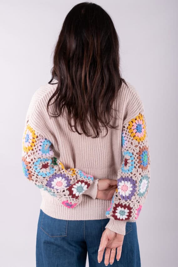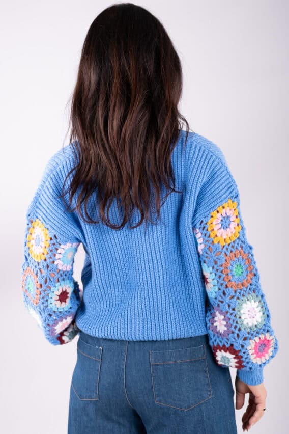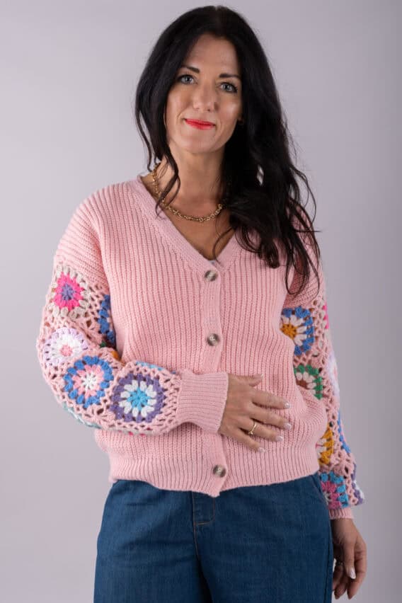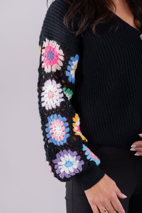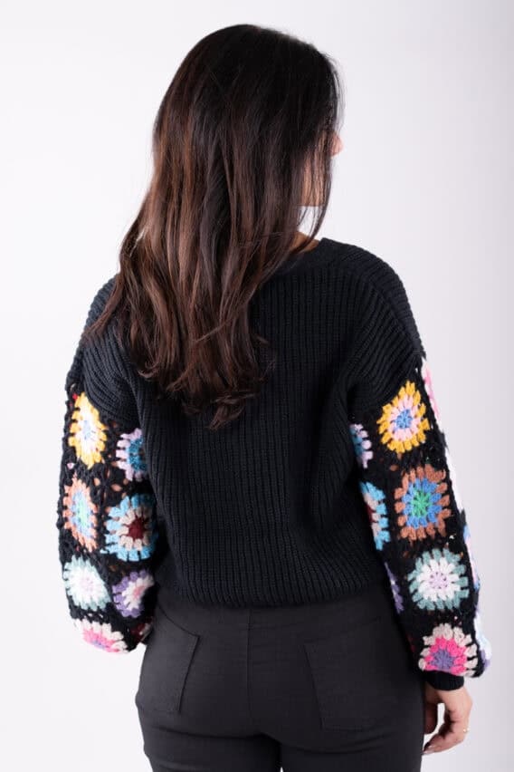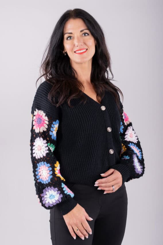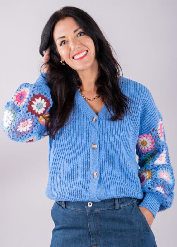 Stay cosy and stylish this autumn with our V-neck knitted cardigan featuring unique horn-style buttons and multi-colour crochet sleeves. This fun and playful piece is the perfect addition to your wardrobe, adding a pop of colour and texture to any outfit. Whether you’re running errands or relaxing at home, this cardigan is sure to keep you warm and fashionable all season long.