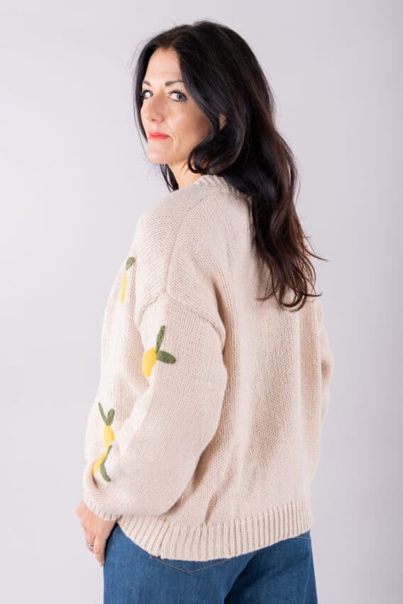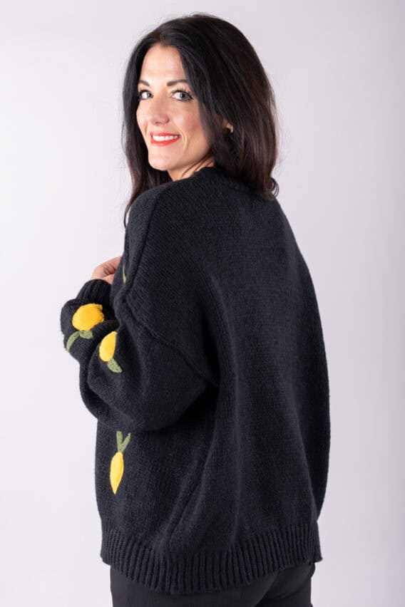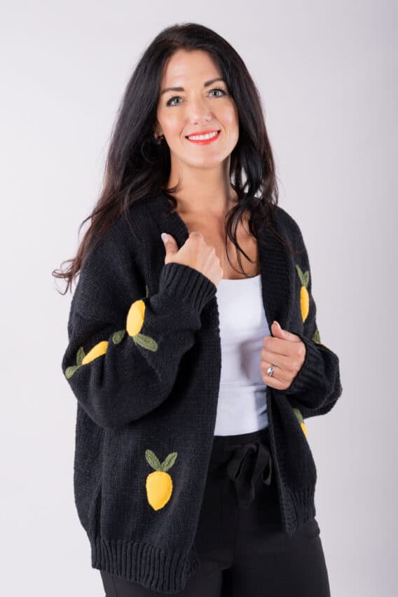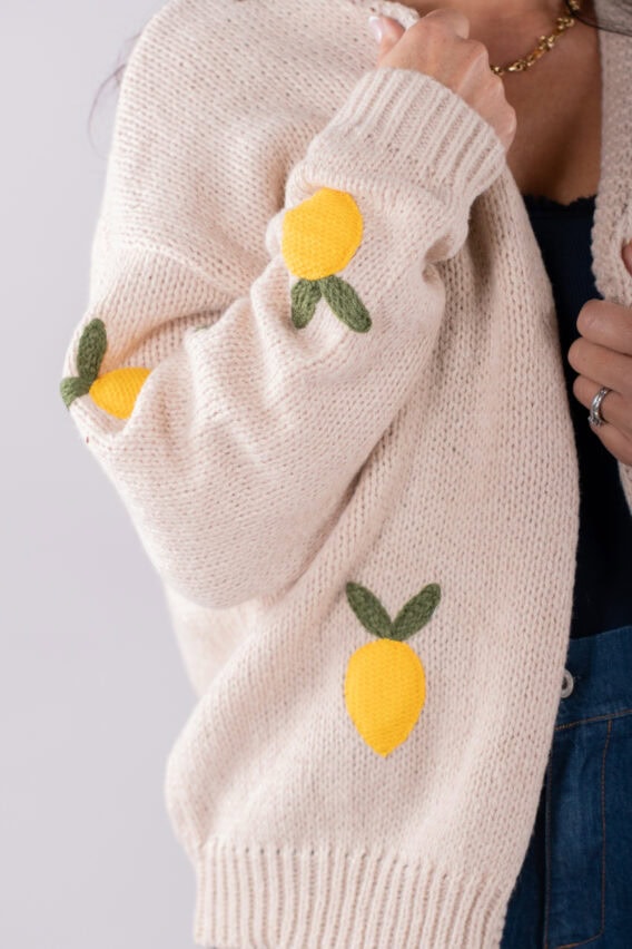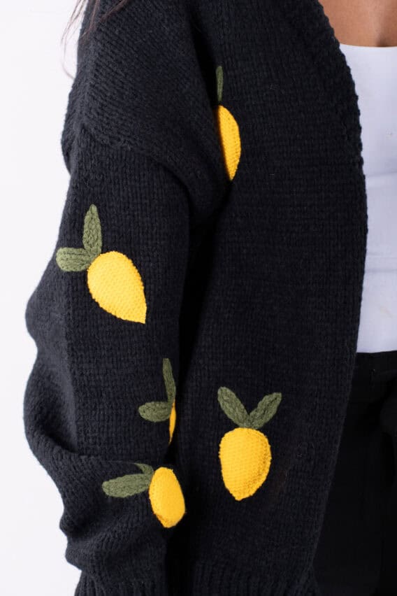 Stay cosy and stylish in this Knitted Lemon Open Cardigan. This cardigan features bold wadded knitted lemons on the front, adding a fun and playful touch to your outfit. The no fastening design makes it easy to throw on over any outfit, while the full-length sleeves provide extra warmth. The ribbed neckline, hem, and cuffs add a classic touch to this modern piece. Perfect for adding a pop of color to your wardrobe, this cardigan is sure to become a favourite in your closet.