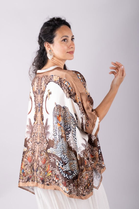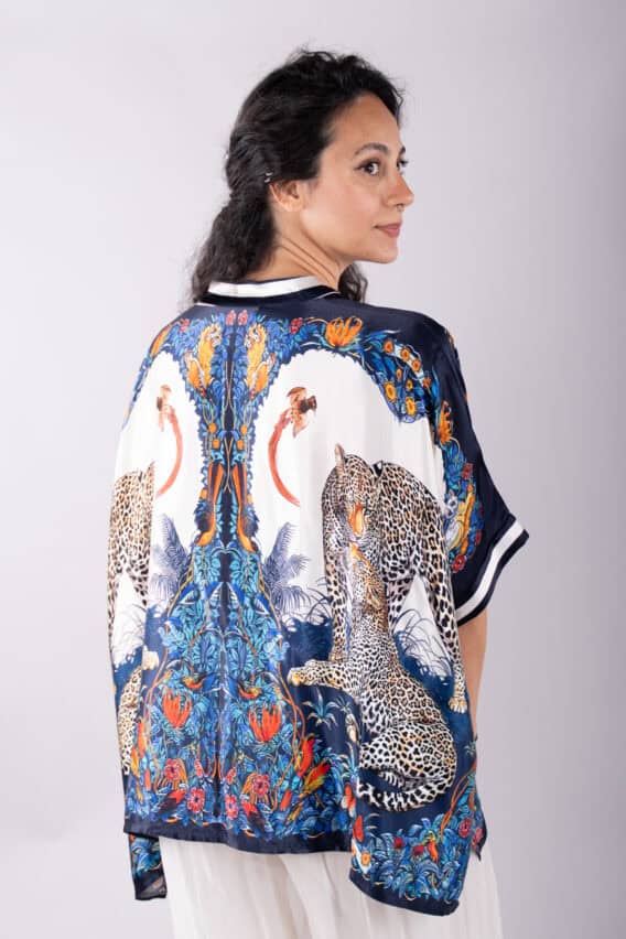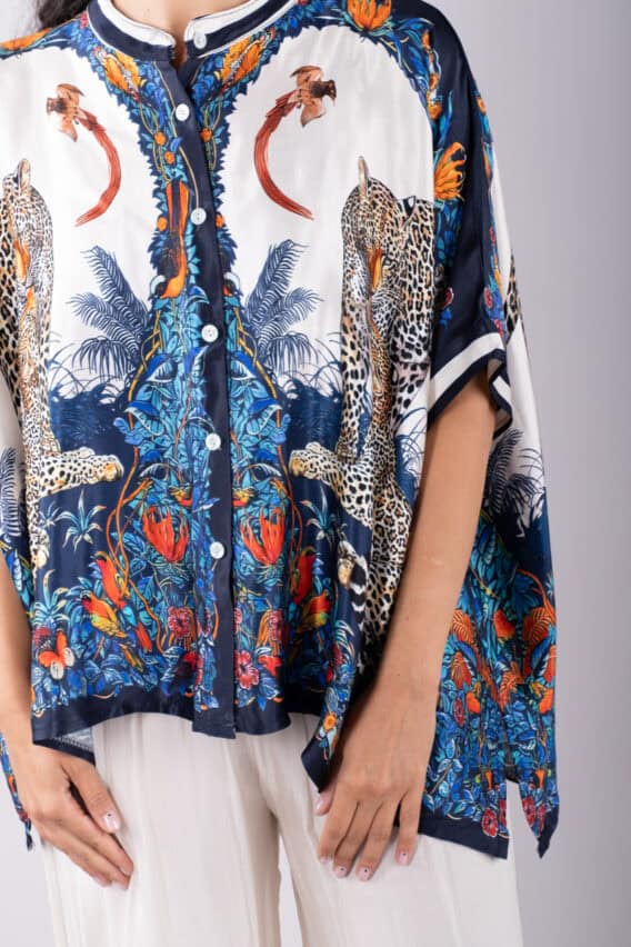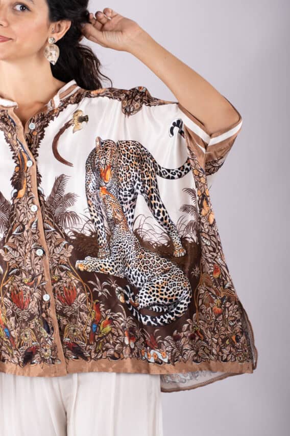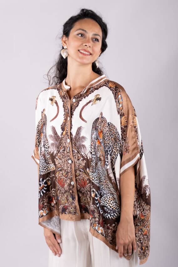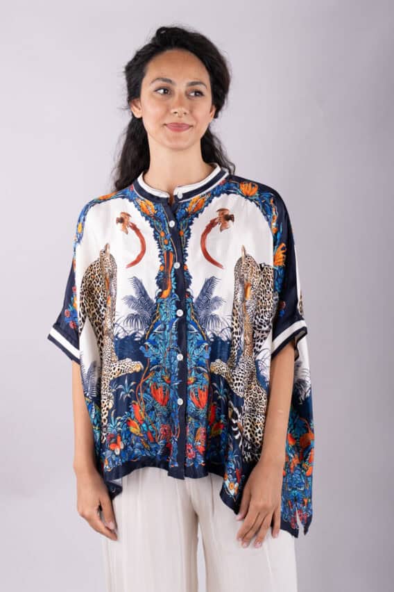 Make a bold statement with this stunning Leopard Print silk blend blouse. The batwing short sleeves add a touch of drama, while the pearl buttons down the front provide a touch of elegance. The slits on either side add a modern twist, and the grandad collar adds a sophisticated touch. With its silky feel, this blouse is sure to become a favourite in your wardrobe.