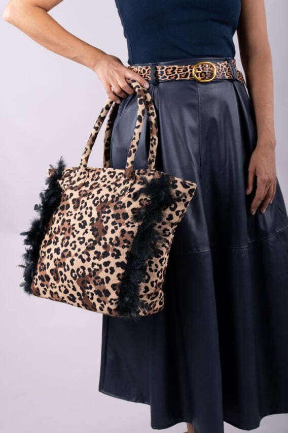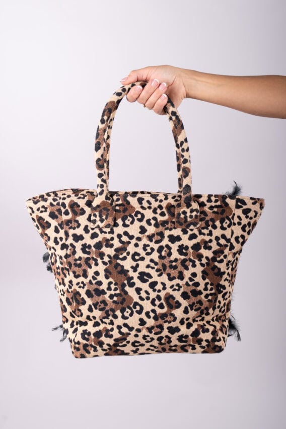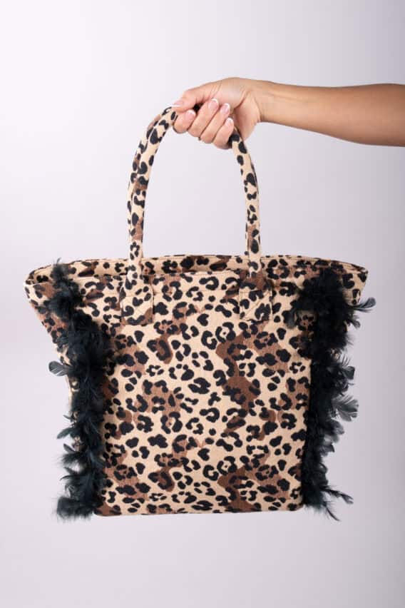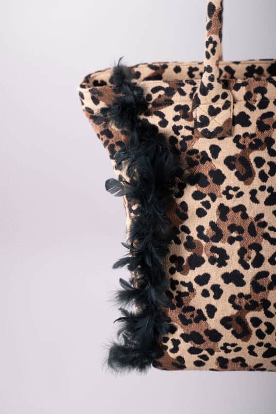 Both sides of the bag are accented with soft black feather features, adding texture and a touch of playful glamour. Its sturdy, padded handles are also covered in matching leopard print fabric, making the design cohesive.