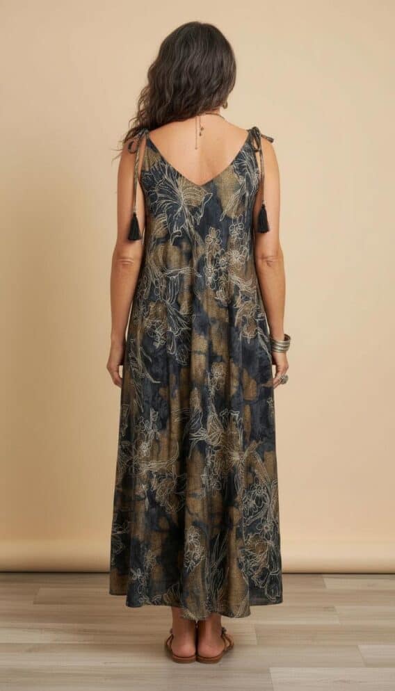 This boho-inspired sleeveless maxi dress combines effortless elegance with an easy, floaty silhouette. Crafted from a soft silk-blend fabric, it drapes beautifully and moves with a light, graceful feel. A flattering V-neckline and delicate adjustable shoulder straps, finished with subtle black tassel ties, add an artisanal touch.