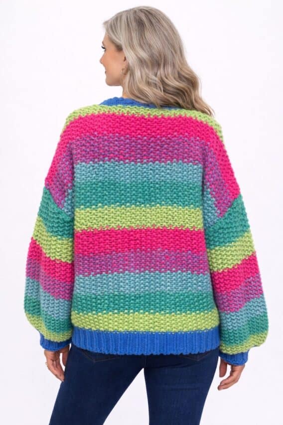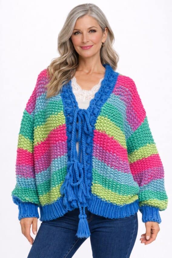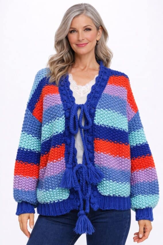 Add a vibrant layer of comfort to your wardrobe with this multi-colour tassel cardigan, crafted from a soft cotton-blend chunky knit for a cosy yet breathable feel. Bold colour blocking is complemented by contrast knit trim that adds depth and texture throughout the design. The relaxed silhouette is finished with two tie tassels at the front for an adjustable fastening and a touch of bohemian charm. Ribbed cuffs and hem provide structure and a snug fit, making this cardigan an easy statement piece for layering through the seasons.