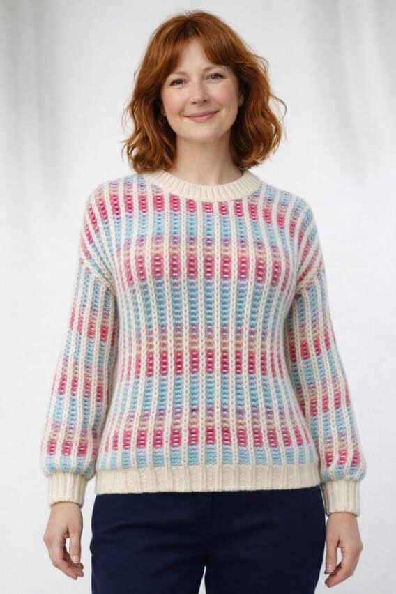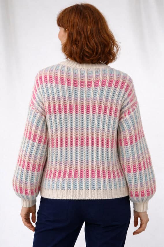 Brighten your knitwear collection with this eye-catching chunky jumper, designed in vibrant turquoise, lilac and pink horizontal stripes for a playful pop of colour. Crafted in a bold float knit construction, it offers rich texture and cosy warmth while creating a standout look. The classic round neckline is finished with ribbed detailing, while ribbed cuffs provide structure and help maintain the jumper’s shape. Soft, comfortable, and full of personality, this bright statement knit is perfect for adding colour to cooler-day outfits