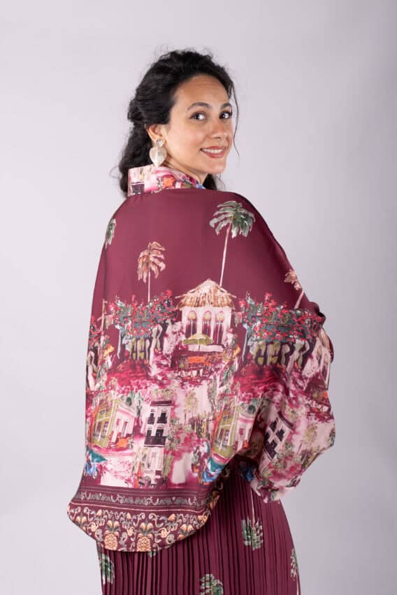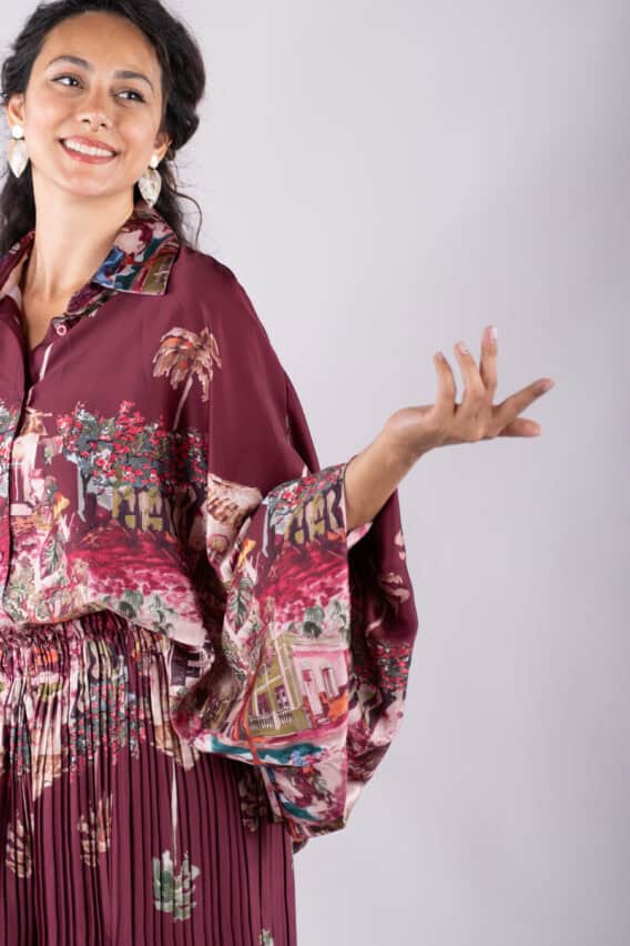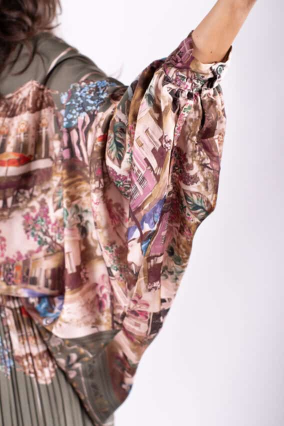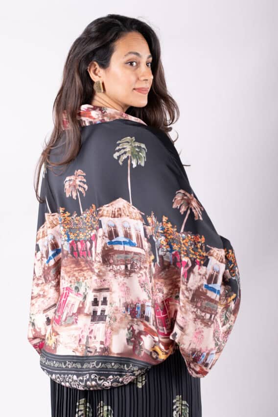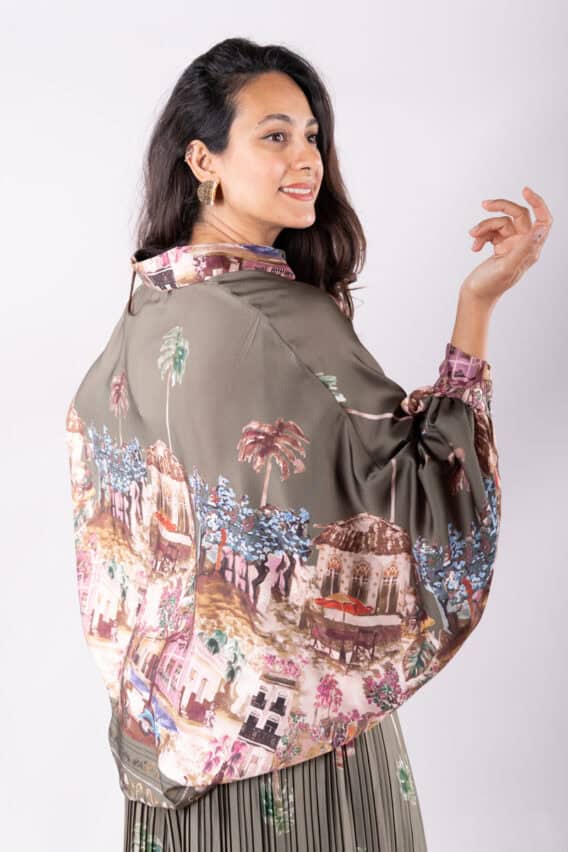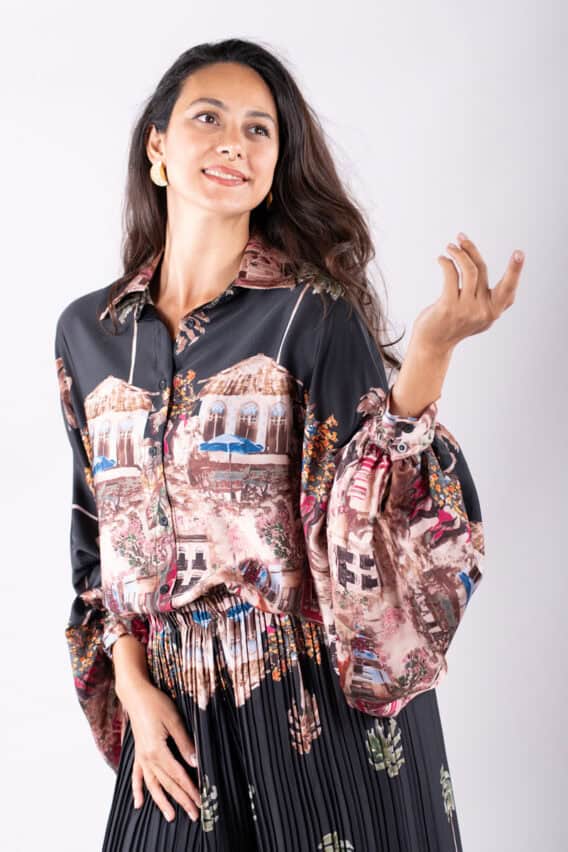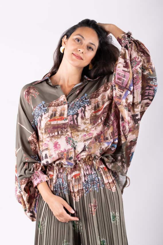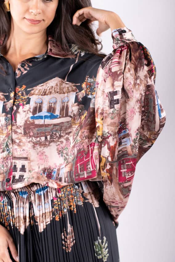 This Old Town Print Oversized Batwing Shirt features balloon sleeves and buttons down the front for fastening. It is perfect when paired with our matching pleated trousers for a coordinated and stylish look.