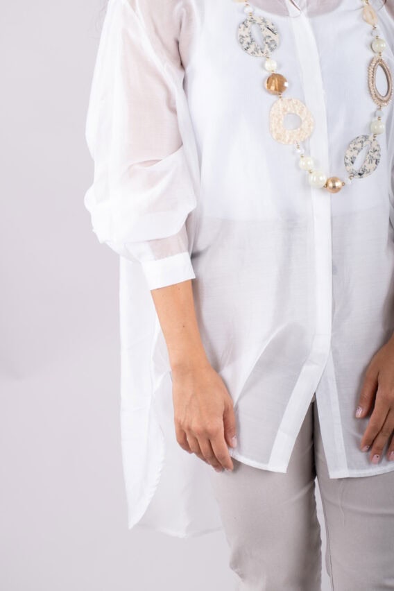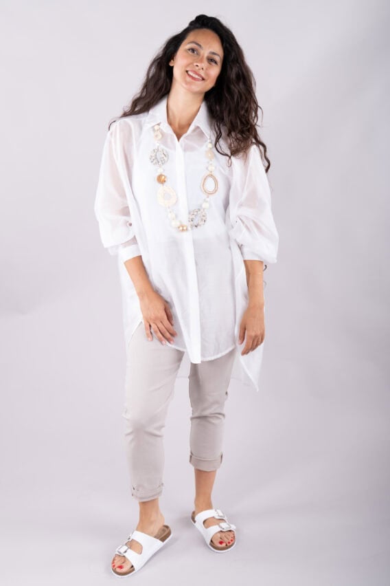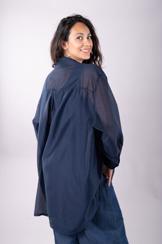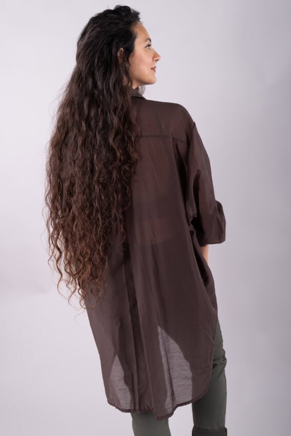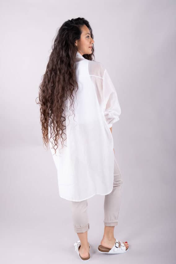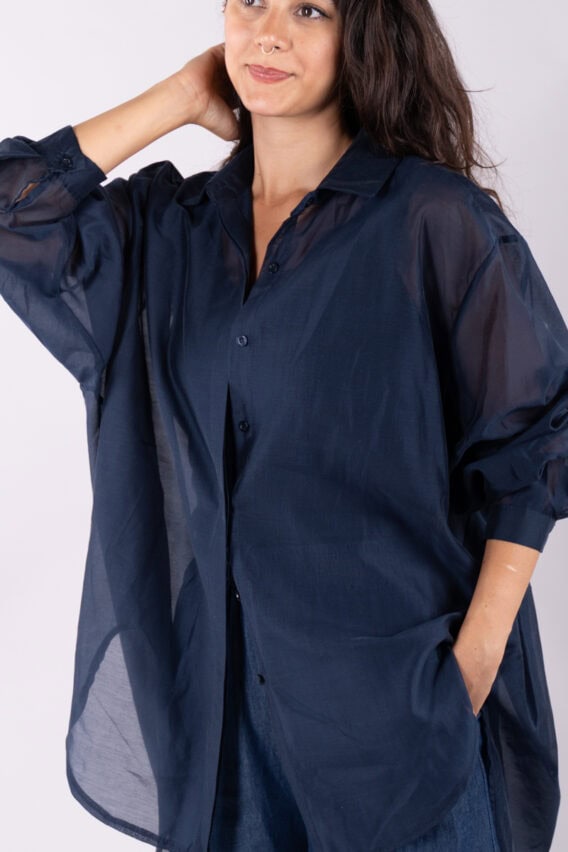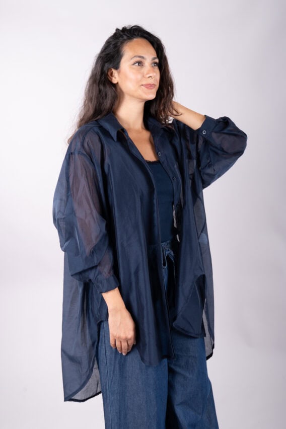 This oversized sheer shirt is a stylish and versatile addition to your wardrobe. With a longer back than front, it has a unique and flattering silhouette. The button-down front and buttoned cuffs add a touch of sophistication, while the rounded hem and pleat on the back add subtle detail. Perfect for layering over a vest top and pairing with magic trousers, this shirt is a chic and effortless choice for any occasion.