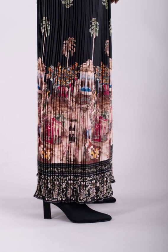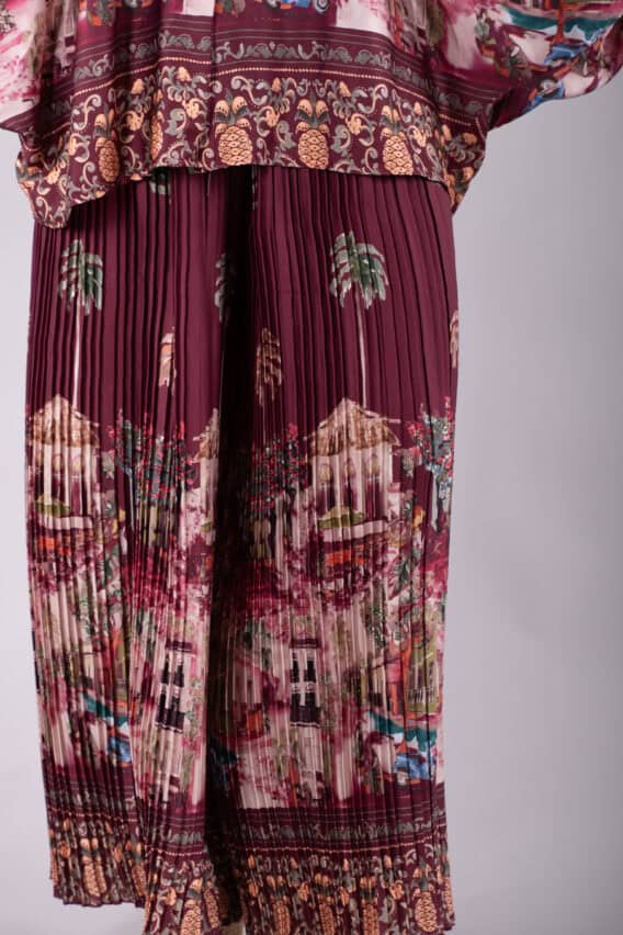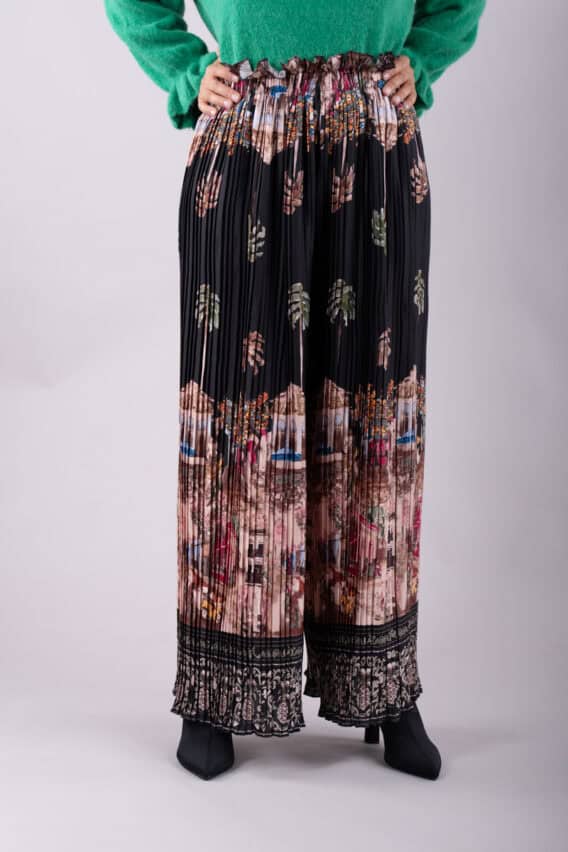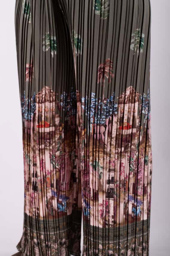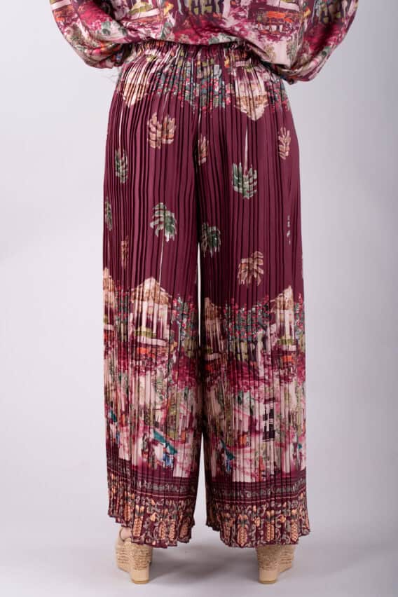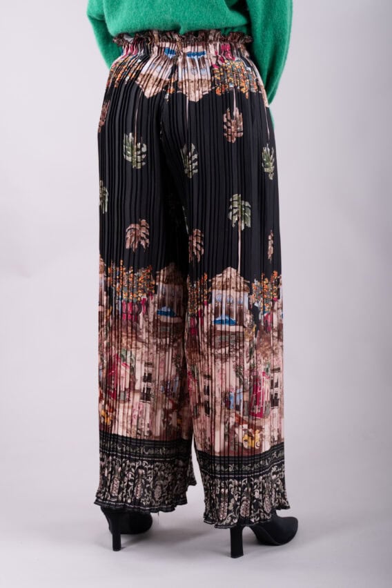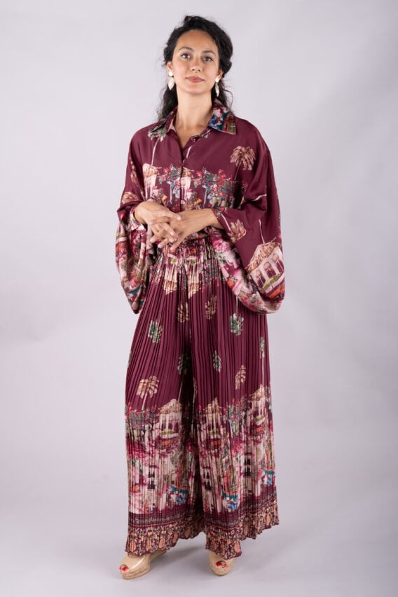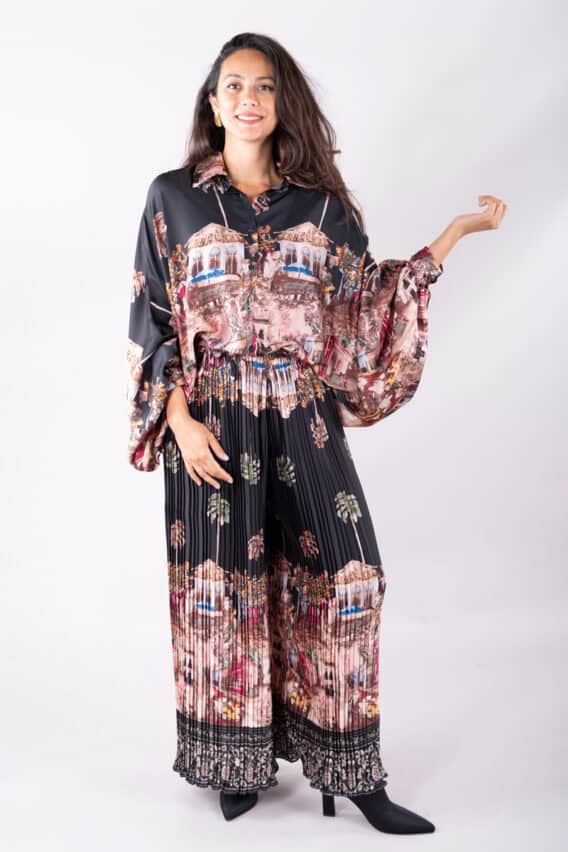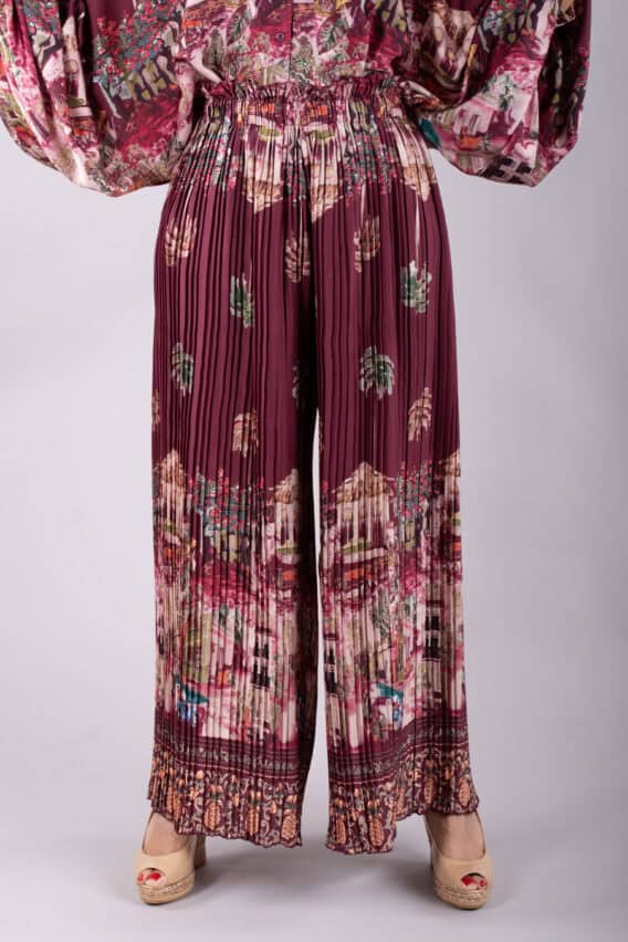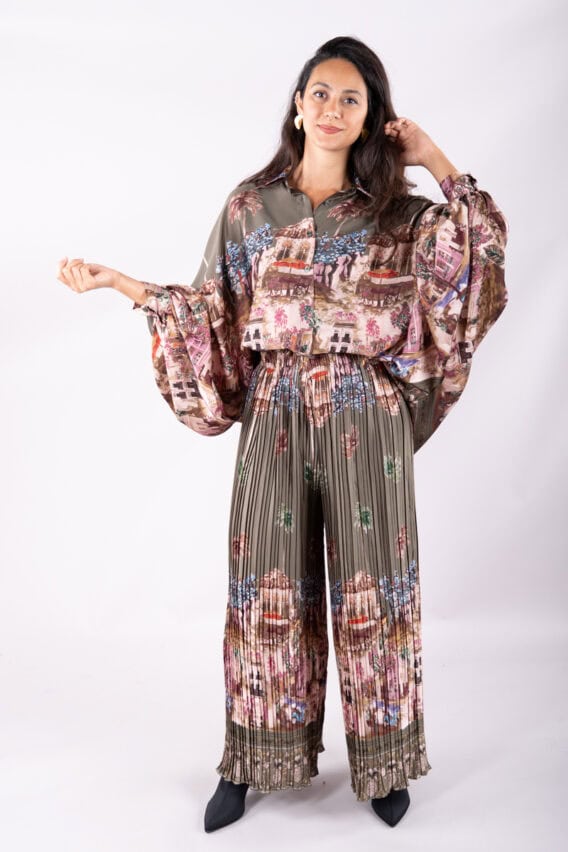 These Pleated Wide Leg Trousers feature an elasticated stretchy waistband for a comfortable fit. The trousers are adorned with an old town print and have a silky feel, making them a stylish and luxurious addition to your wardrobe. They are perfect when paired with our matching top or alpaca blend jumper for a coordinated and chic look.