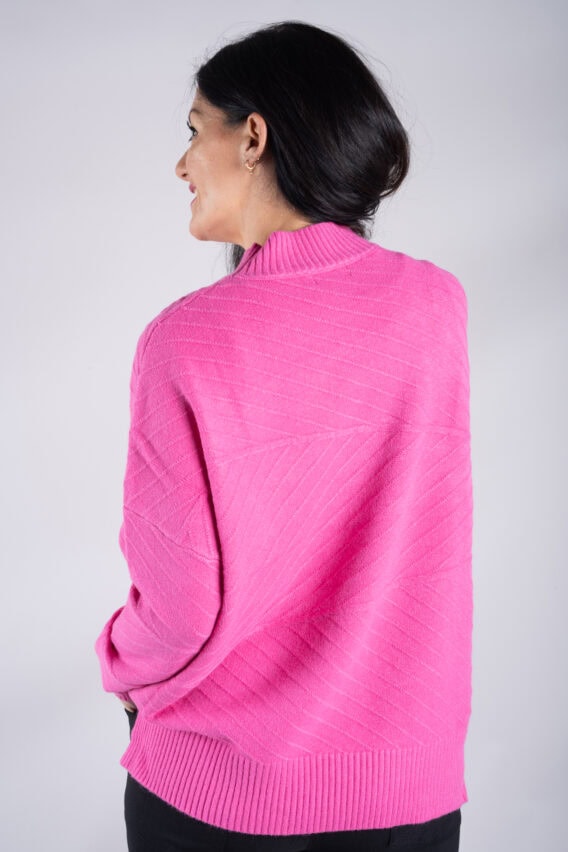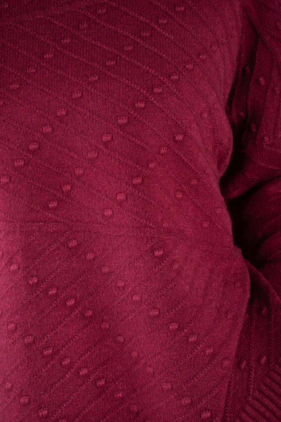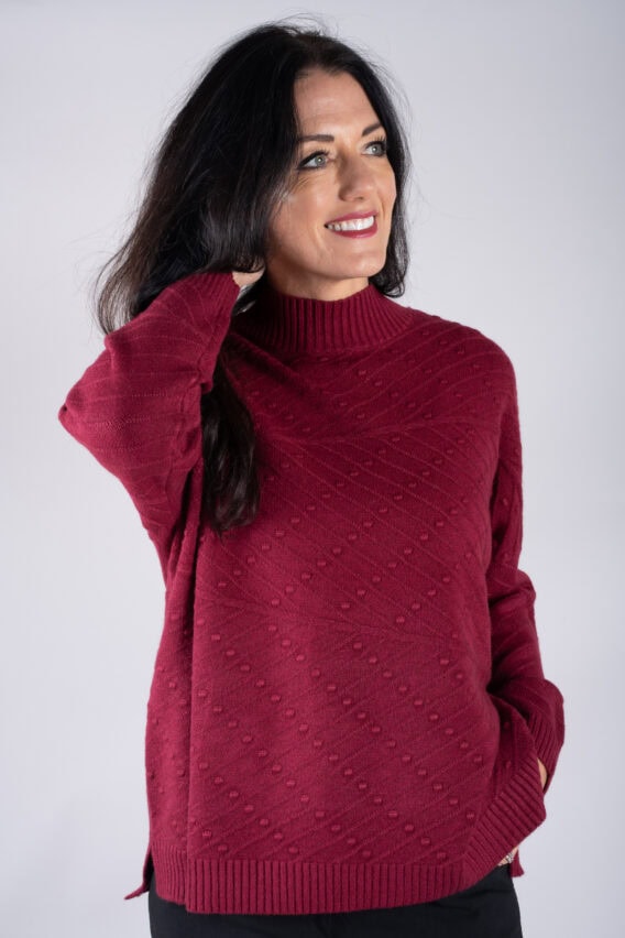 Stay cosy and stylish in our Popcorn Knit Funnel Neck Jumper. This sweater features full-length sleeves, ribbed cuffs, hem, and neckline for a comfortable fit. The unique popcorn knit adds a fun texture to the look. The slit on either side of the hem adds an extra detail to this classic piece. Perfect for staying warm and fashionable during the cooler months.