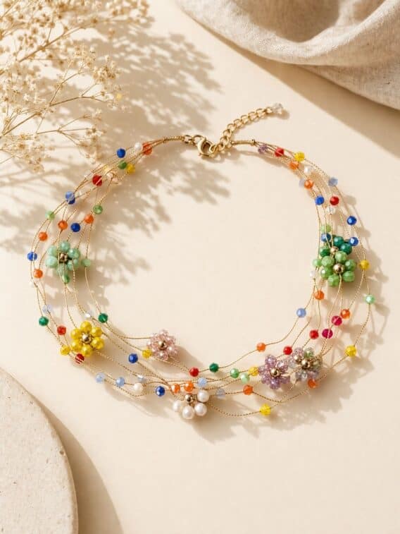 The playful combination of bright hues and dainty flower accents creates a lively, eye-catching design that effortlessly enhances both casual and dressy outfits. The layered construction gives a soft, flowing drape across the neckline, offering texture, movement, and a unique handcrafted feel.