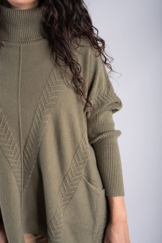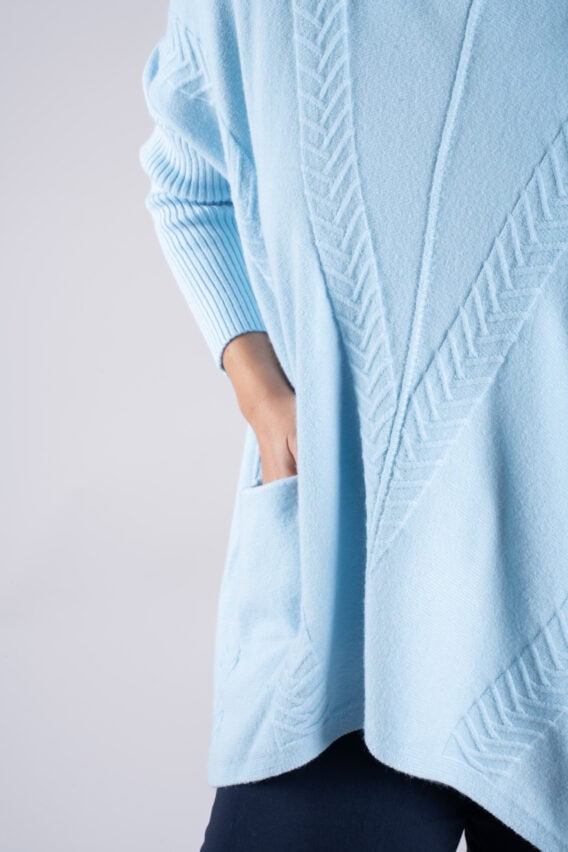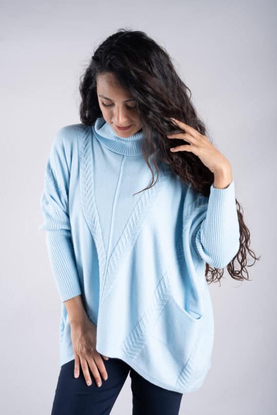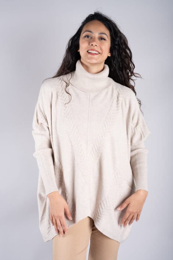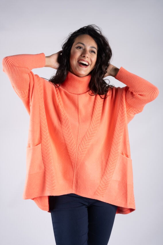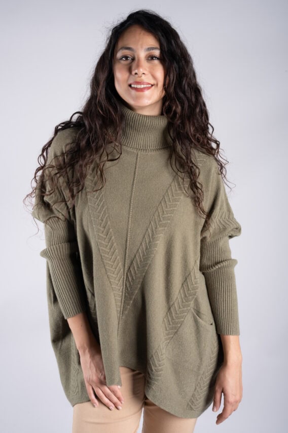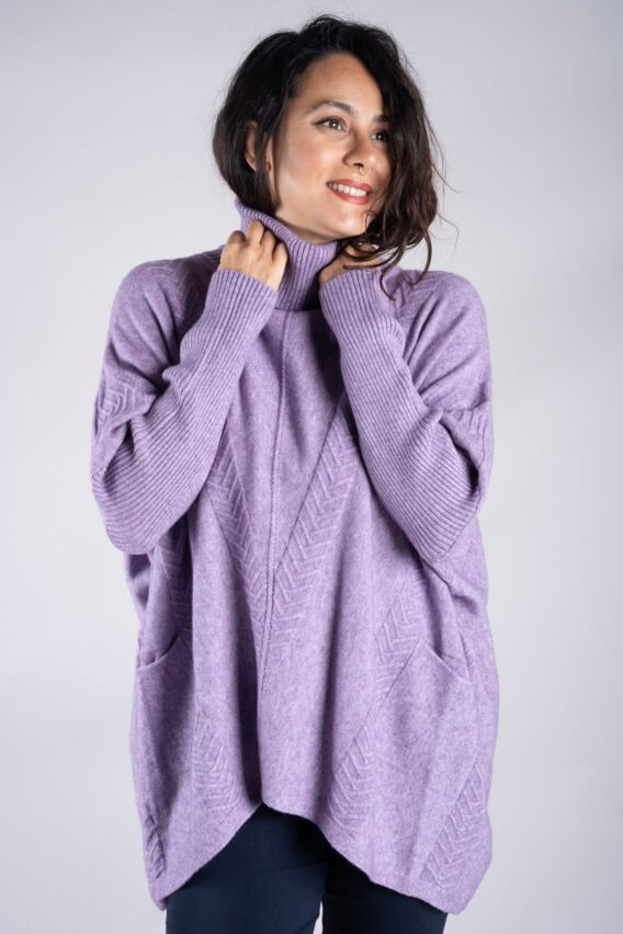 Stay cosy and stylish in this Roll Neck Chevron Knit Jumper. Featuring a unique chevron knit pattern on the front and back, this jumper is sure to make a statement. The batwing sleeves add a touch of elegance, while the ribbed sleeves and roll neck provide extra warmth and comfort. With two front pockets for added convenience, this jumper is the perfect addition to your winter wardrobe.
