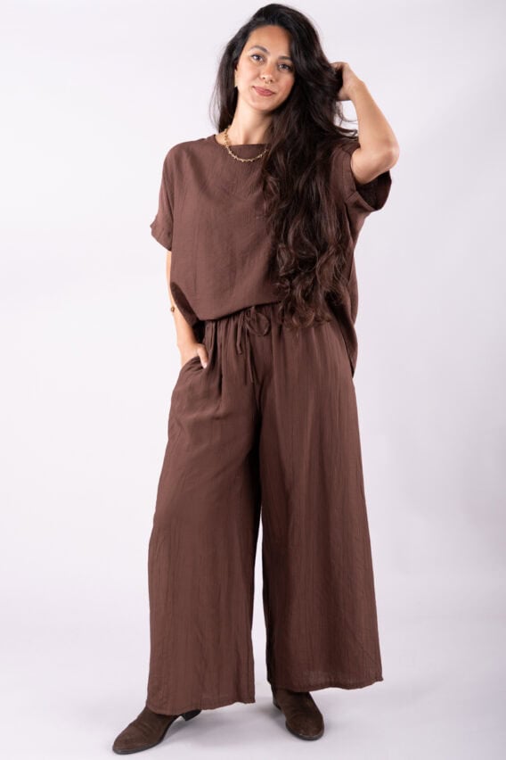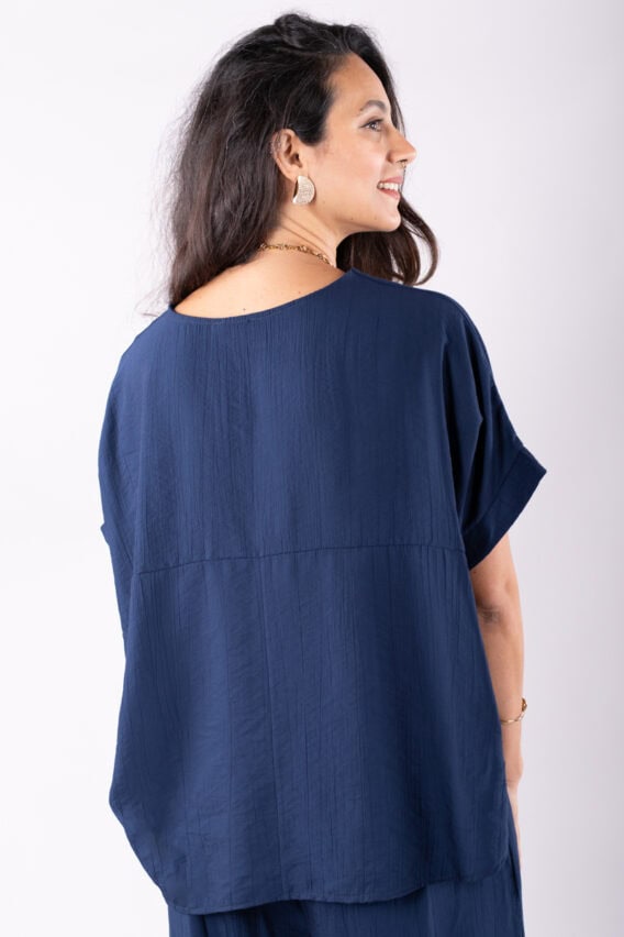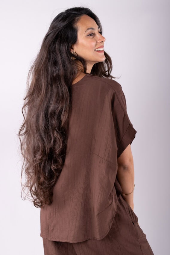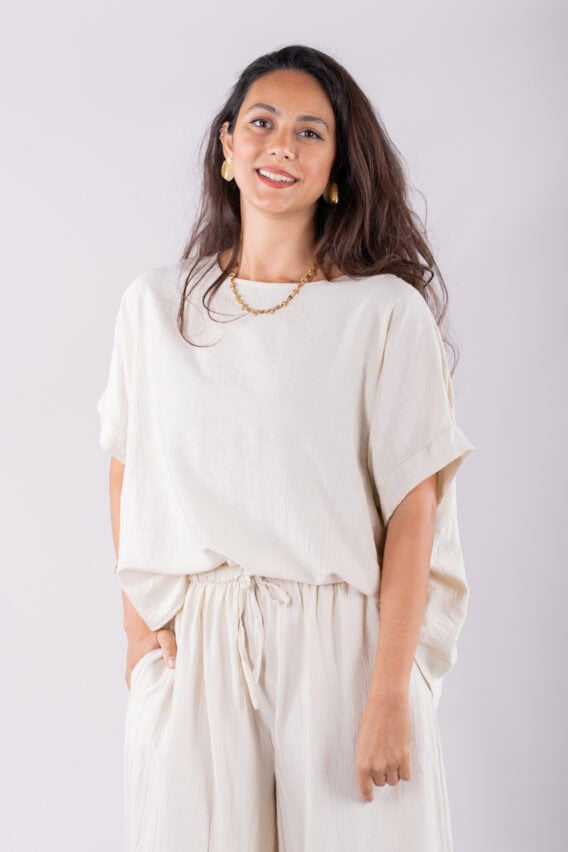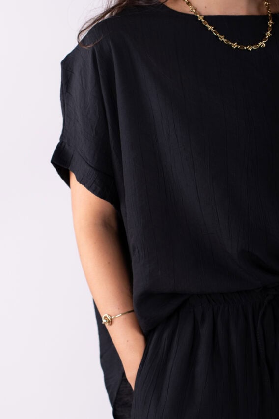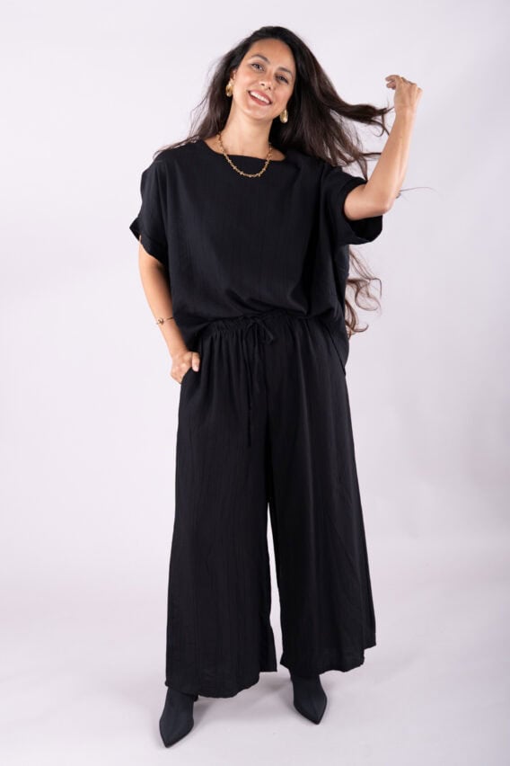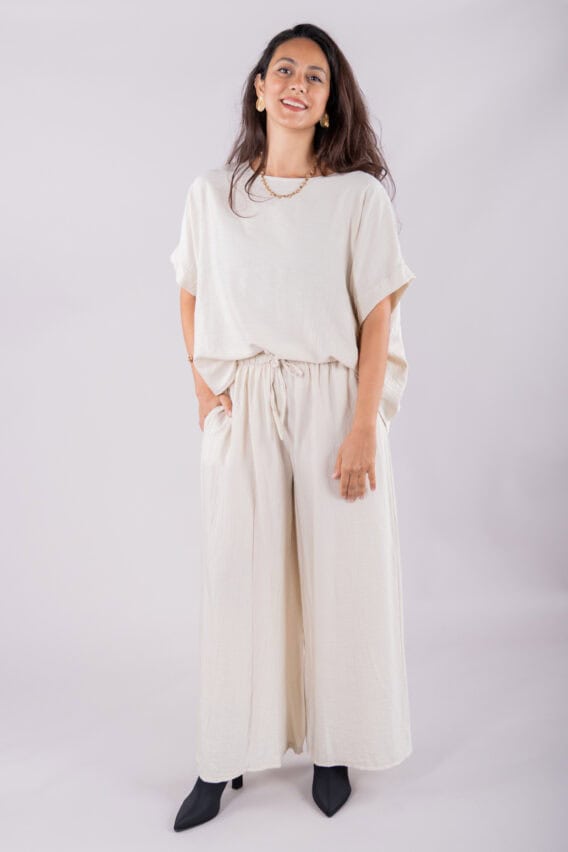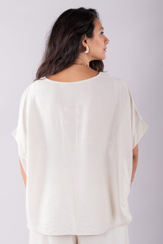 This Round Neck Short Drop Sleeve top is made from a crinkle material, giving it a unique texture and style. The rounded hem adds a flattering touch to the silhouette. Pair this top with our crinkle trousers, featuring an elasticated waistband, to create a perfect matching set. This outfit is not only stylish but also comfortable, making it a versatile option for any occasion.