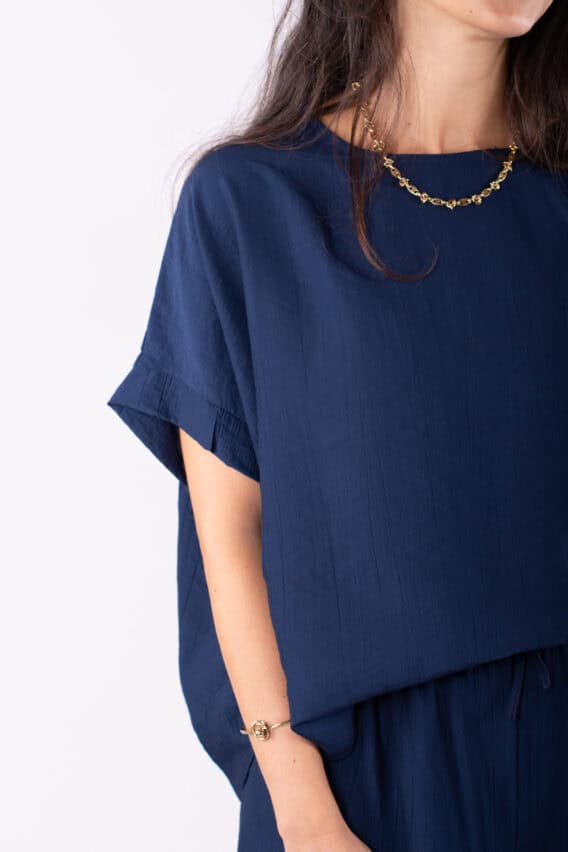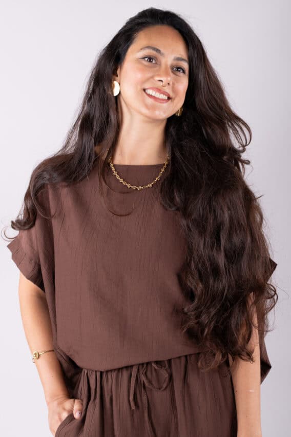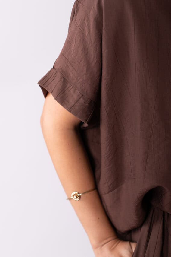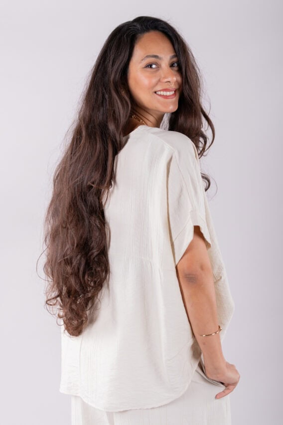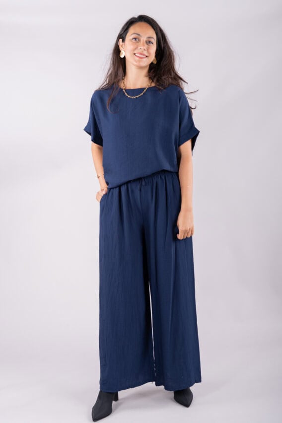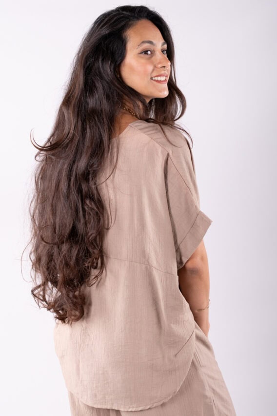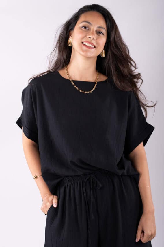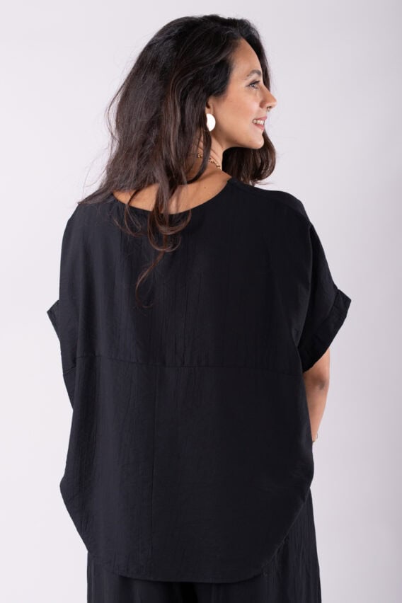 This Round Neck Short Drop Sleeve top is made from a crinkle material, giving it a unique texture and style. The rounded hem adds a flattering touch to the silhouette. Pair this top with our crinkle trousers, featuring an elasticated waistband, to create a perfect matching set. This outfit is not only stylish but also comfortable, making it a versatile option for any occasion.