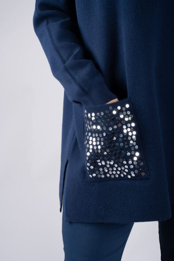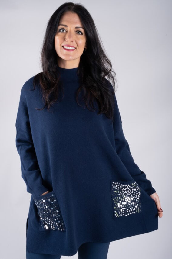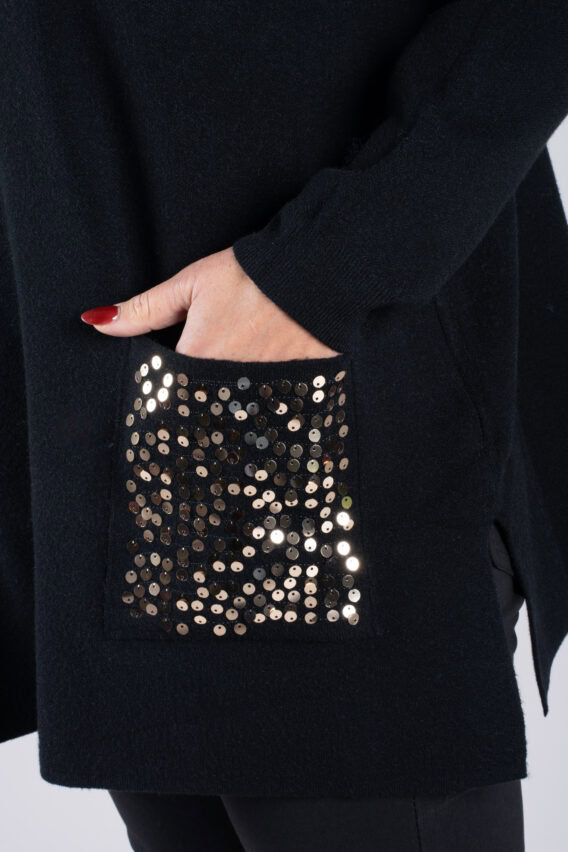 Add a touch of glamour to your winter wardrobe with our Sequin Funnel Neck Knit Jumper. This cosy jumper features embellished sequins on the pocket, adding a festive sparkle to your look. Perfect for the holiday season, this jumper is the ideal piece to jazz up any outfit. With two slits on either side of the hem, this jumper is both stylish and comfortable. Stay warm and stylish this Christmas with our Sequin Funnel Neck Knit Jumper.