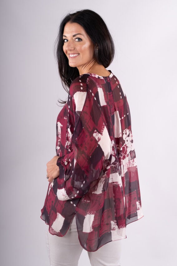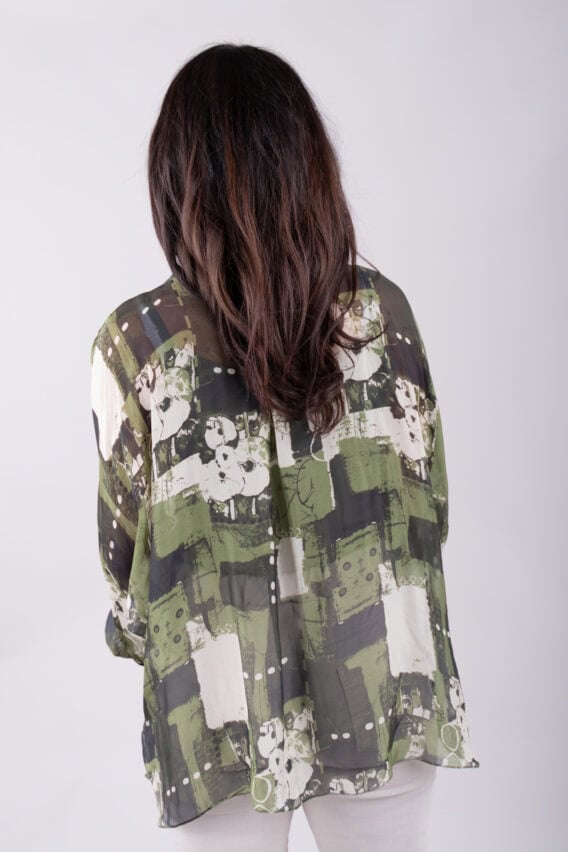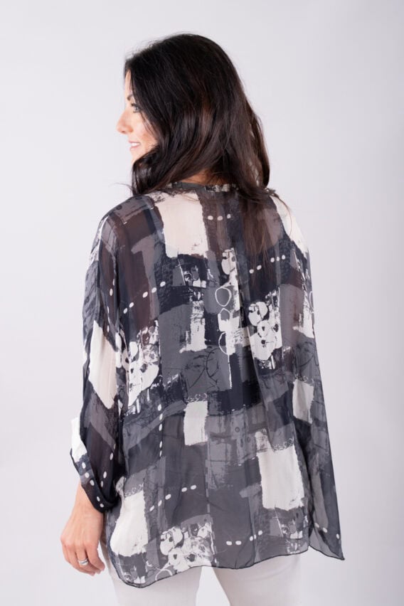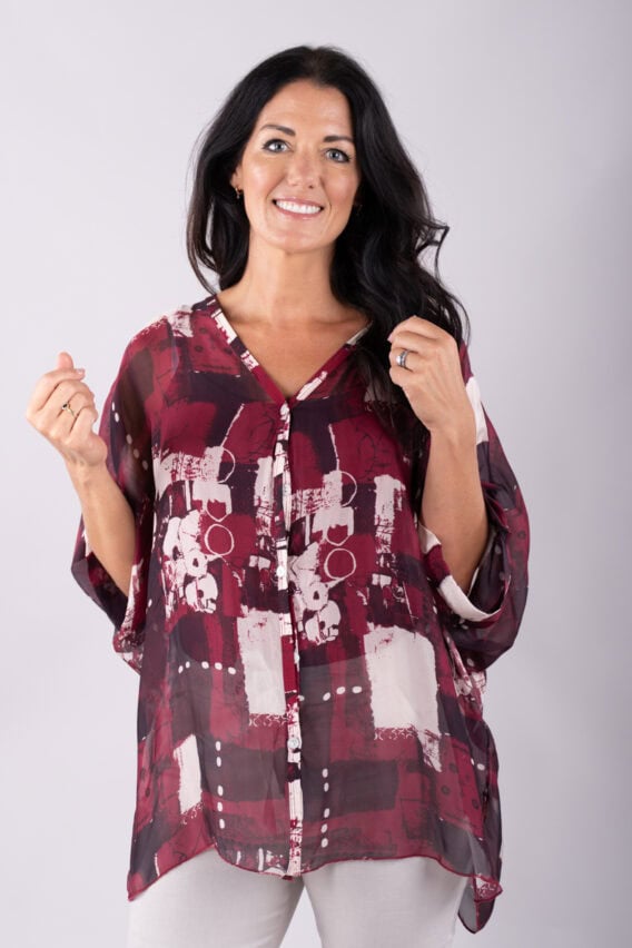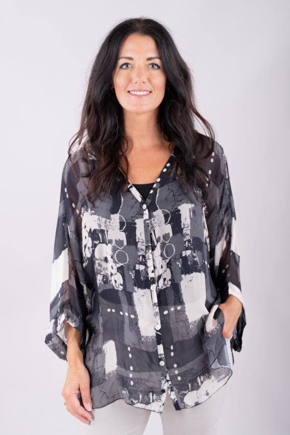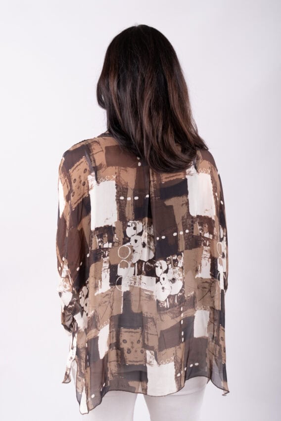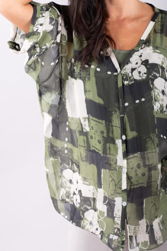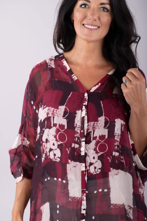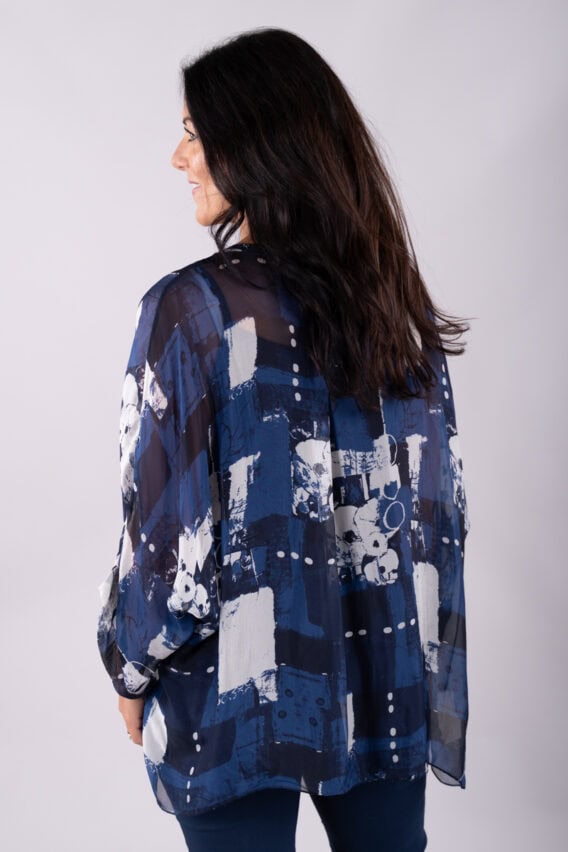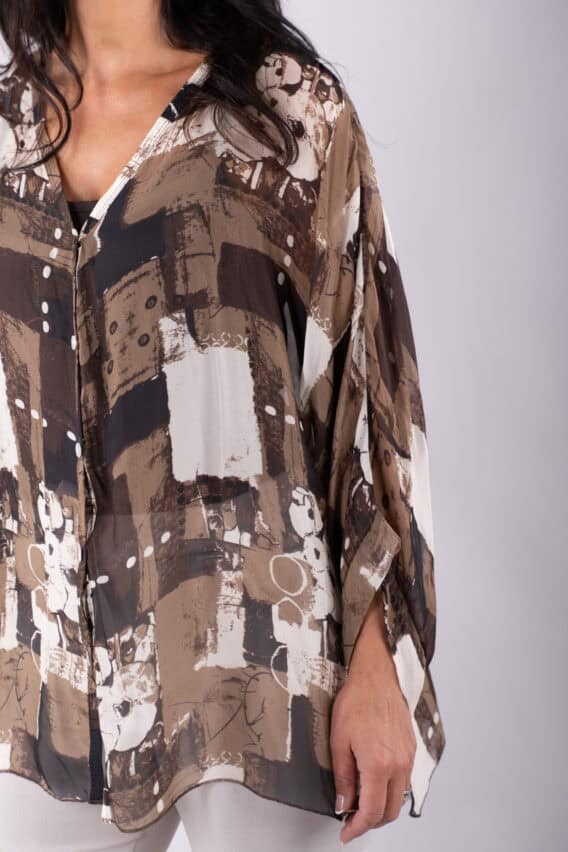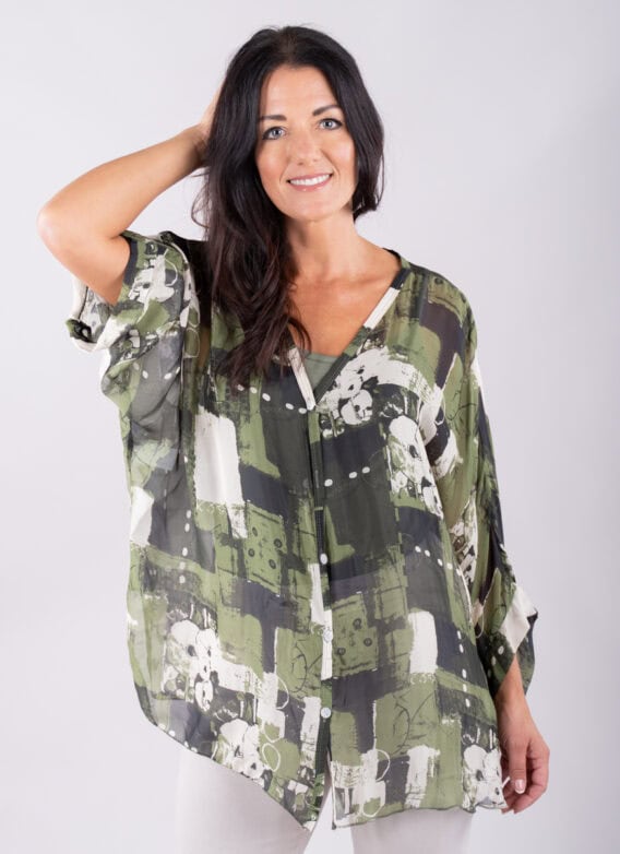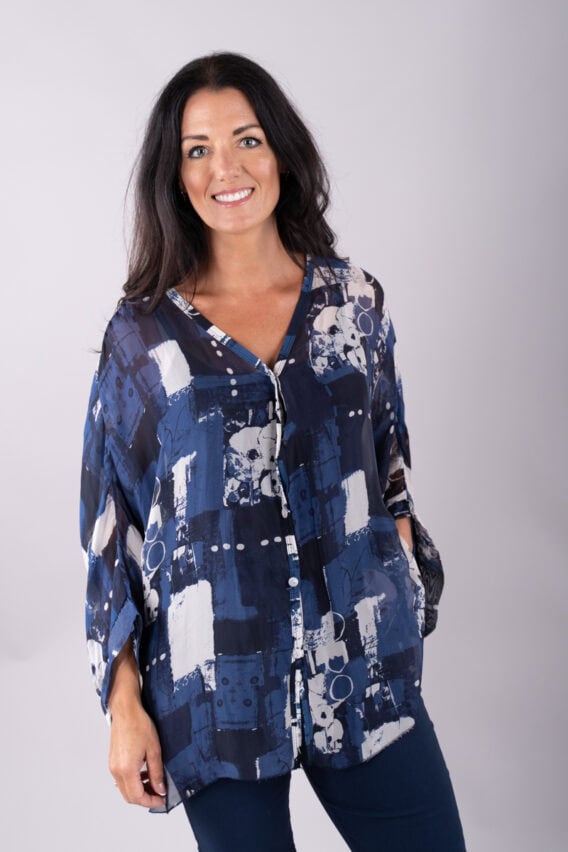 This Silk Blend Abstract Print Oversized Blouse is a stylish and versatile addition to your wardrobe. The three quarter length sleeves and v-neck provide a flattering silhouette, while the pearl buttons down the front add a touch of elegance. The slits on either side and round hem give this blouse a relaxed and flowy feel. The detachable stretchy vest adds an extra layer of comfort and versatility. The pleat at the back adds a unique and chic detail to this already eye-catching piece. Perfect for both casual and dressy occasions, this blouse is sure to become a wardrobe favourite.