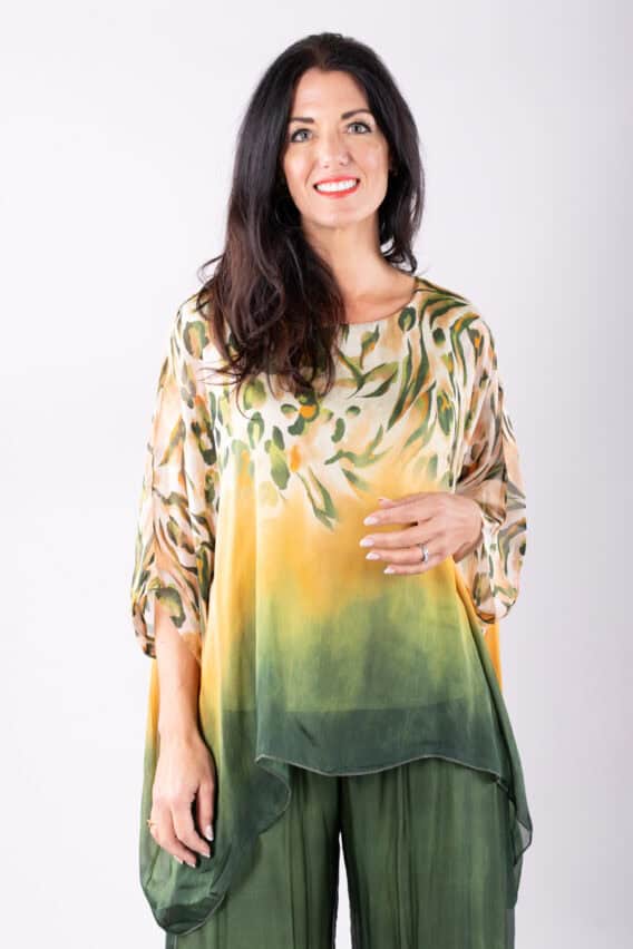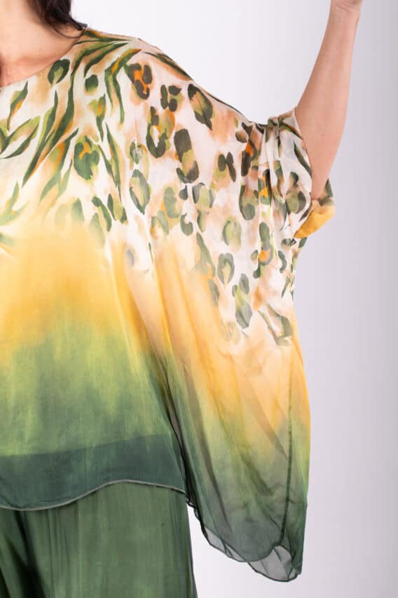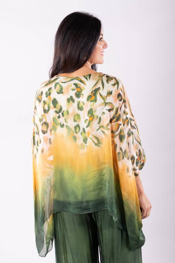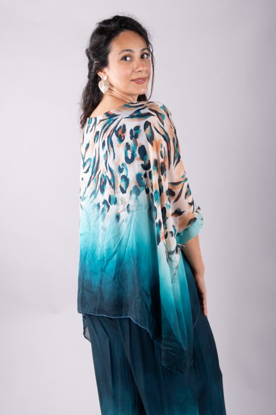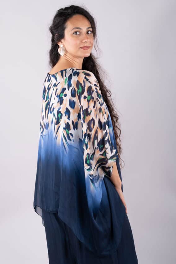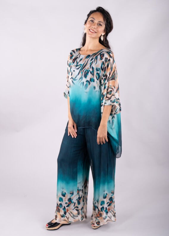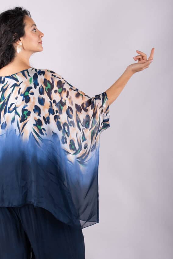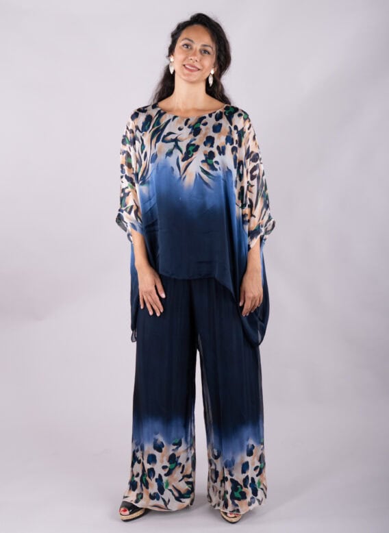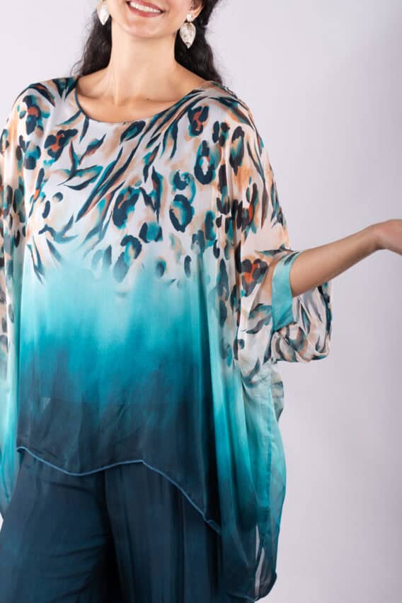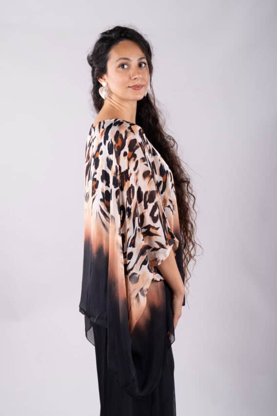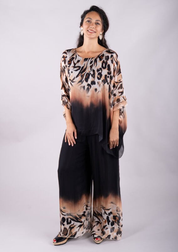This stylish Silk Blend Leopard Print Top features three quarter length sleeves in a trendy batwing style. It comes with an attached stretchy under vest for added comfort and coverage. The top has a flattering round neck and can be paired perfectly with our matching trousers for a coordinated and chic look. Add a touch of animal print to your wardrobe with this versatile and fashionable top.