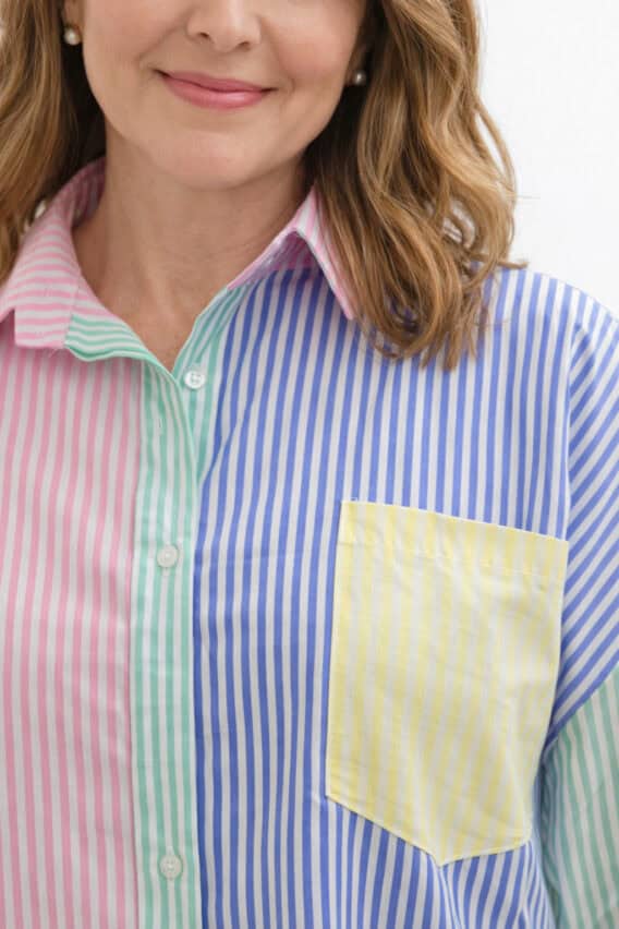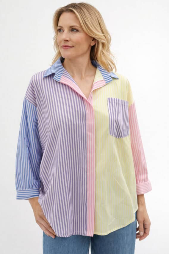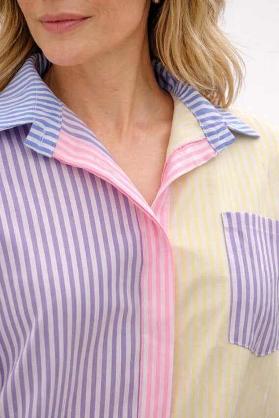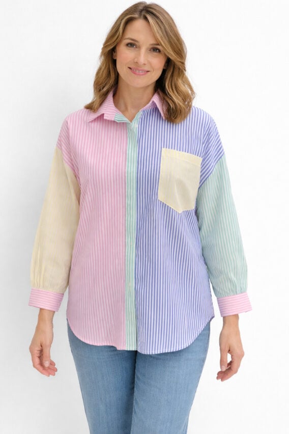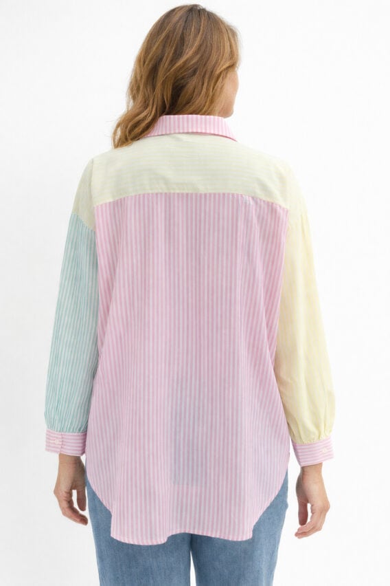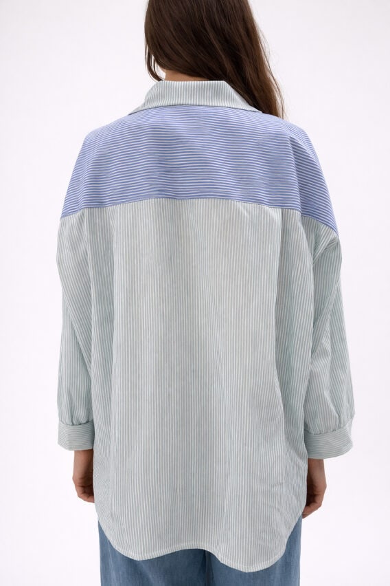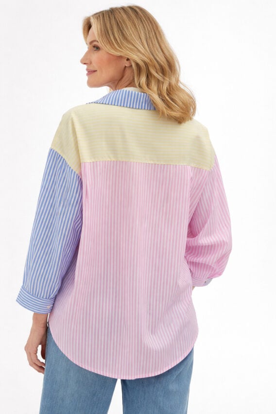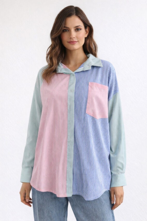 This stylish cotton shirt features a unique patchwork stripe design that adds a modern twist to a classic silhouette. Crafted from breathable cotton, it offers all-day comfort while maintaining a polished look. The oversized shirt is designed with a classic collar and full-length sleeves finished with button cuffs for a refined touch. Buttons down the front provide easy fastening, while a front chest pocket adds a practical detail. The relaxed fit is complemented by a curved hem with a slightly longer back than front, creating a flattering and contemporary shape that pairs effortlessly with jeans or tailored trousers.
