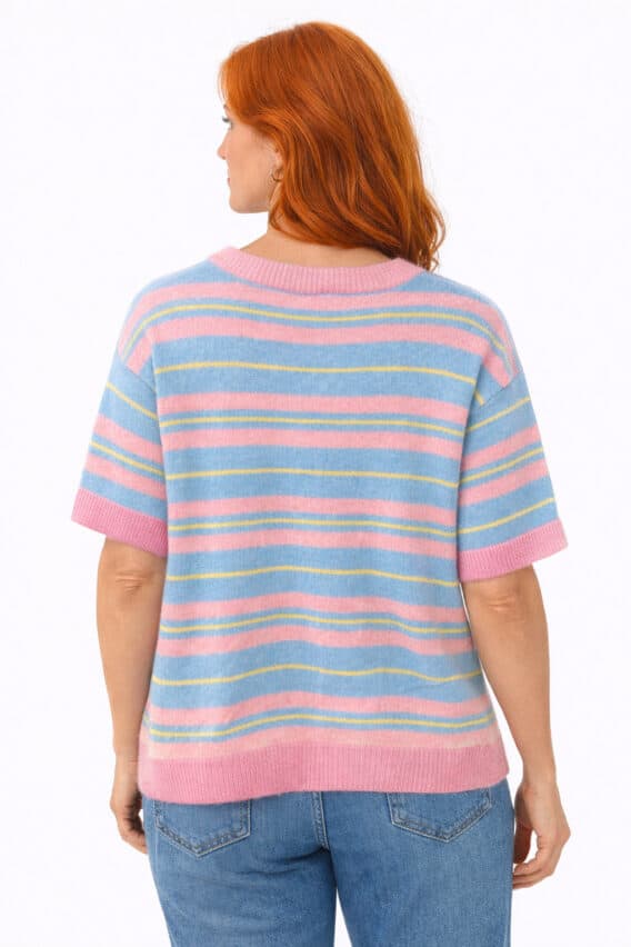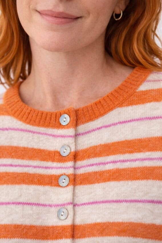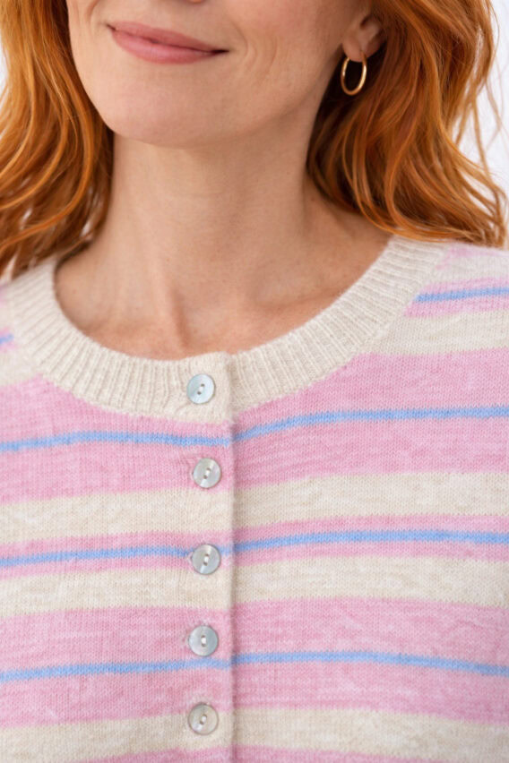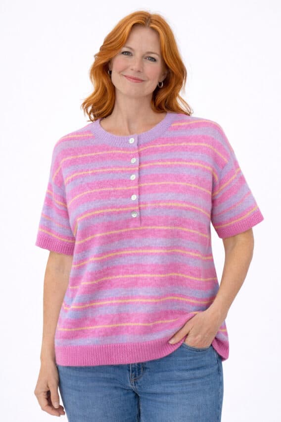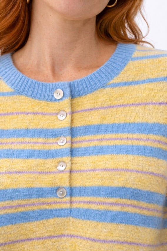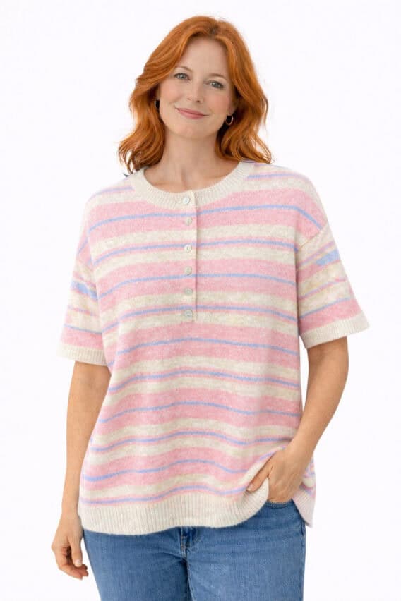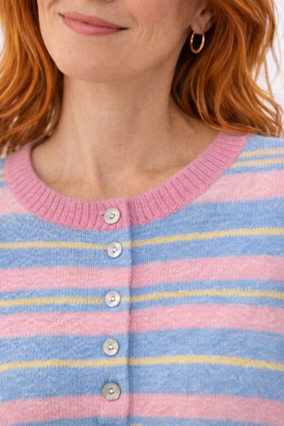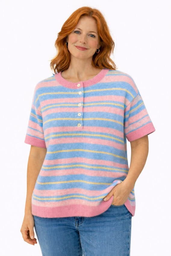 Add a touch of colour and comfort to your everyday wardrobe with this soft knitted stripe jumper. Designed with a classic round neckline, it features delicate pearl buttons running down the front half placket, adding a subtle feminine detail. The jumper is crafted in a beautifully soft knit with varying thickness stripes in pastel tones for a playful yet wearable look.