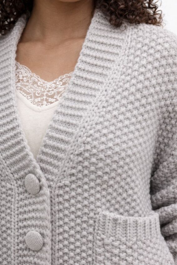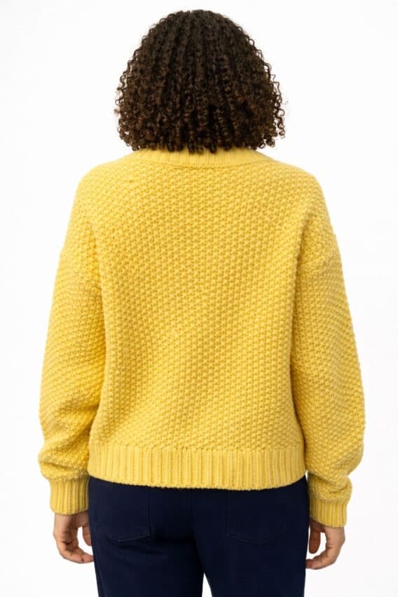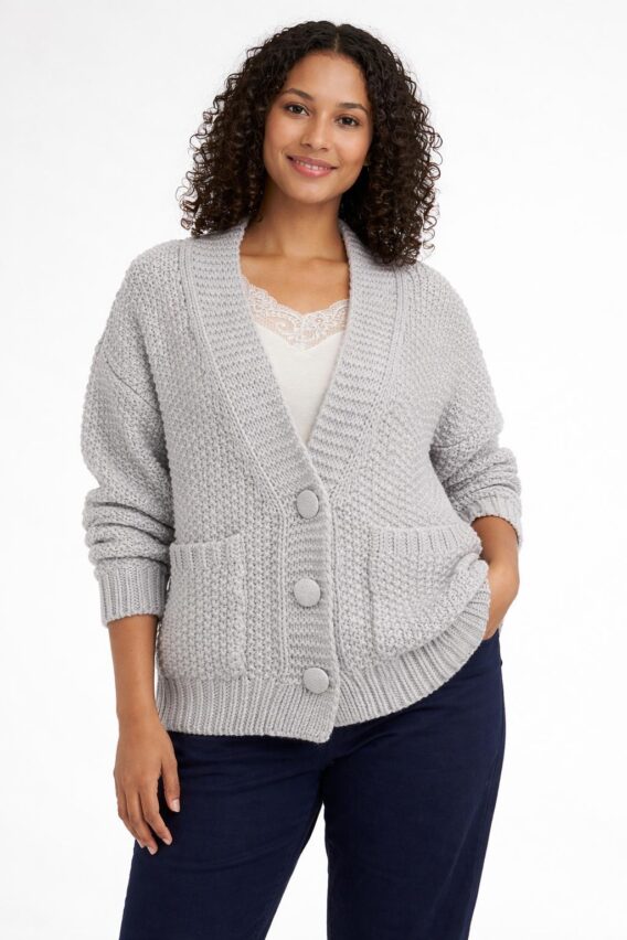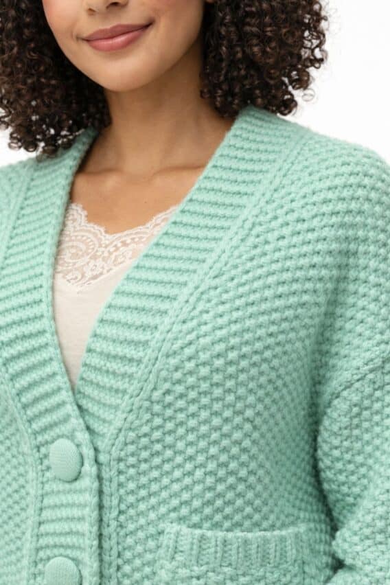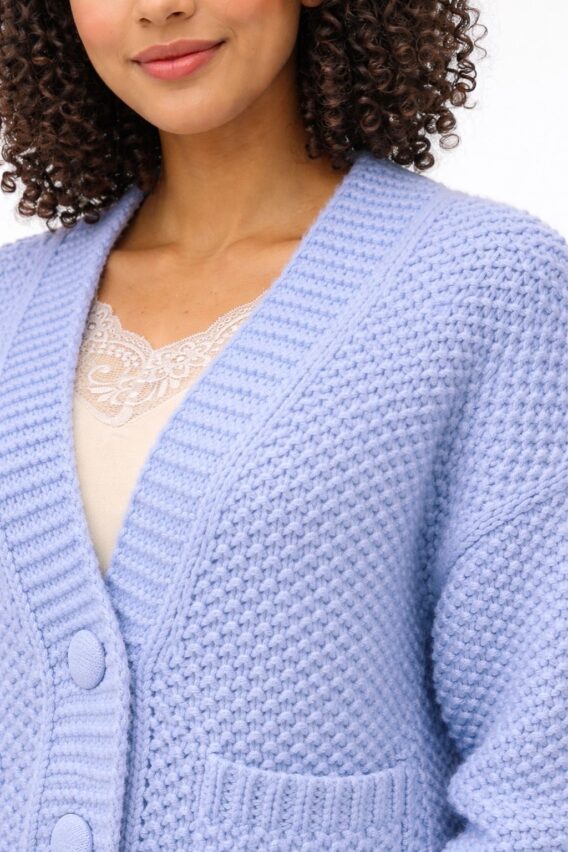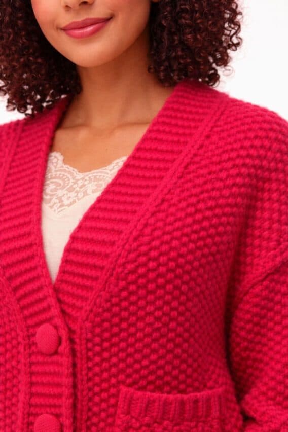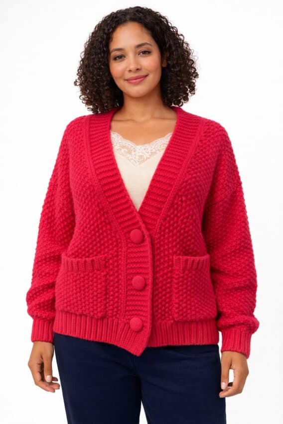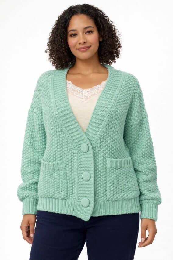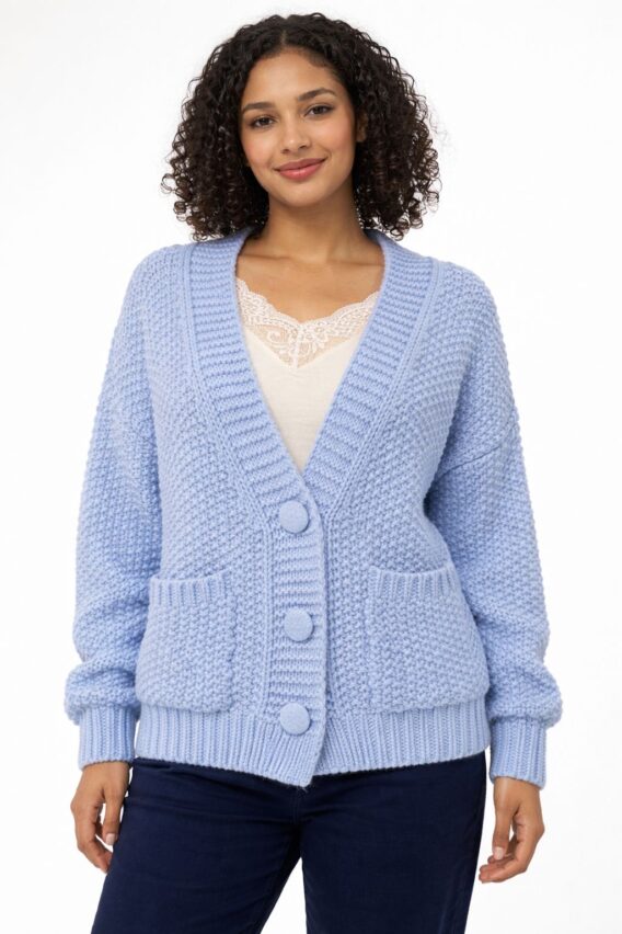 Add a fresh pop of colour to your wardrobe with this soft cardigan. Crafted in a chunky textured knit, it offers cosy warmth while maintaining a relaxed, stylish look. The classic V-neckline is framed with wide ribbed trim, complemented by ribbed cuffs and hem for added structure and shape. Featuring statement buttons and two front patch pockets, this cardigan blends practicality with effortless charm. Perfect for layering over tees, blouses, or dresses, it’s an easy everyday piece that brings comfort and colour to cooler spring days.