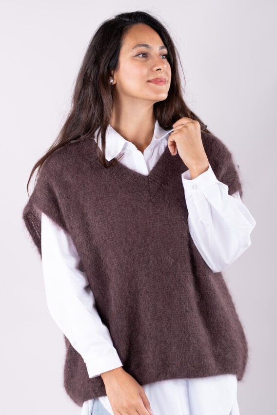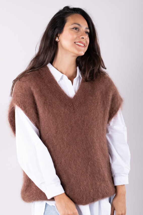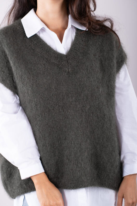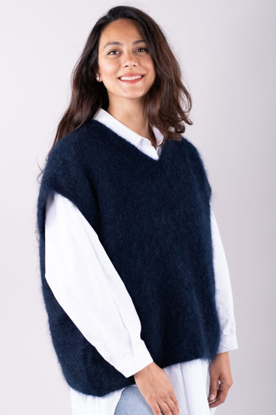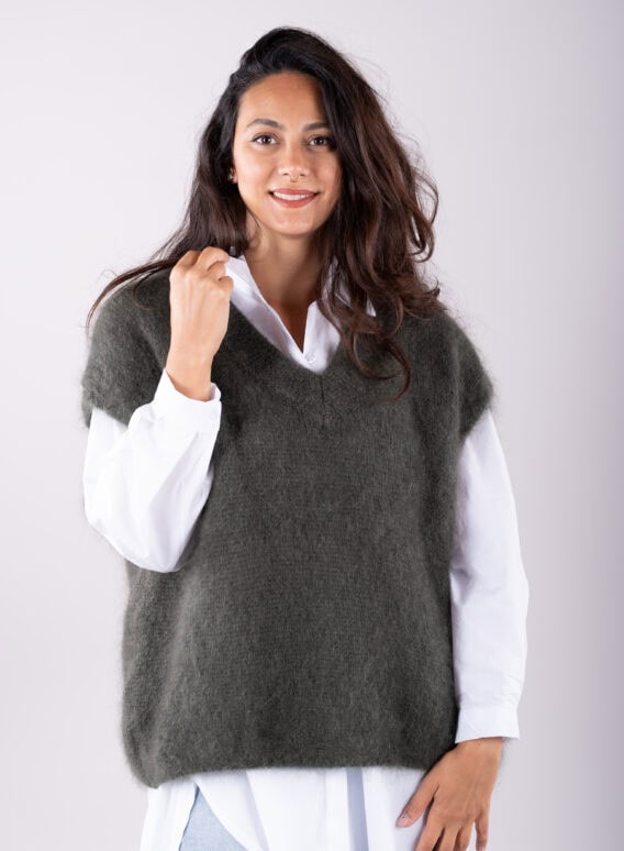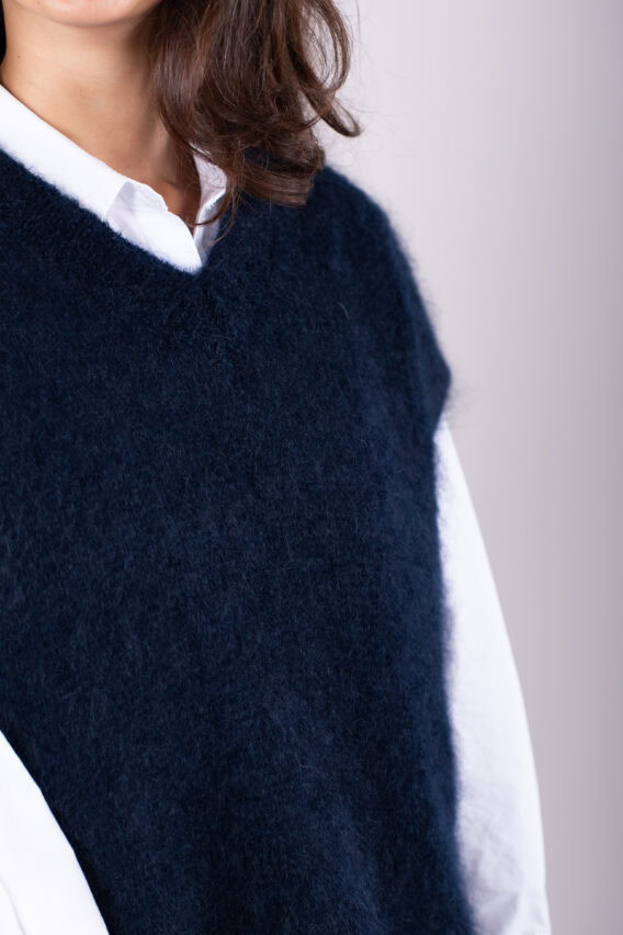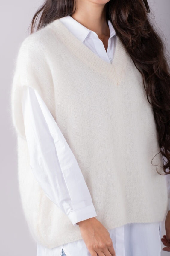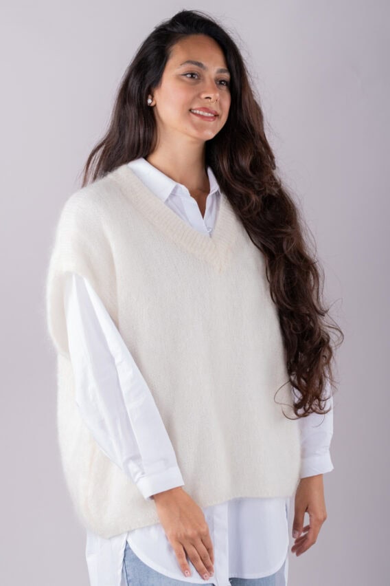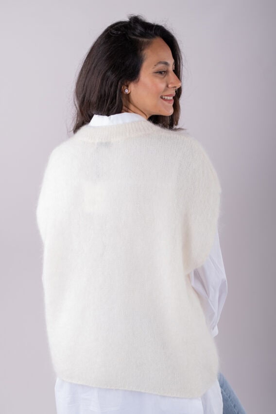This V-Neck jumper is the perfect addition to your autumn/winter wardrobe. Made from a luxurious Mohair Blend, it is soft and cozy, perfect for keeping you warm on colder days. The short drop sleeves add a stylish touch, while the ribbed detailing around the v neck adds a subtle texture. This jumper is a great layering piece and can be easily paired with our oversized cotton white shirt for a chic and effortless look. Stay stylish and comfortable all season long with this versatile and fashionable jumper.