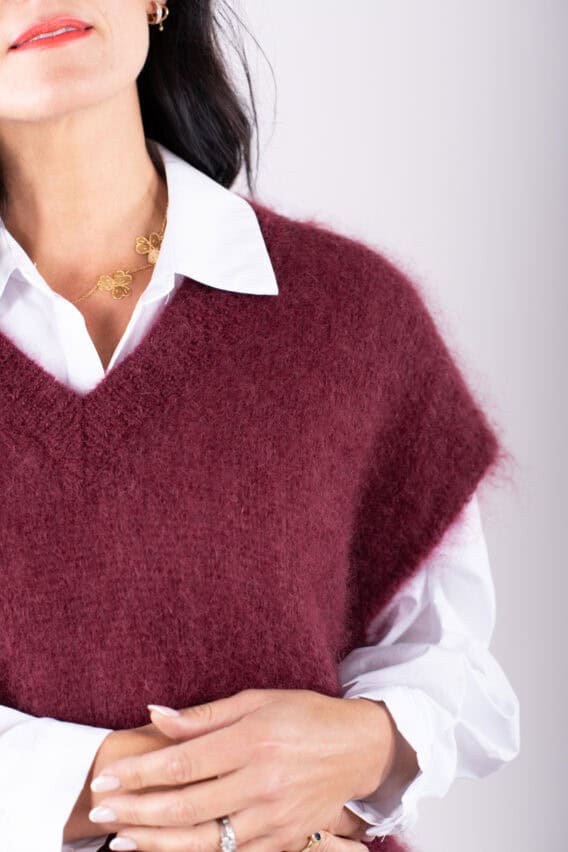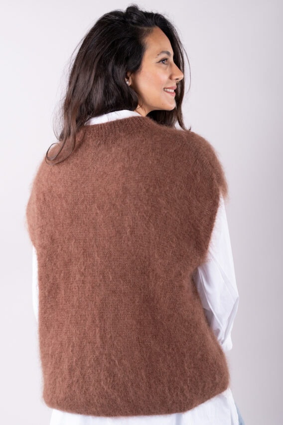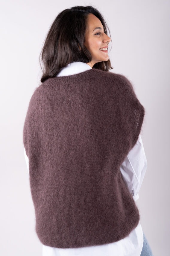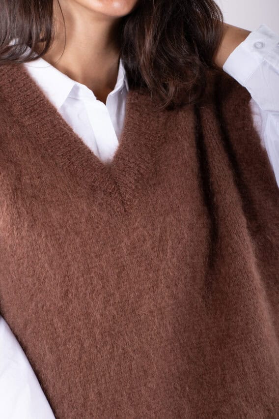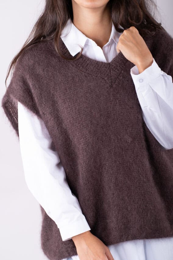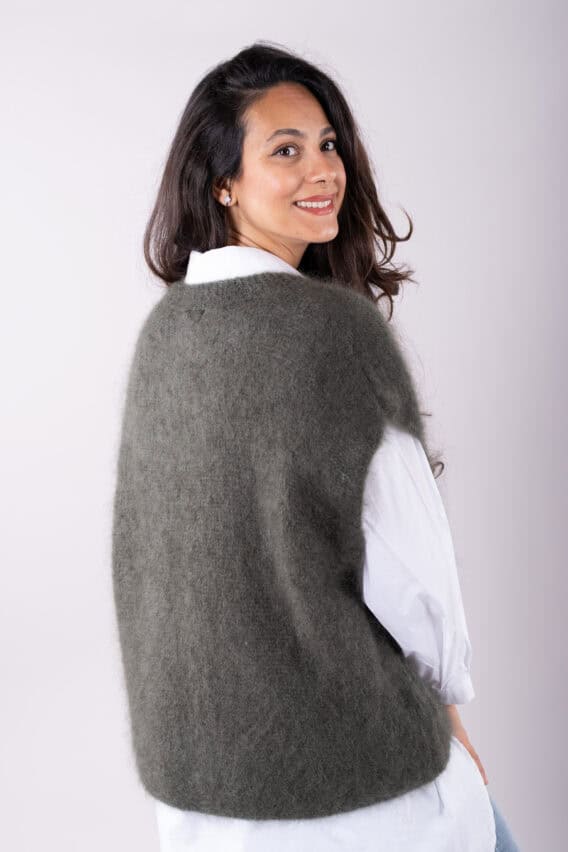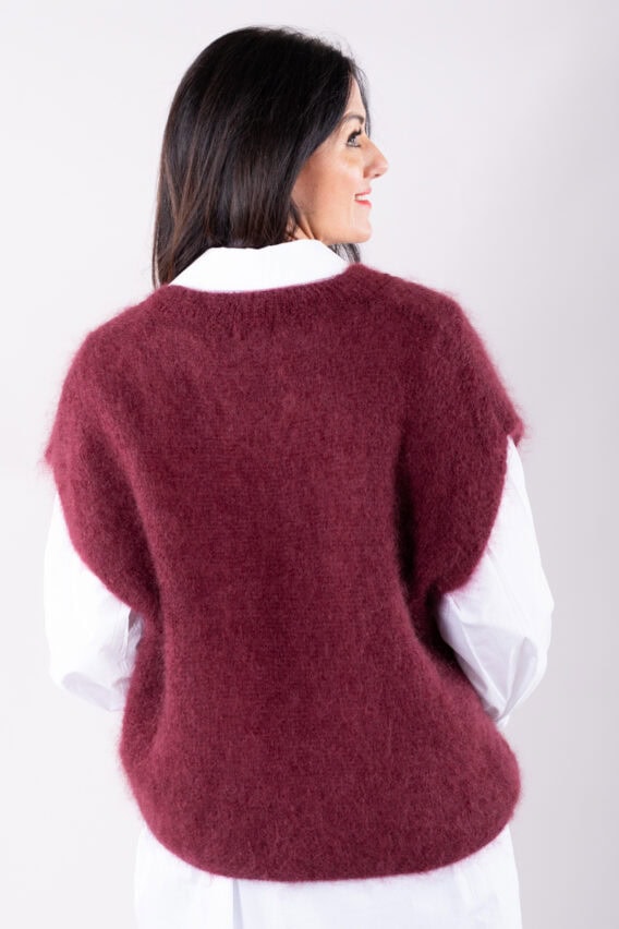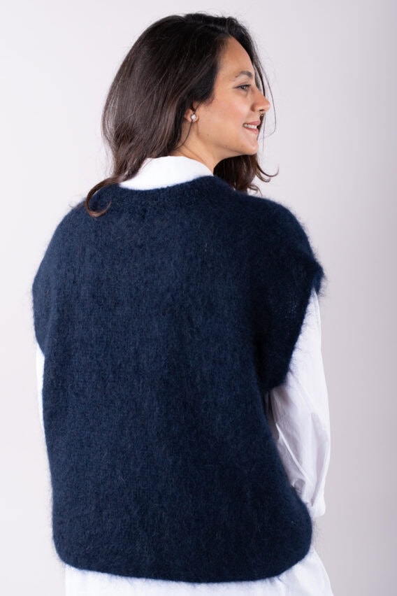 This V-Neck jumper is the perfect addition to your autumn/winter wardrobe. Made from a luxurious Mohair Blend, it is soft and cozy, perfect for keeping you warm on colder days. The short drop sleeves add a stylish touch, while the ribbed detailing around the v neck adds a subtle texture. This jumper is a great layering piece and can be easily paired with our oversized cotton white shirt for a chic and effortless look. Stay stylish and comfortable all season long with this versatile and fashionable jumper.