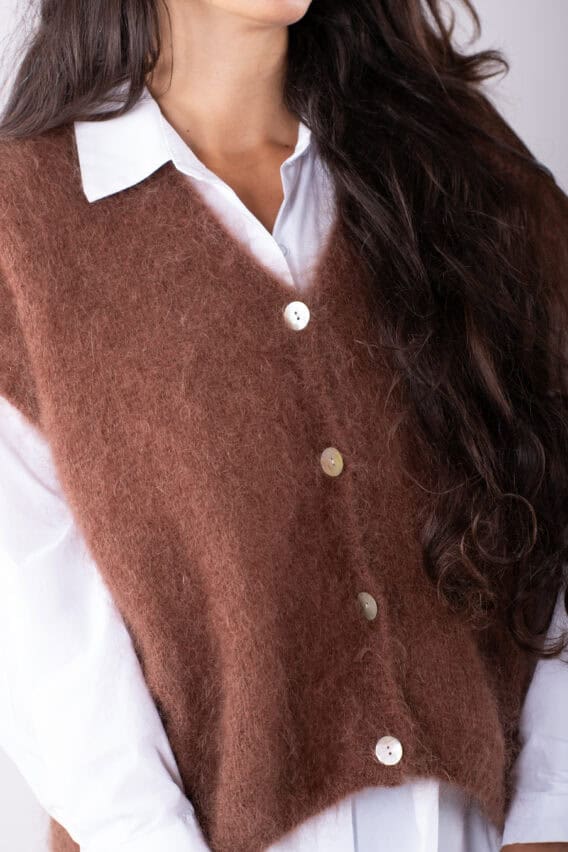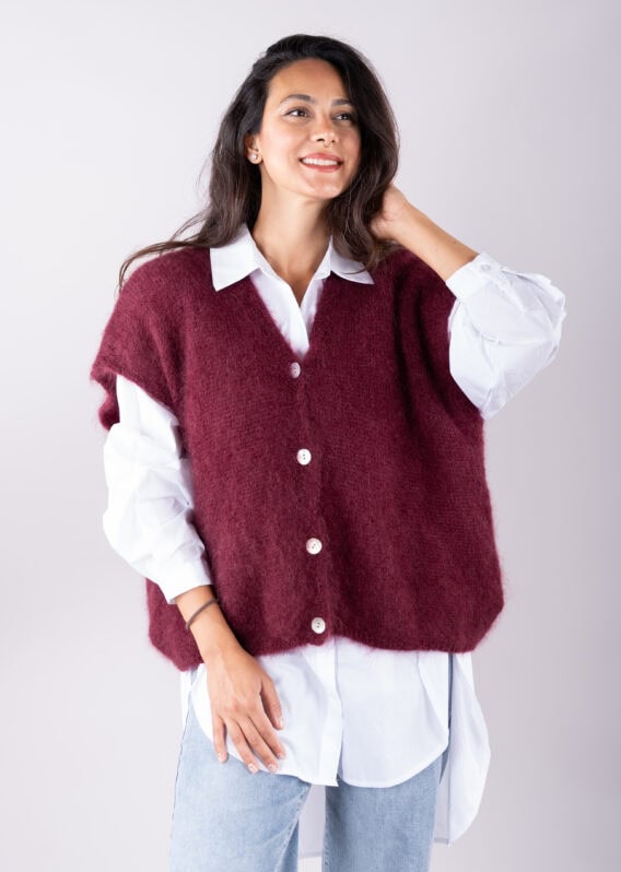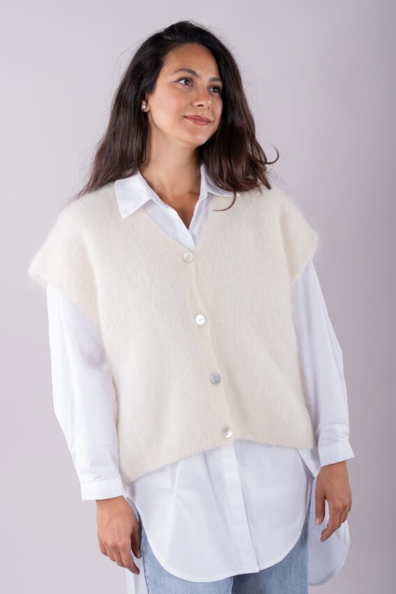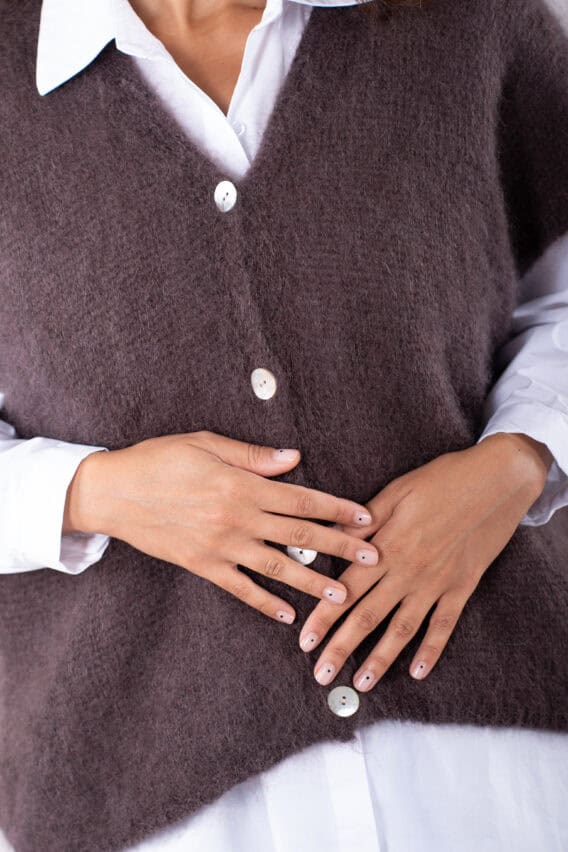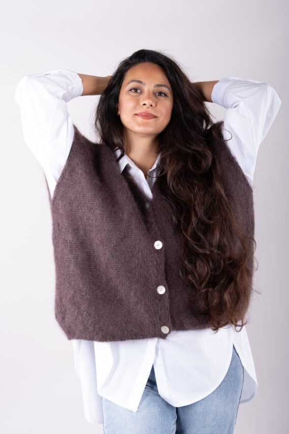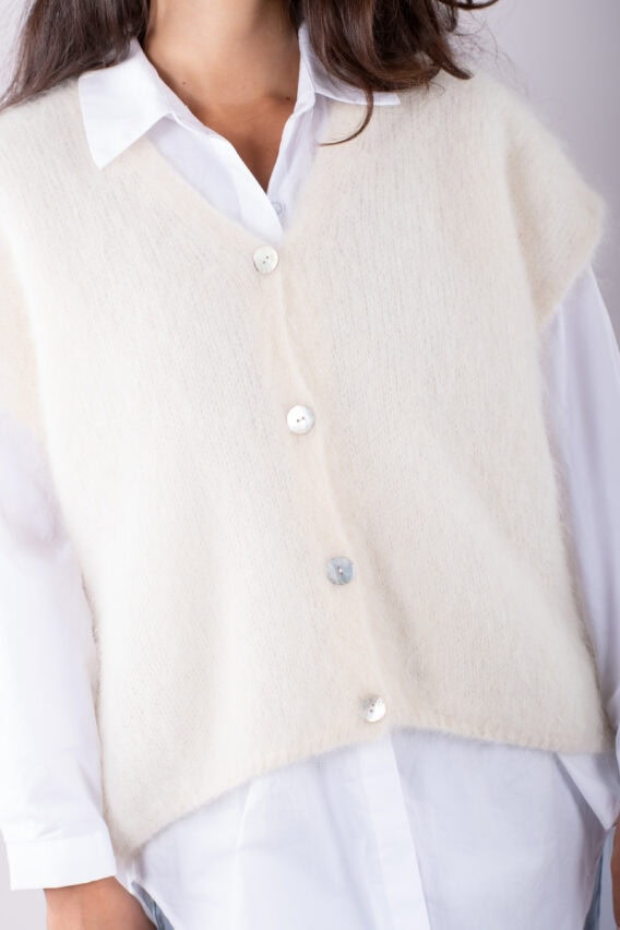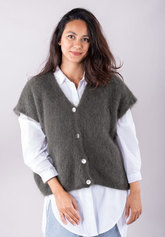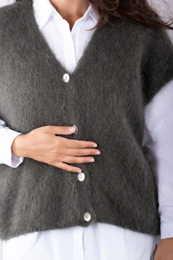 Indulge in luxury with this exquisite V-Neck cardigan crafted from a sumptuous Mohair blend. The pearl button detailing adds a touch of elegance, while the short drop batwing sleeves give it a modern twist. This versatile piece is perfect for layering during the autumn and winter months, and looks effortlessly chic when paired with our oversized cotton white shirt. Stay cozy and stylish in this must-have wardrobe staple.