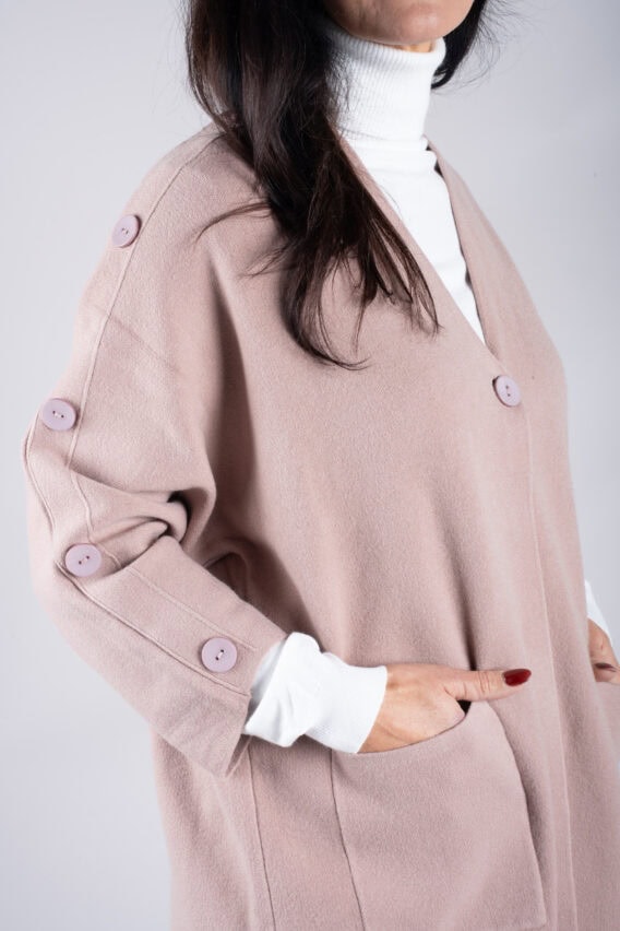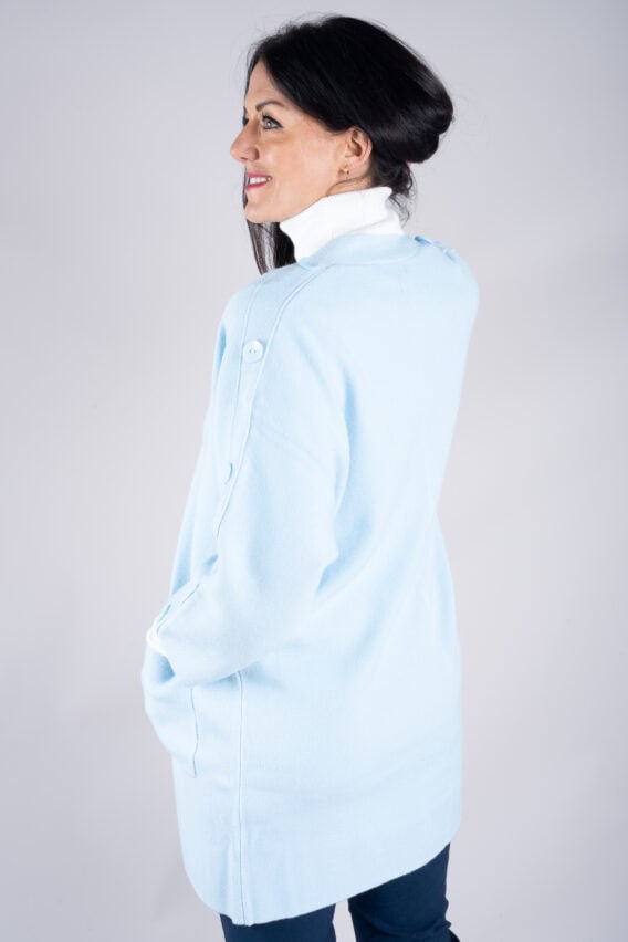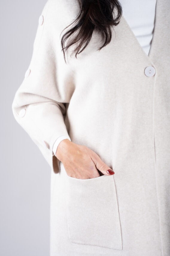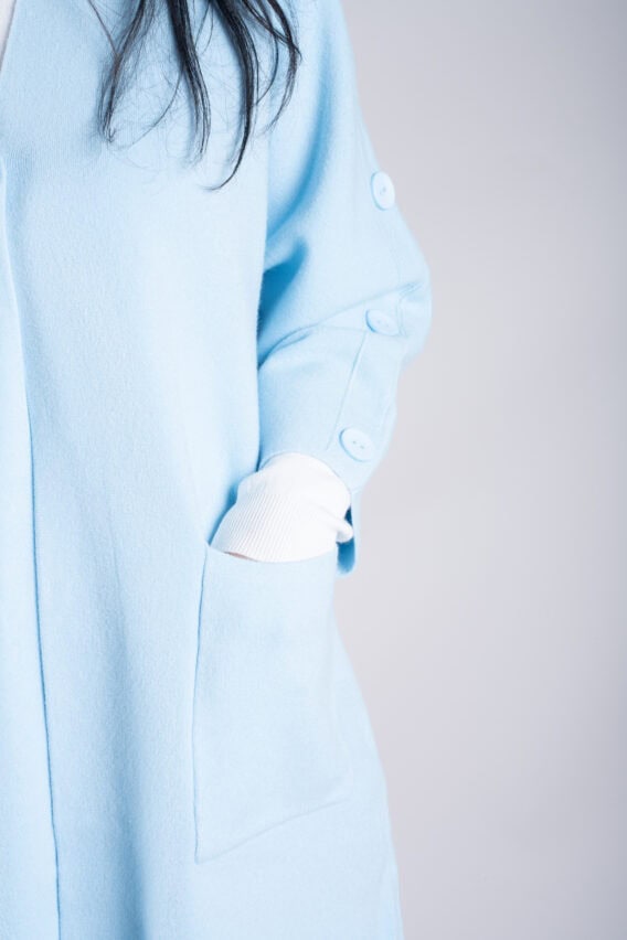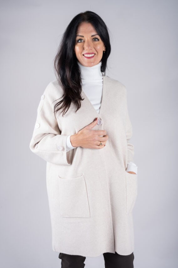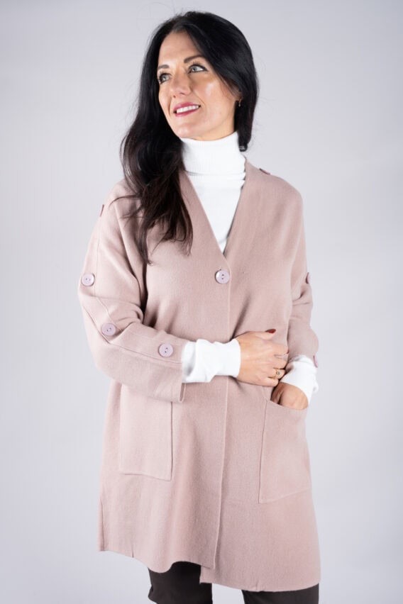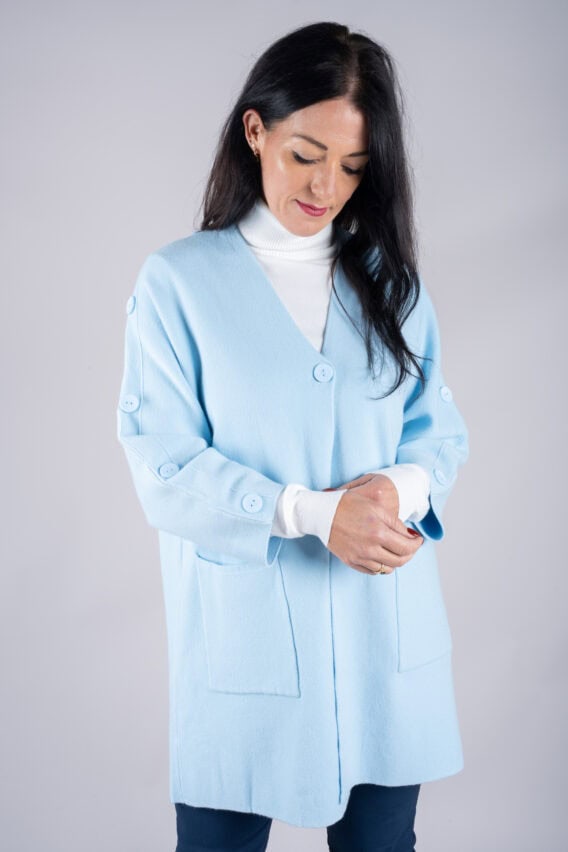 This V-Neck Cardigan is a versatile and stylish addition to your wardrobe. It features front pockets for added convenience, with one button for fastening at the front. The buttons down the sleeve add a unique and eye-catching feature, while the full length sleeves provide warmth and comfort. Perfect for layering over your favourite tops for a chic and polished look.