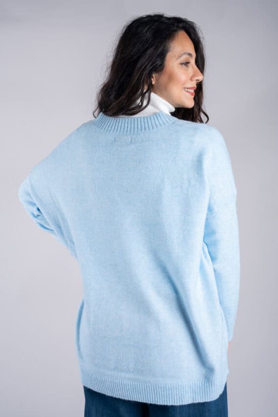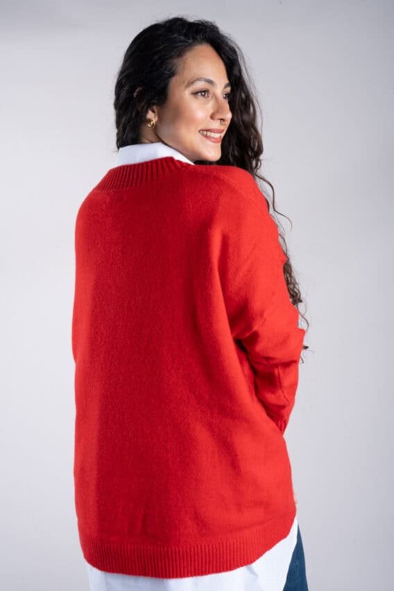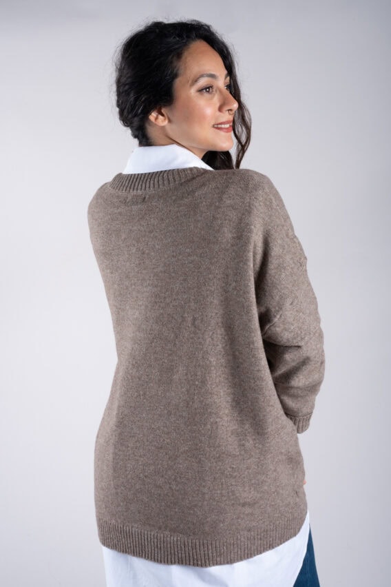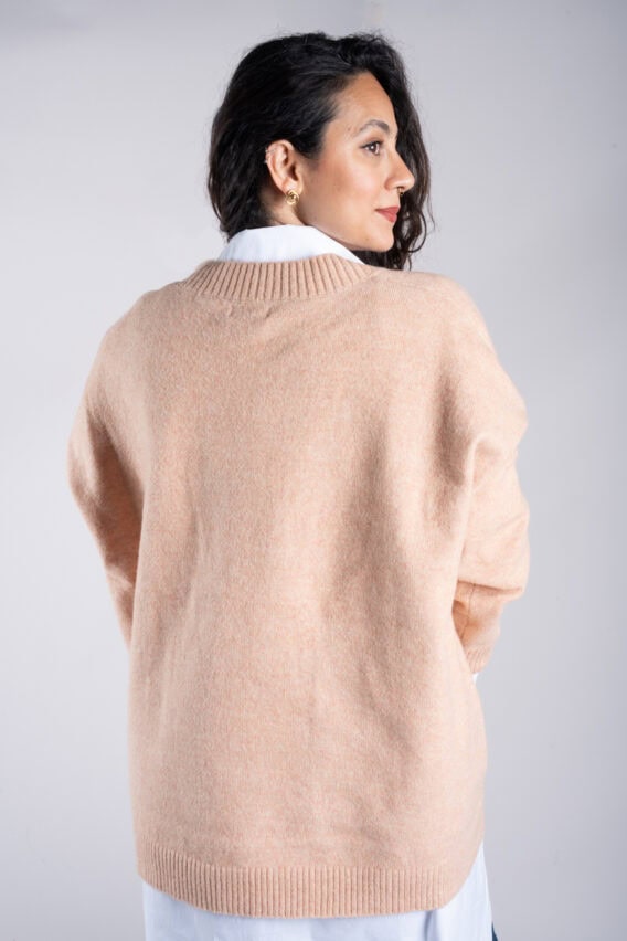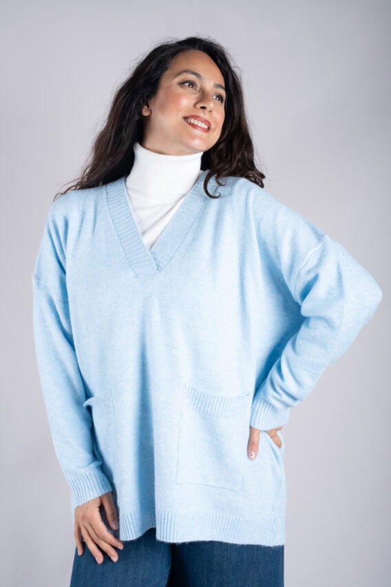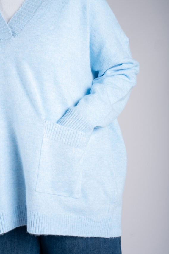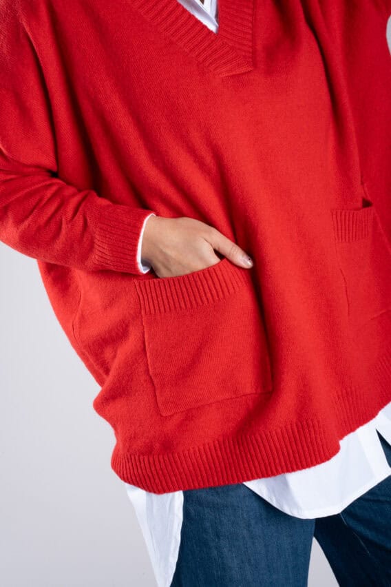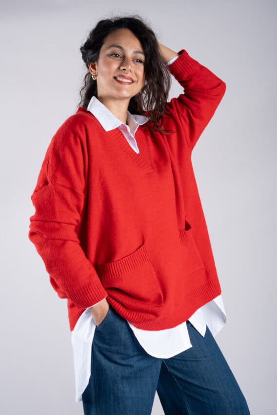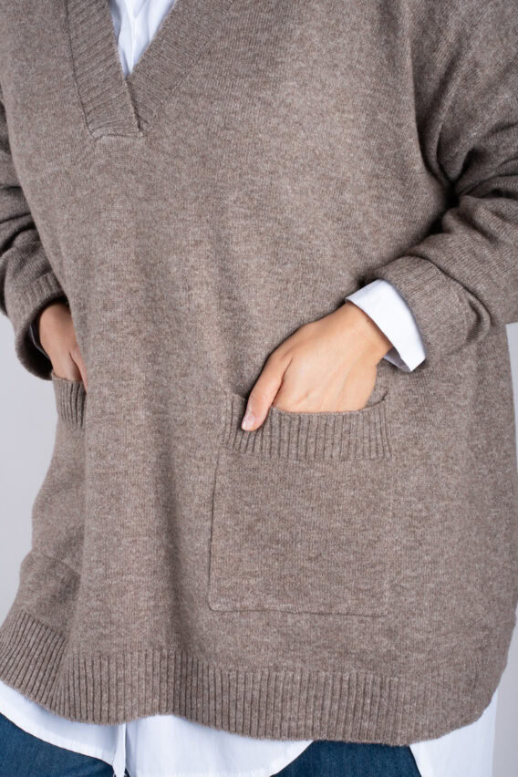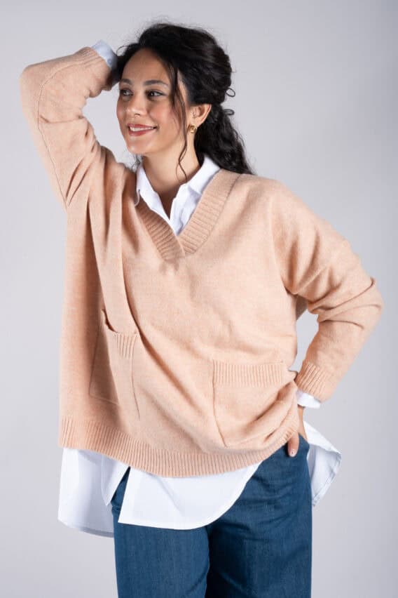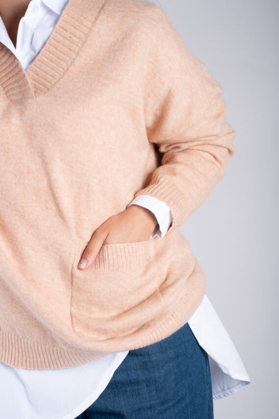 Stay warm and stylish in this V-Neck Knit Jumper with Two Front Pockets. Made from a soft fabric, this jumper features ribbed neck, hem, and cuffs for added texture and detail. The full-length sleeves provide extra warmth, while the two front pockets add a practical touch. Perfect for layering over our oversized white cotton shirt for a polished look.