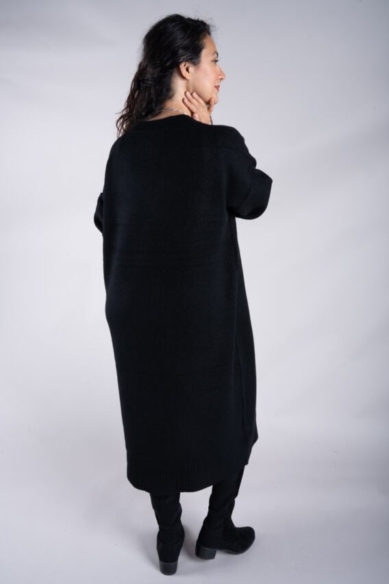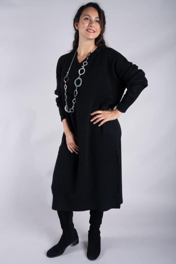 This V-Neck Long Knit Jumper Dress is the perfect combination of cosy and stylish. The ribbed hem, neckline, and cuffs add a touch of texture and detail to the classic silhouette. Pair it with tights and boots for a chic and comfortable look that is perfect for the colder months.