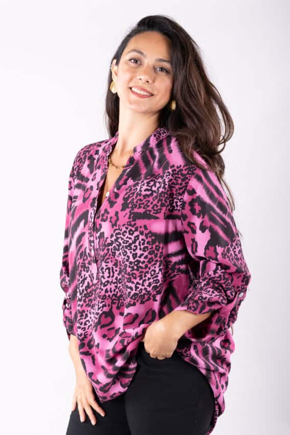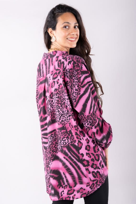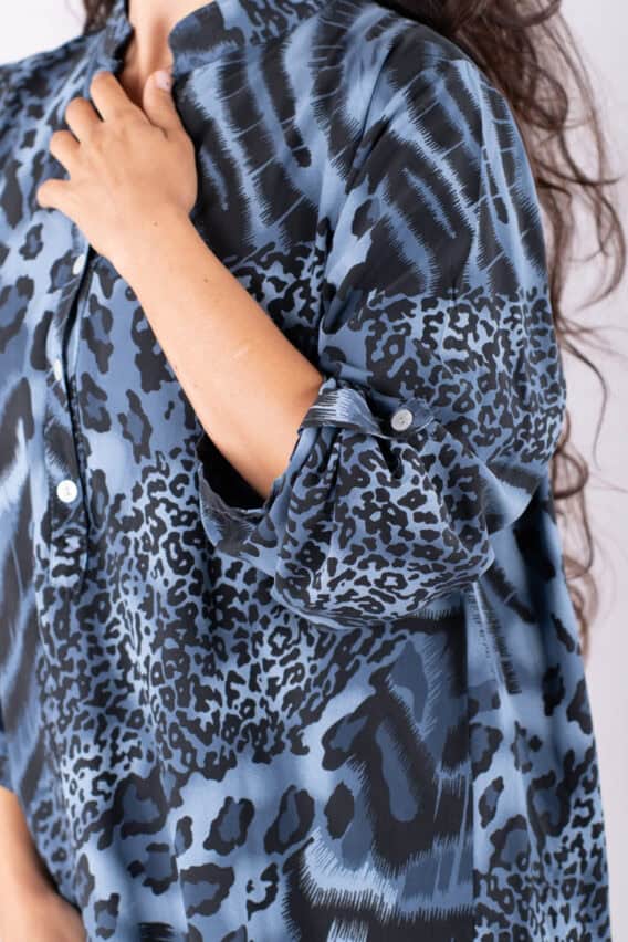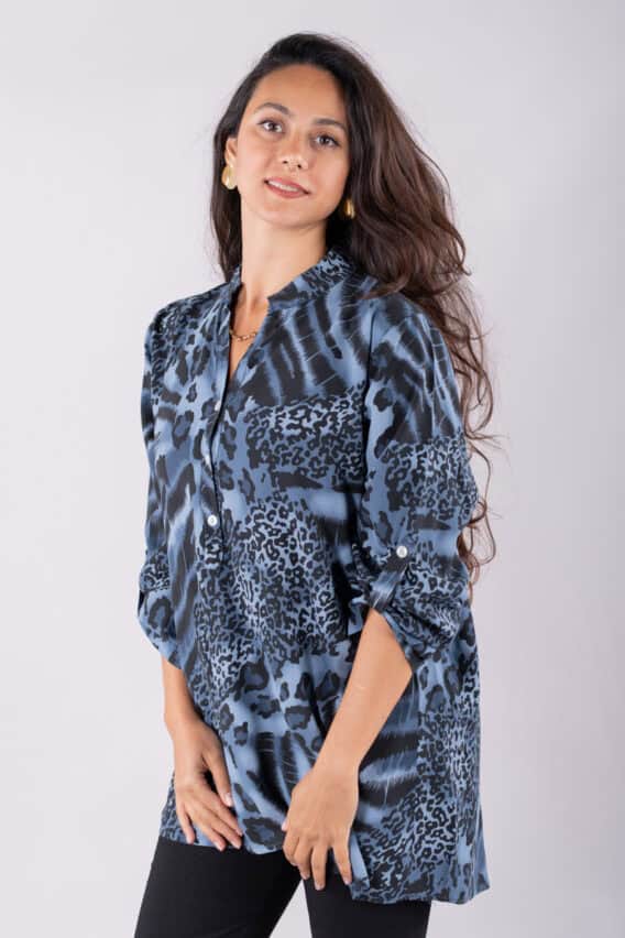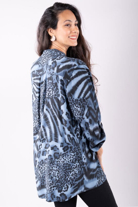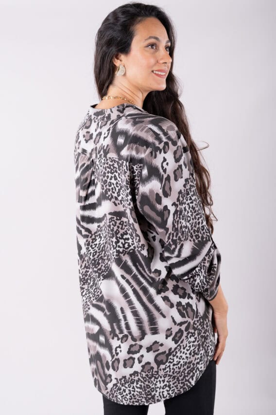 This trendy V-Neck top features a striking zebra and leopard print design, perfect for making a bold statement. The grandad collar adds a touch of sophistication, while the button tab adjustable sleeves allow for versatile styling options. The 3 pearl buttons half way down the front add a touch of elegance, and the rounded hem creates a flattering silhouette. With a longer back than front, this top is both stylish and comfortable, making it a must-have addition to your wardrobe.