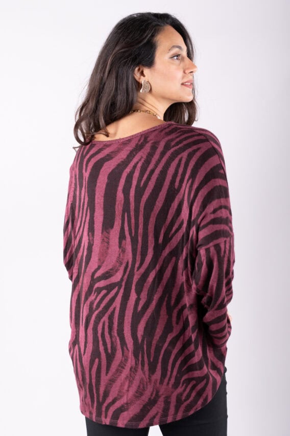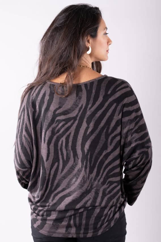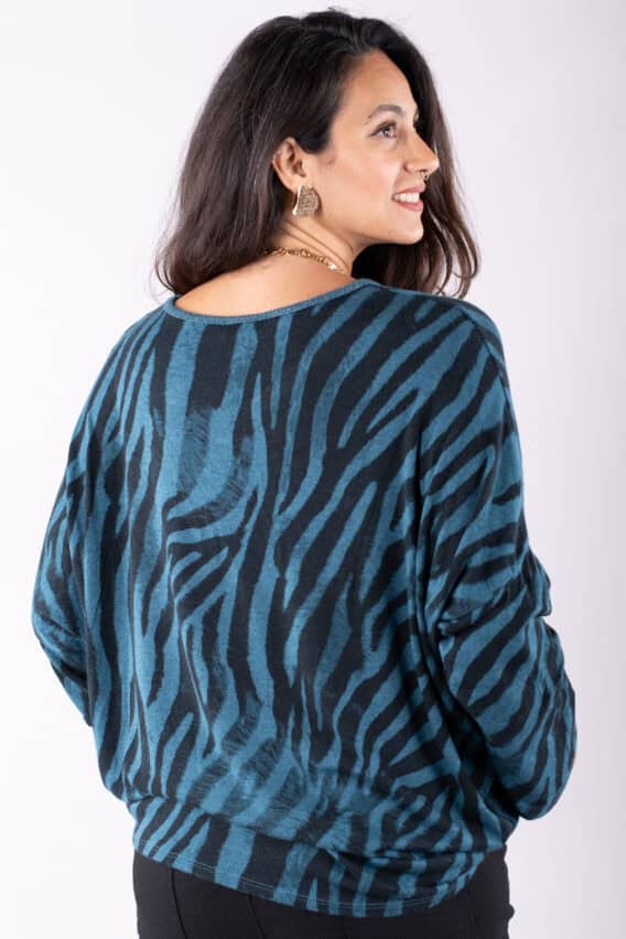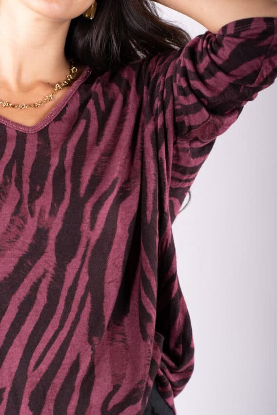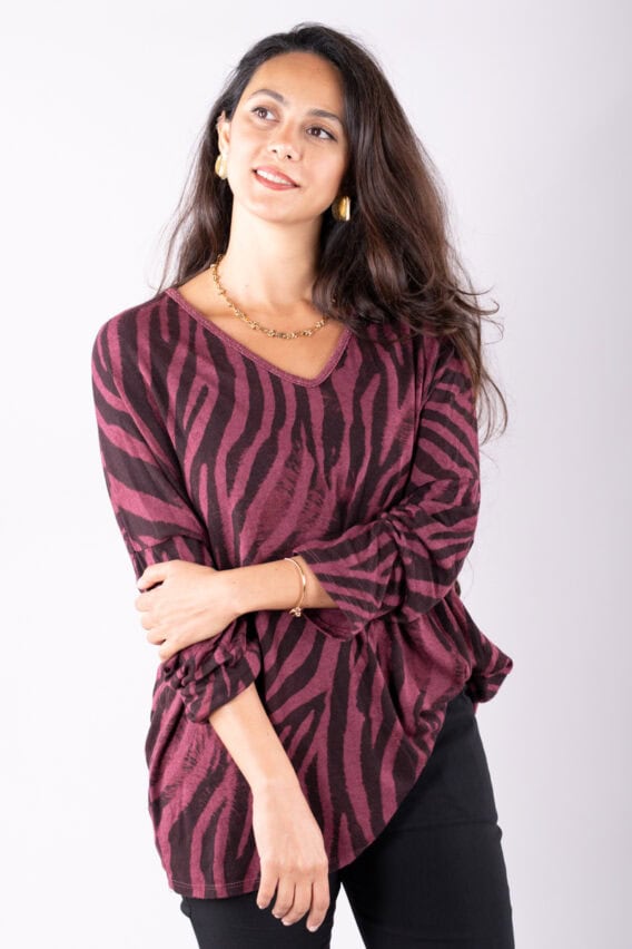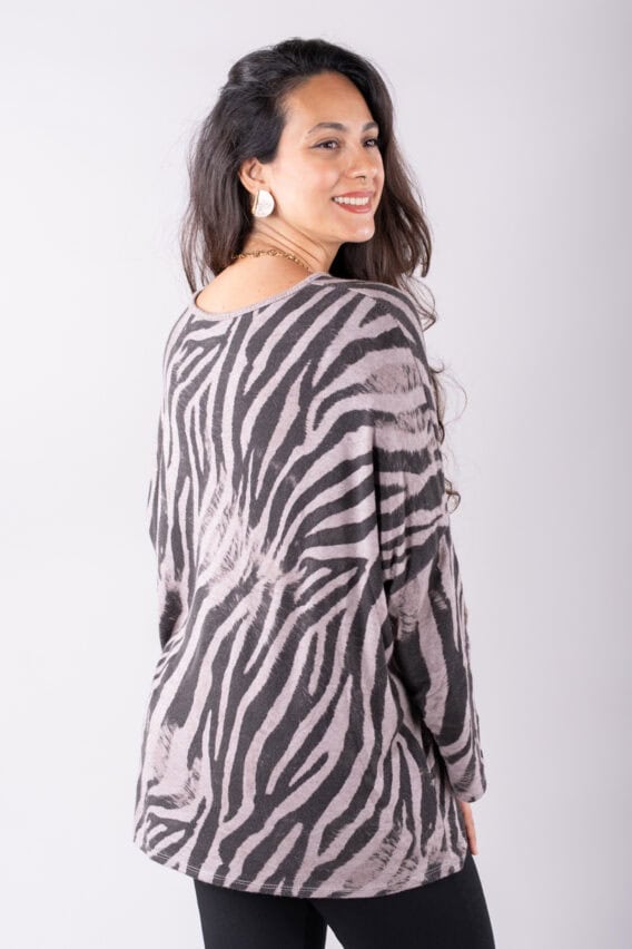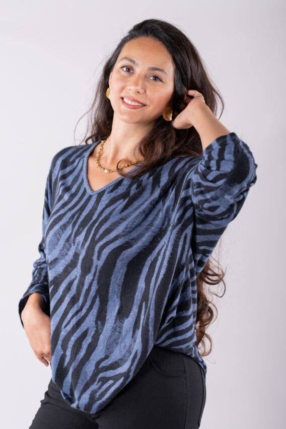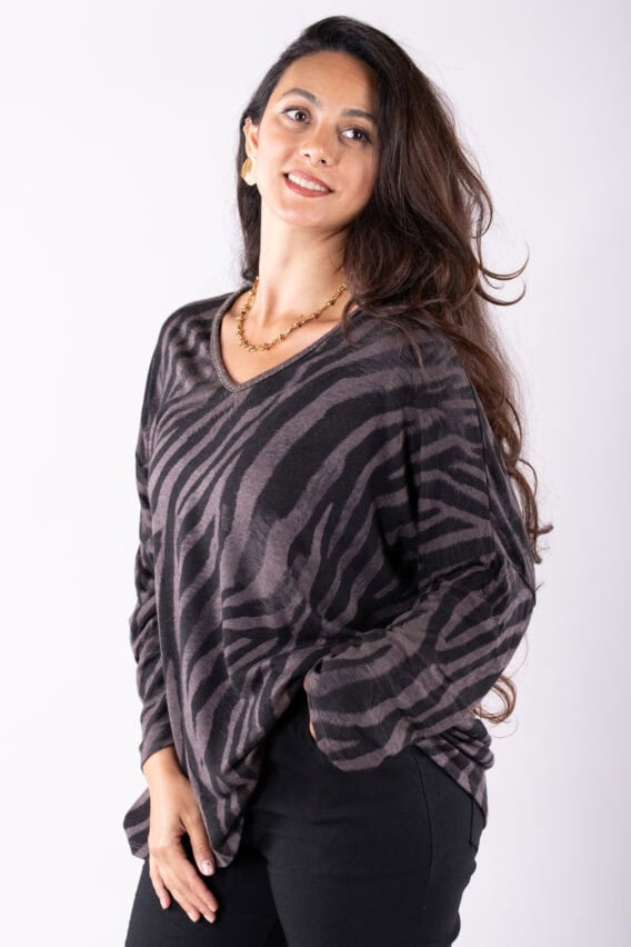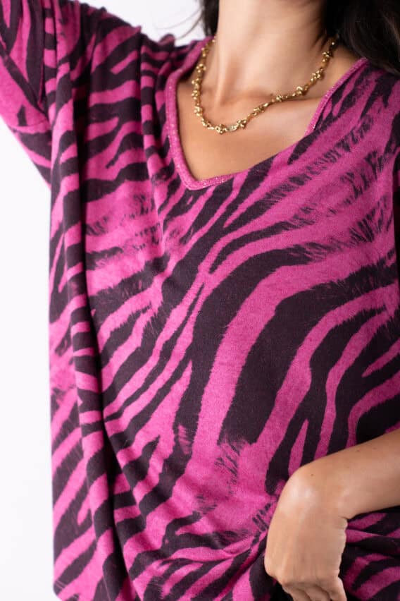 This V-Neck Zebra Print Longline Top is the perfect combination of style and comfort. Made from soft knit fabric, this top features a trendy zebra print pattern that adds a touch of fun to your outfit. The sparkly detail around the neckline adds a touch of glamour, while the full-length drop sleeves keep you warm and cozy. This top is perfect for everyday wear, whether you’re running errands or lounging at home. Stay stylish and comfortable in this versatile and chic top.