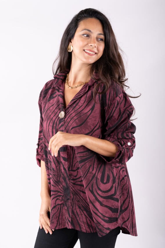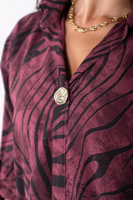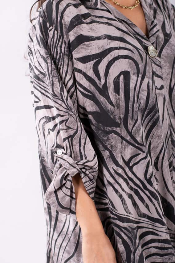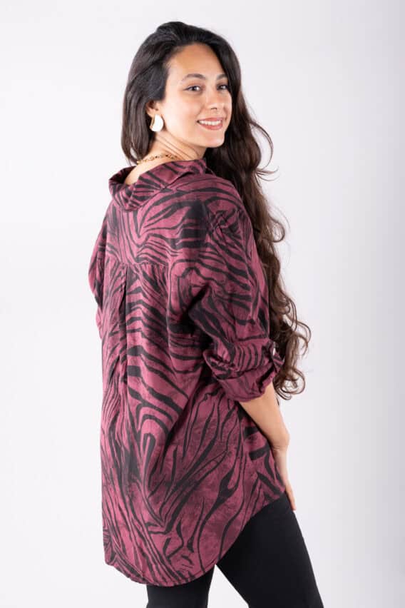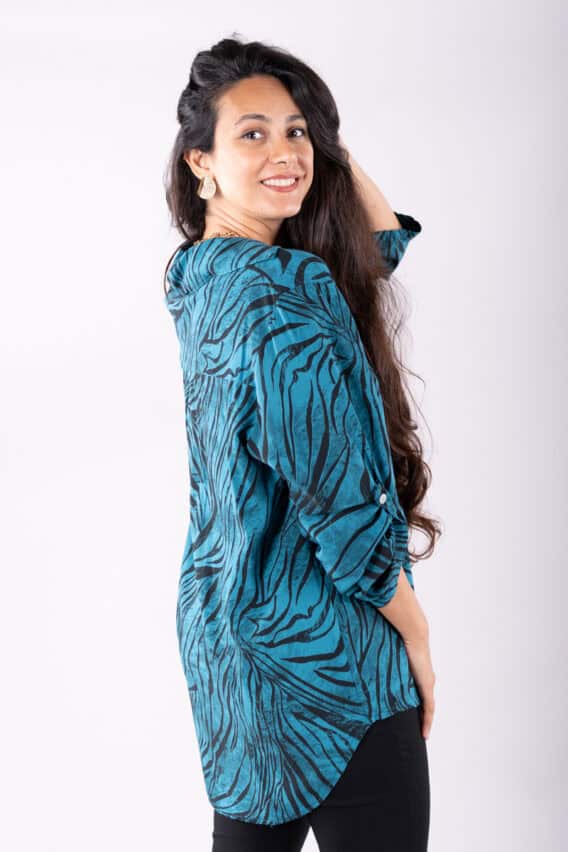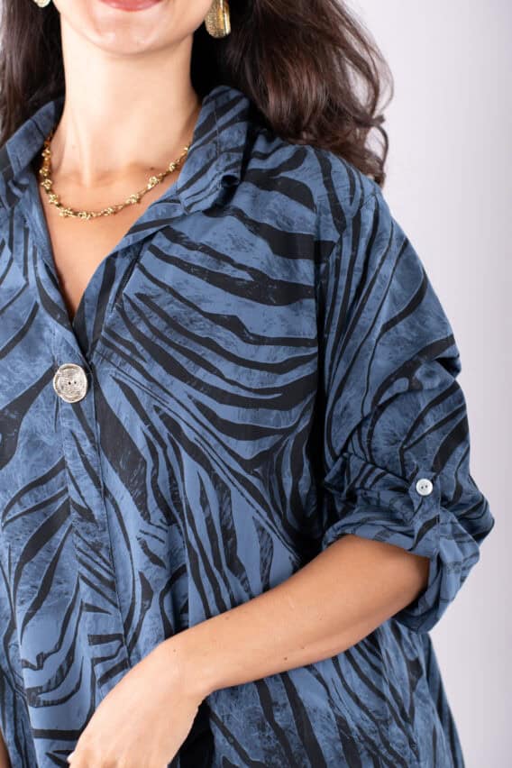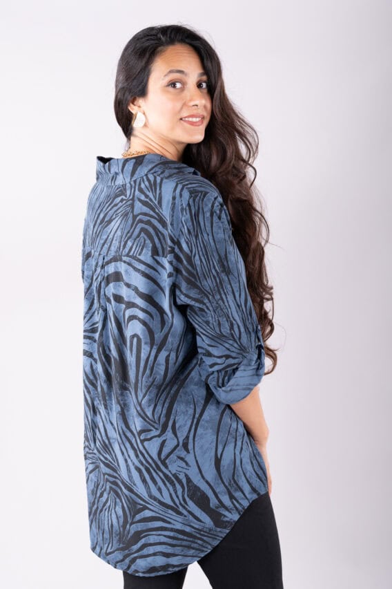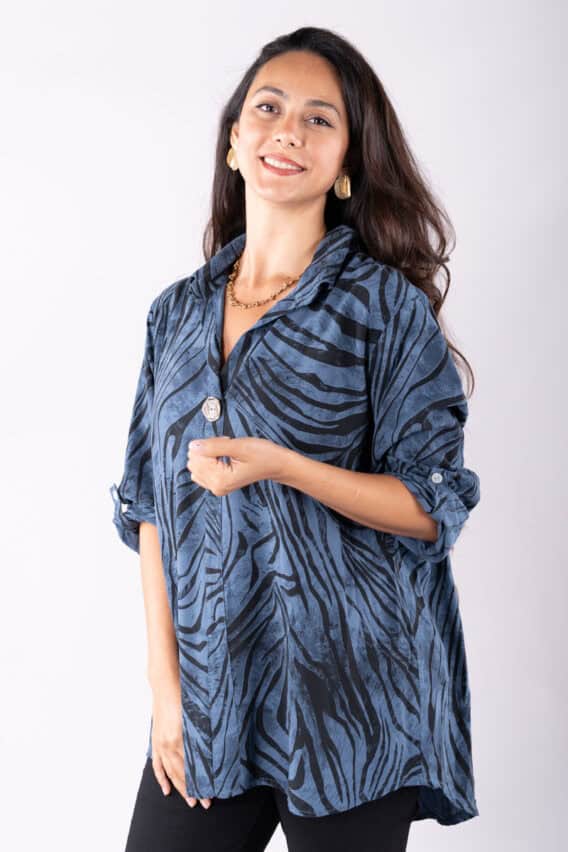 This V-Neck Zebra Print Top is a stylish and eye-catching piece for your wardrobe. The top features a collar and adjustable button tab full-length sleeves for a versatile look. The front is adorned with gold feature buttons for a touch of elegance. The top has a longer back than front with a curved hem, adding a modern twist to the classic silhouette. Perfect for adding a bold and trendy touch to your outfit.