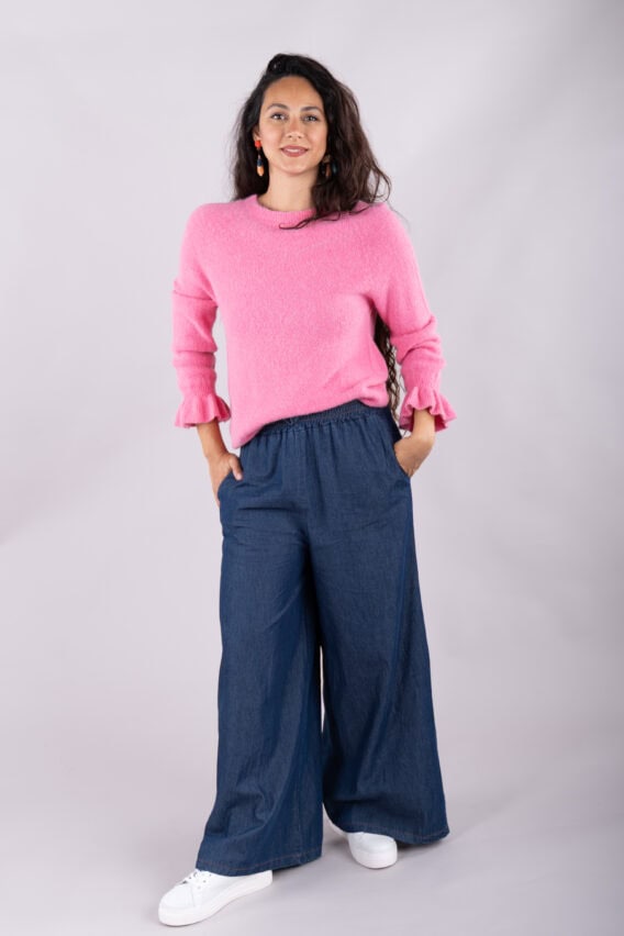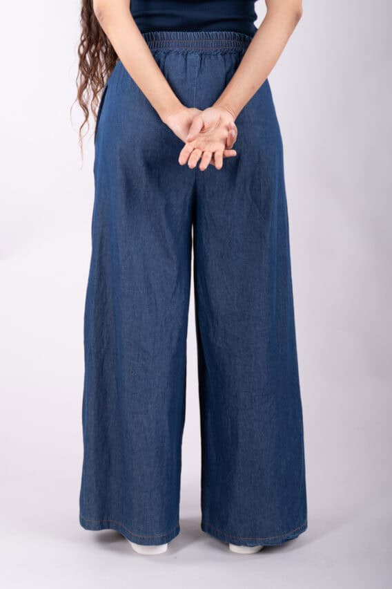 Wide Leg Denim Cotton Trousers With Elasticated Waistband