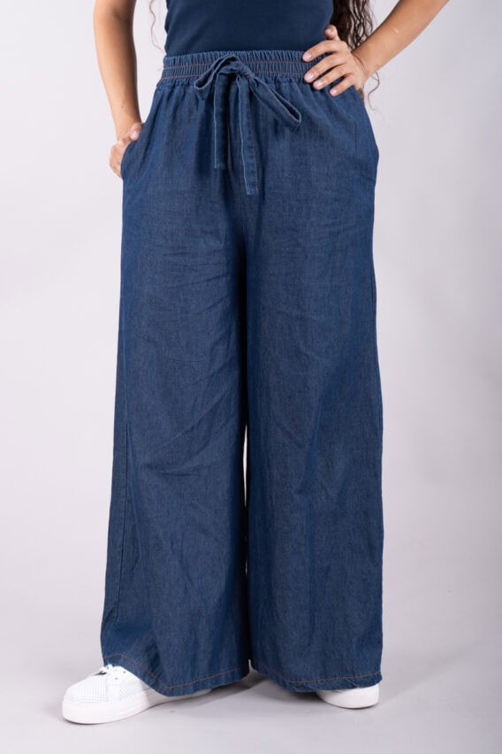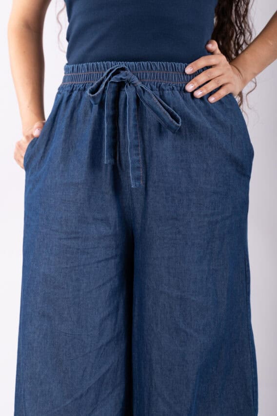 These dark denim blue wide leg trousers are perfect for a casual everyday look in the autumn season. The elasticated waistband ensures a comfortable fit, while the feature tie adds a stylish detail. Pair them with a cozy sweater and boots for a chic and effortless outfit.